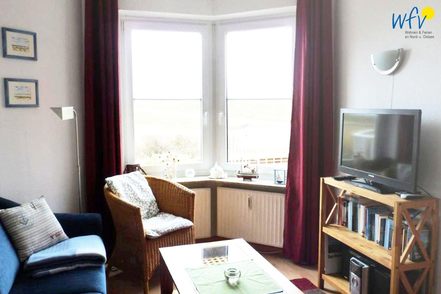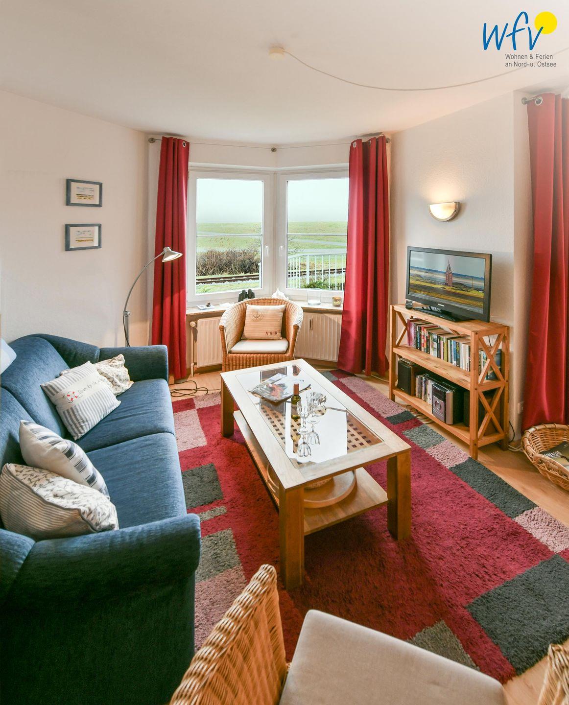 Die bequeme Sitzecke mit Couch, Sessel und TV sowie DVD-Player/DVD`s, Blu-ray-Player und kleiner HiFi-Anlage ist ein gemütlicher Platz zum Ausspannen, Fernsehen oder Musik hören. Zum Surfen vom Smartphone aus empfangen Sie freies WLAN. Auch die sehr schöne Aussicht auf den Deich lässt ein herrliches Urlaubsgefühl aufkommen!