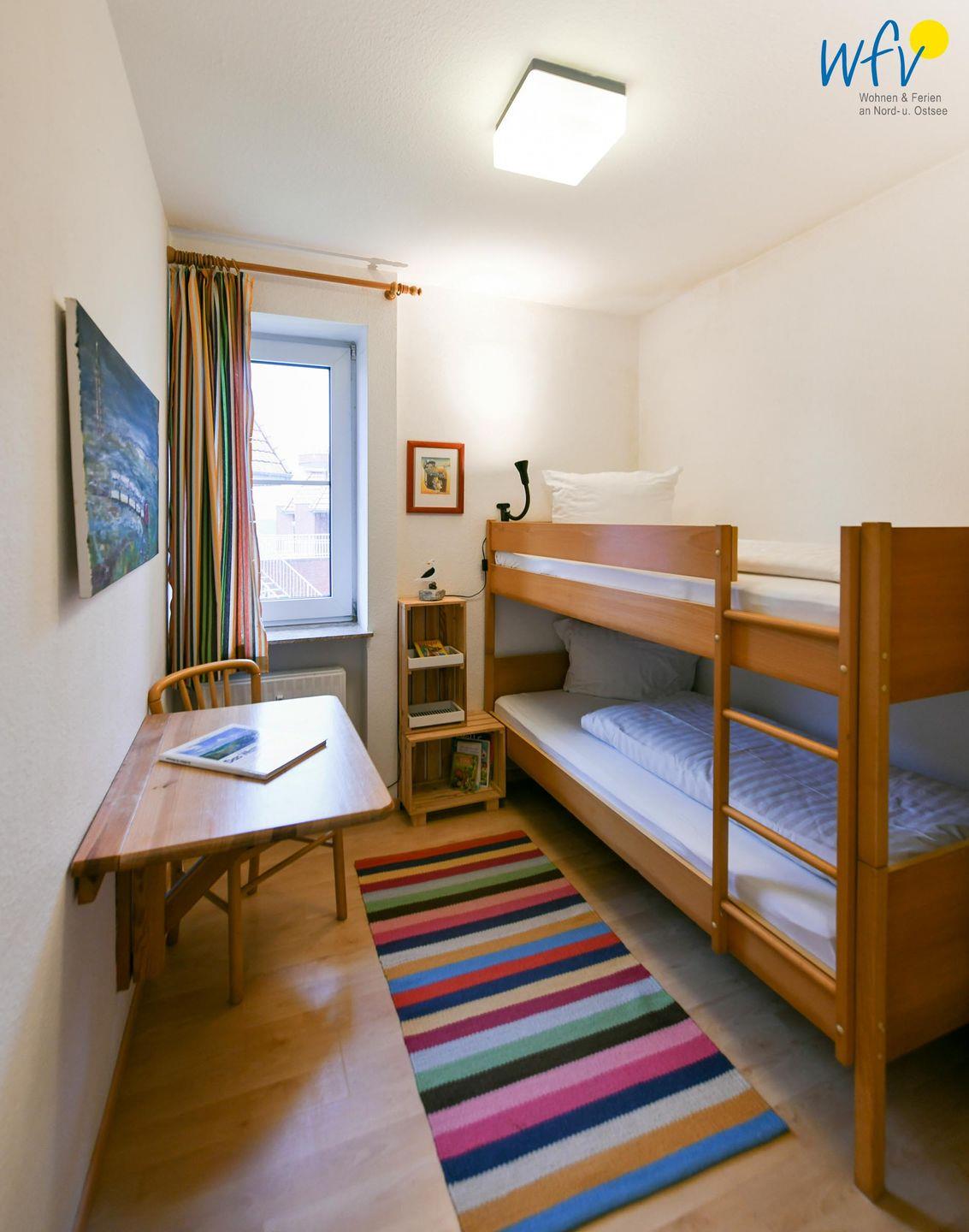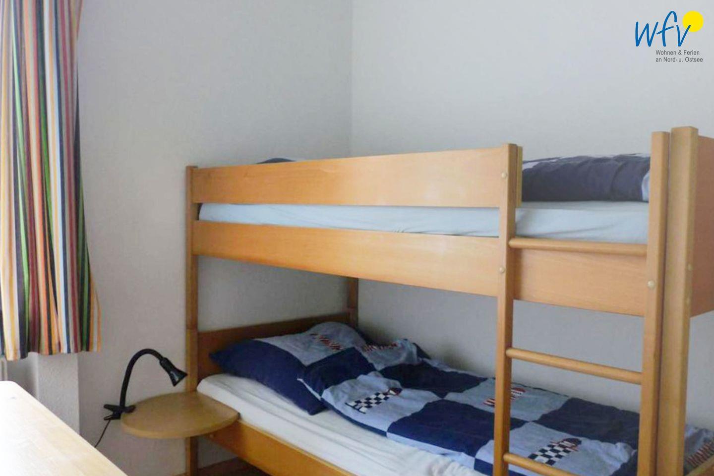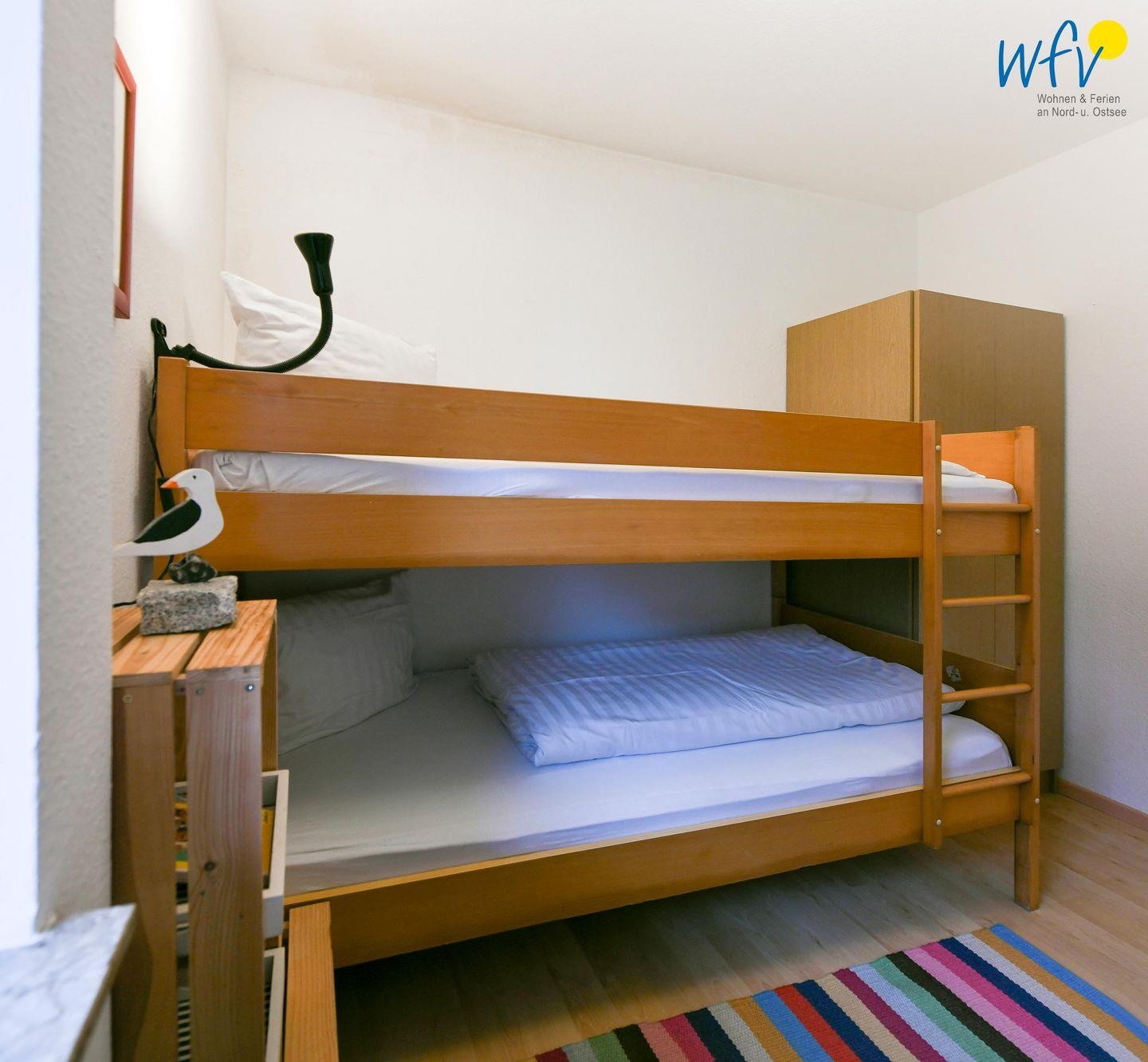 Die zwei separaten Schlafzimmer teilen sich in Eltern- und Kinderschlafzimmer auf. In dem einen Raum befindet sich ein Doppelbett, in dem anderen ein Etagenbett. Kleiderschränke bieten jeweils Platz für die Urlaubsgarderobe. Ein Babybett gehört zum festen Inventar der Wohnung.