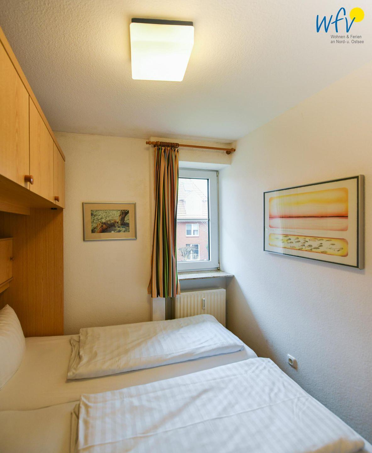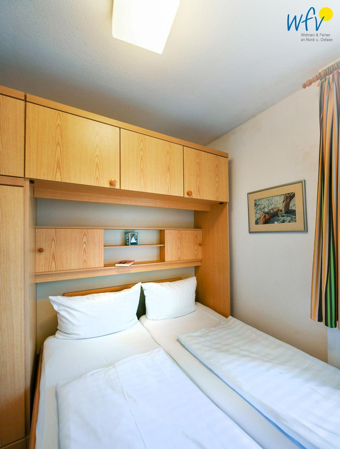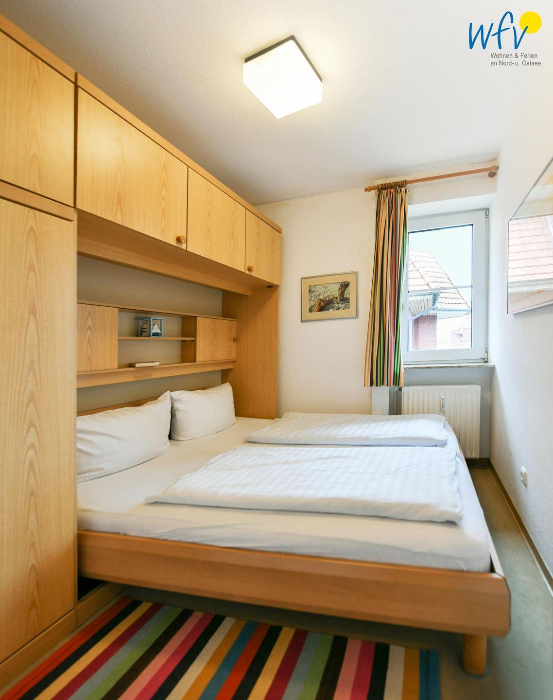 Die zwei separaten Schlafzimmer teilen sich in Eltern- und Kinderschlafzimmer auf. In dem einen Raum befindet sich ein Doppelbett, in dem anderen ein Etagenbett. Kleiderschränke bieten jeweils Platz für die Urlaubsgarderobe. Ein Babybett gehört zum festen Inventar der Wohnung.