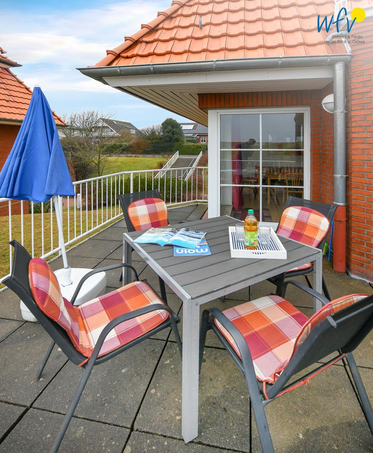Gemütliche Ferienwohnung auf Wangerooge mit Südbalkon und Blick auf den Deich, ideal für Familienurlaub an der Nordsee.