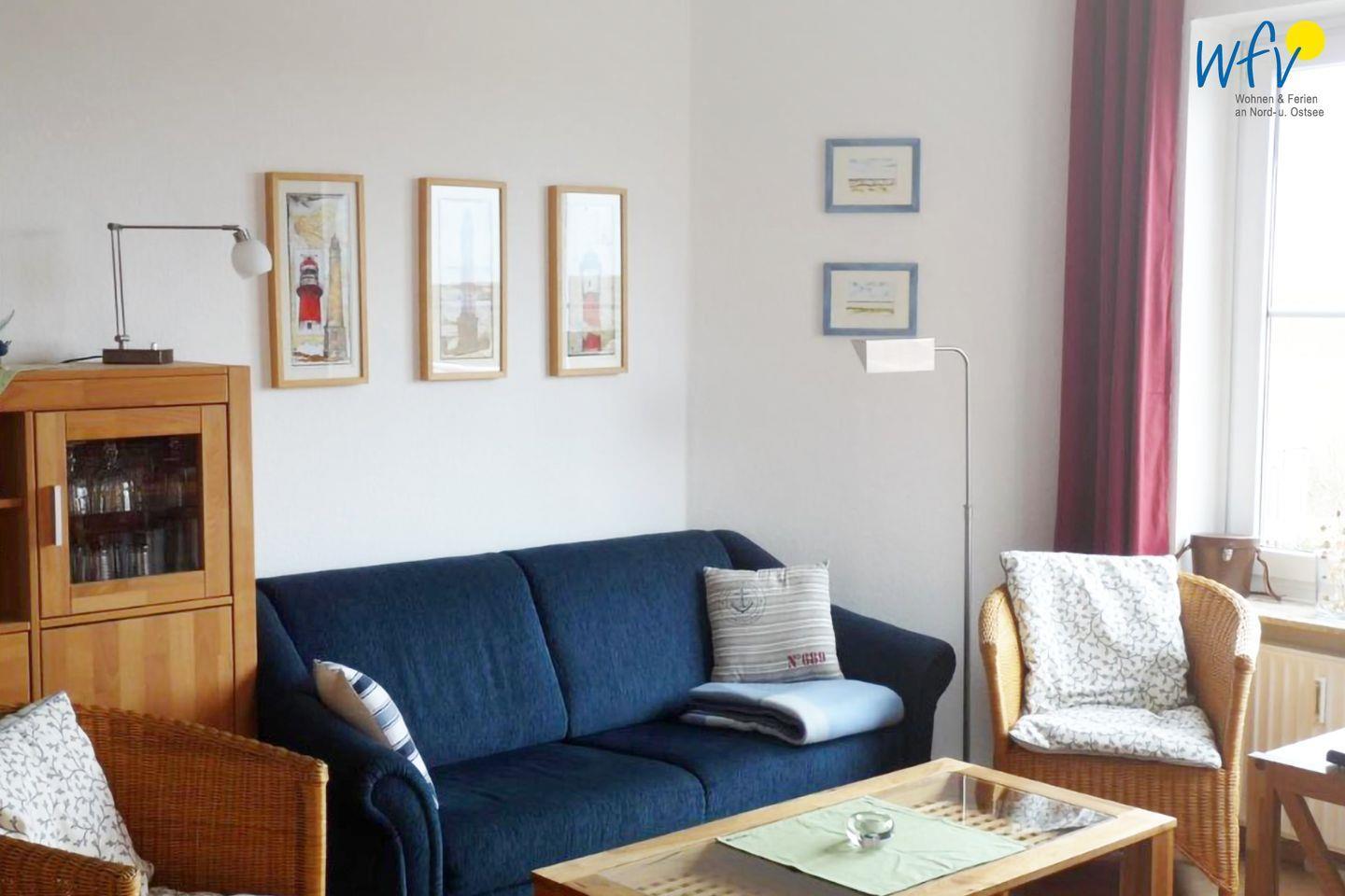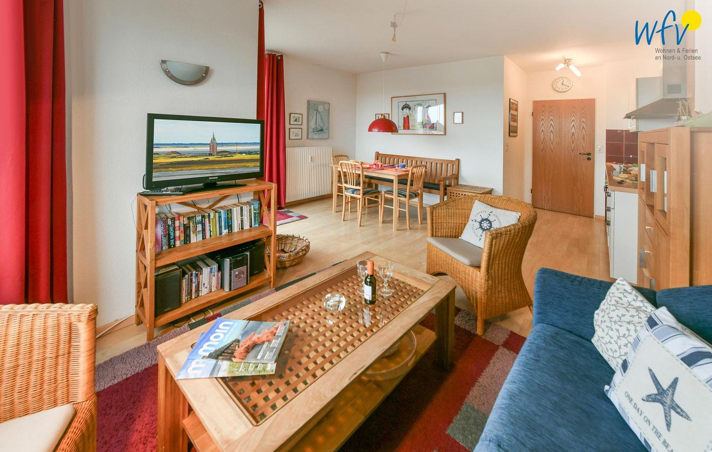 In der Ferienwohnung erwartet Sie ein gemütlicher Wohnraum mit Couchecke, Essbereich und integrierter Küche sowie zwei separate Schlafzimmer und ein gepflegtes Duschbad. Ein großer Südbalkon verwöhnt Sie mit Sonne und wohltuender Nordseeluft!