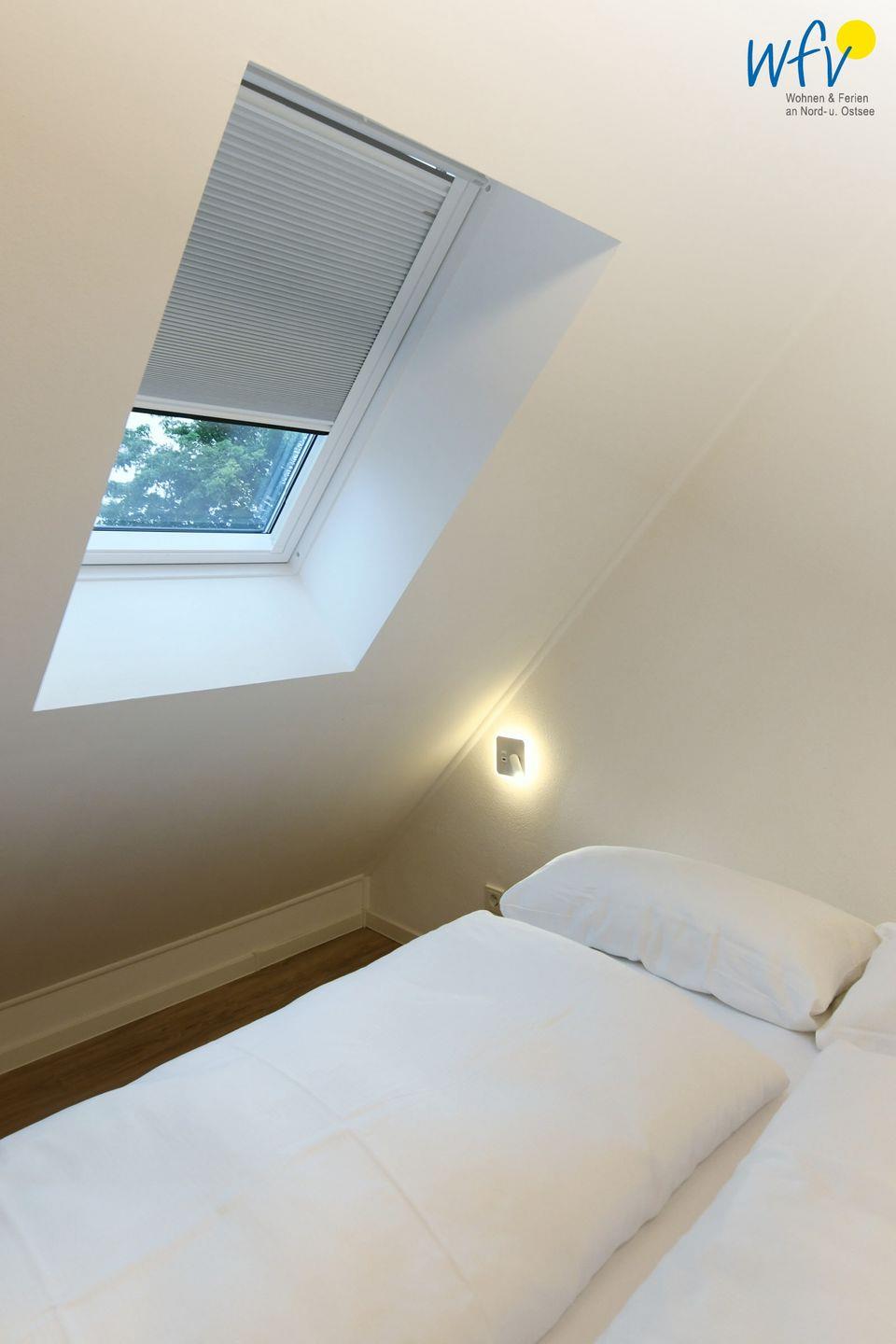 Angenehme Rückzugsmöglichkeiten bieten Ihnen zwei separate Schlafzimmer im Spitzboden. Sie sind mit einem komfortablen Doppelbett (160 cm x 200 cm) bzw. einem Einzelbett ausgestattet (90 x 200 cm; mit Auszug 80 cm x 190 cm). Für Ihre Urlaubsgarderobe befindet sich im Flur zwischen den Schlafzimmern ein geräumiger Kleiderschrank. Aufhängevorrichtungen mit Bügeln gibt es in den Einbauschränken unter der Treppe. Auf der bequemen Schlafcouch im Wohnzimmer können zwei weitere Personen schlafen.