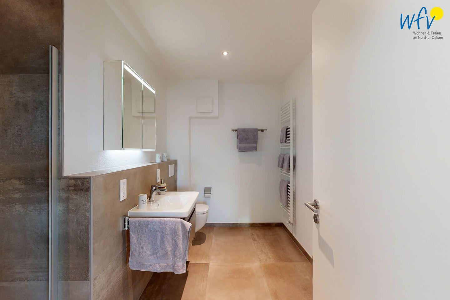 Das große, moderne Bad in elegantem Design verfügt über eine ebenerdige Dusche.