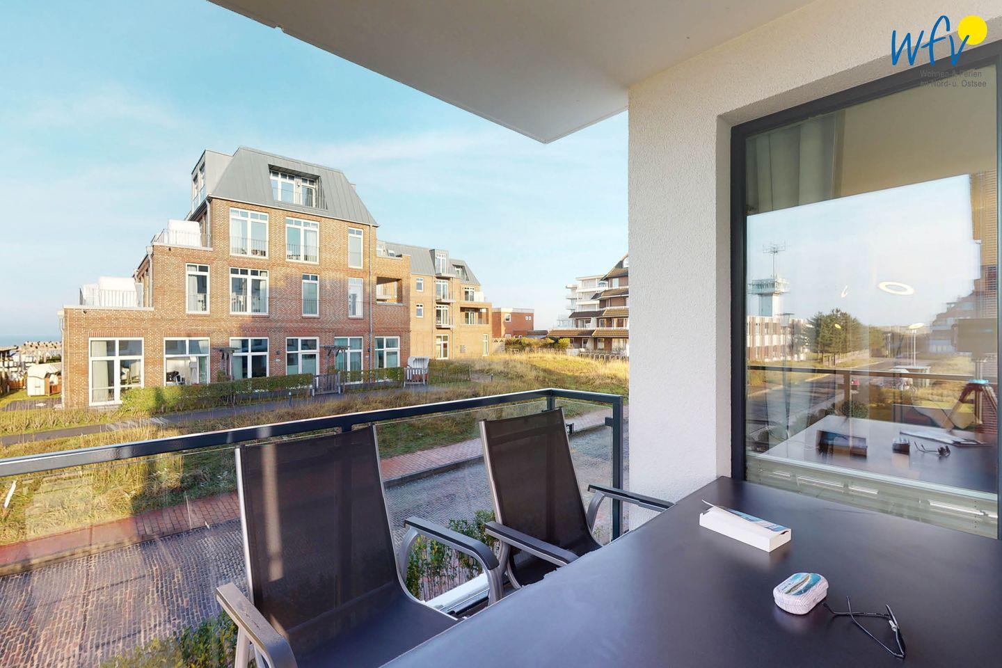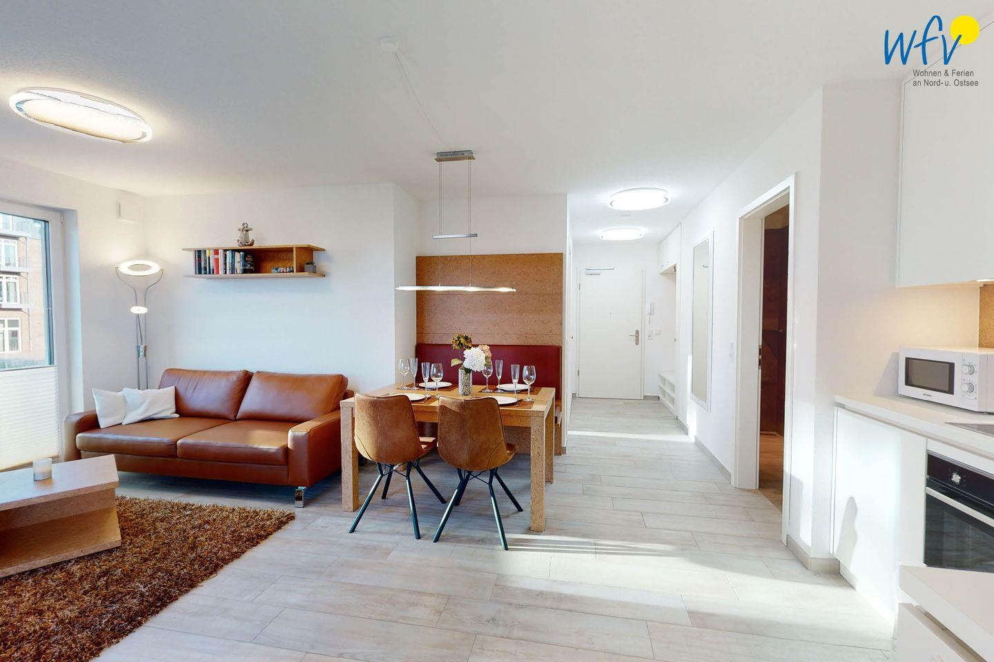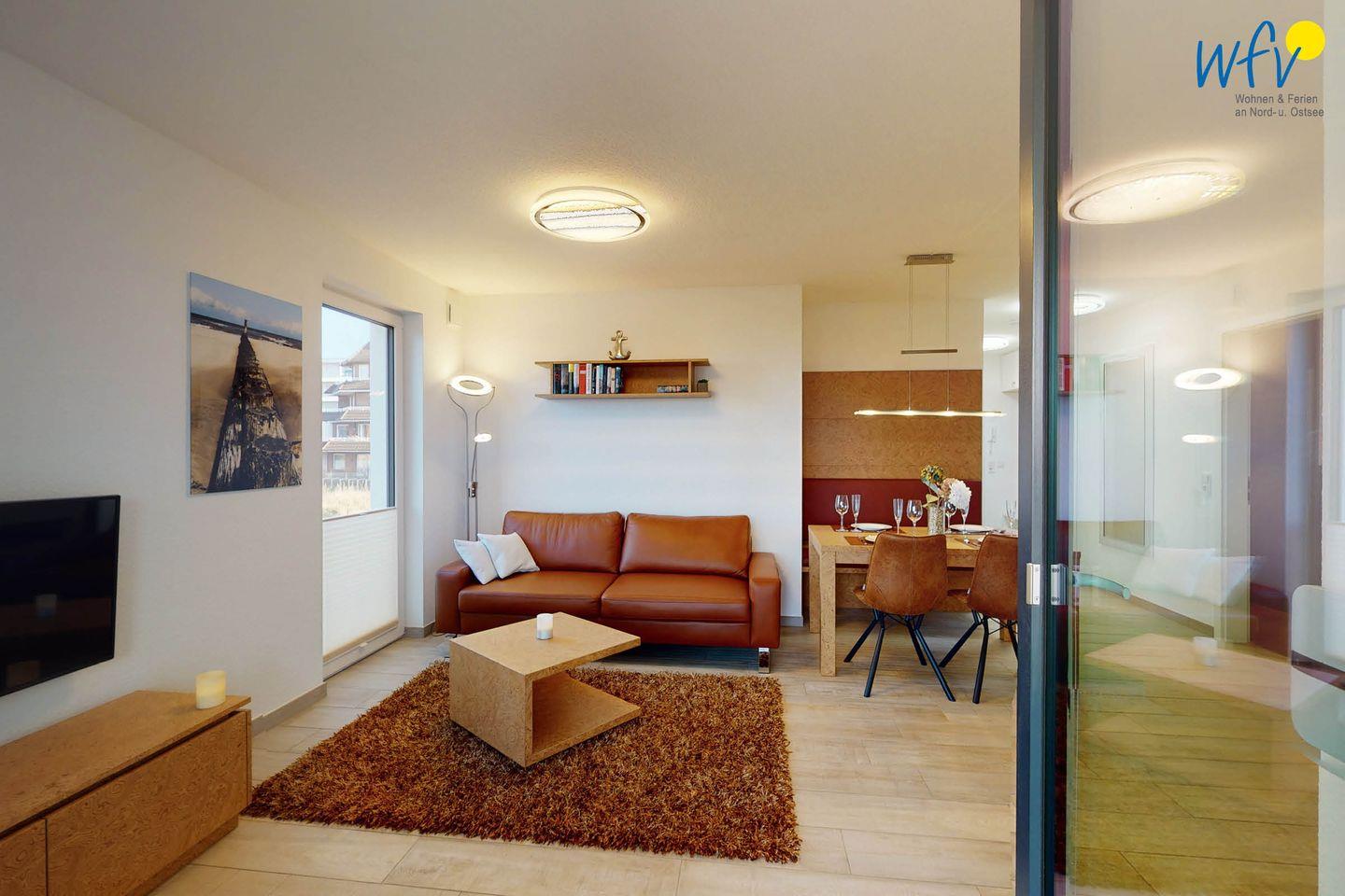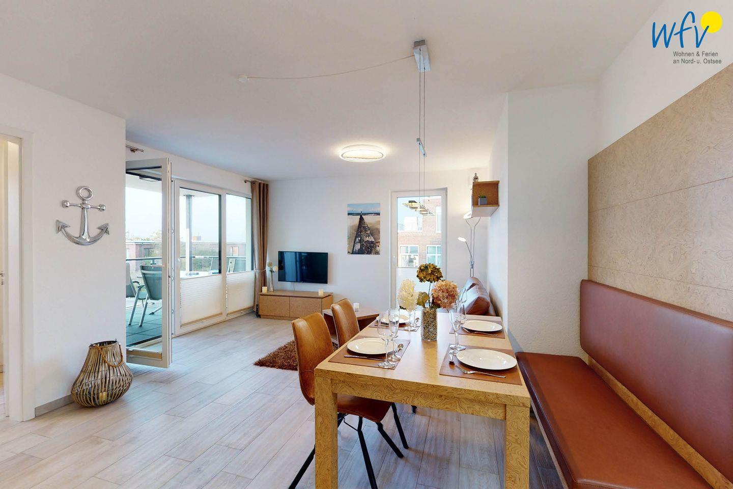 Bereits beim Frühstück können Sie auf dem überdachten und windgeschützten Balkon dieser - im November 2020 fertiggestellten - Traumwohnung die Nordsee sehen (eingeschränkt). Verweilen Sie im exklusiven Wohn- Essbereich mit großem, gemütlichem Ledersofa, lassen Sie Ihren Blick über die einzigartigen Manufaktur-Holzmöbel gleiten und fühlen Sie sich einfach wohl in Ihrem Urlaub auf Wangerooge! Zwei moderne Fernseher mit Internetzugang, Bücher für viele Geschmäcker und Spiele für Groß und Klein sorgen für zusätzlichen Wohnkomfort.