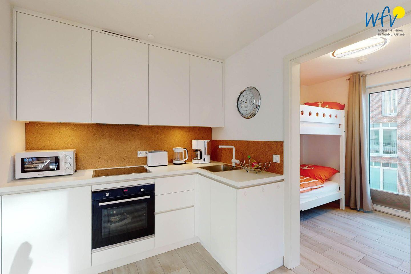 Wenn Sie einmal nicht ins Restaurant gehen möchten, lassen sich in der hochwertigen Einbauküche (u.a. mit Ceranherd, Backofen, Kühlschrank mit Gefrierfach, Mikrowelle und Geschirrspüler) bequem und einfach Ihre Lieblingsgerichte zubereiten. Anschließend auf dem einladenden Balkon mit Meerblick zu essen, ist ein herrliches Urlaubsgefühl!