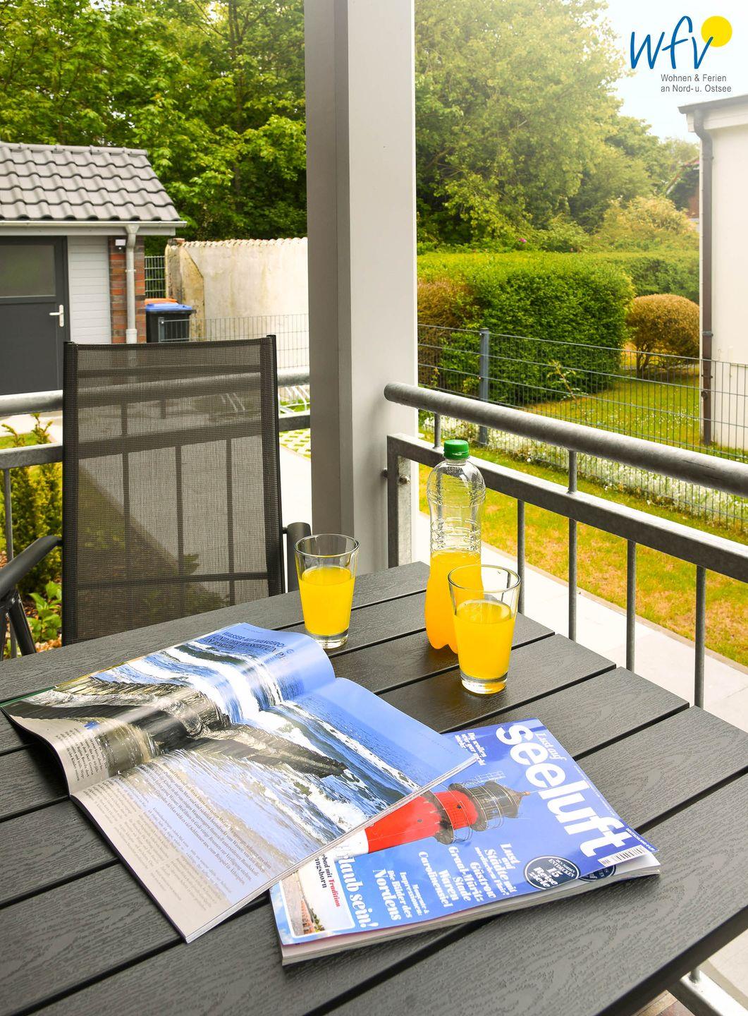 Wohltuende Nordseeluft genießen Sie auf dem hübsch möblierten, überdachten Balkon der Ferienwohnung. In Ruhe ein gutes Buch zu lesen oder den Tag bei einem guten Glas Wein ausklingen zu lassen ist ein wunderbares Urlaubsgefühl! Seitlich blicken Sie hier auf Wangerooges Naturschutzgebiet mit Wäldchen.