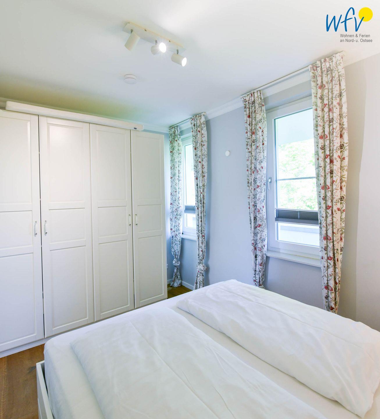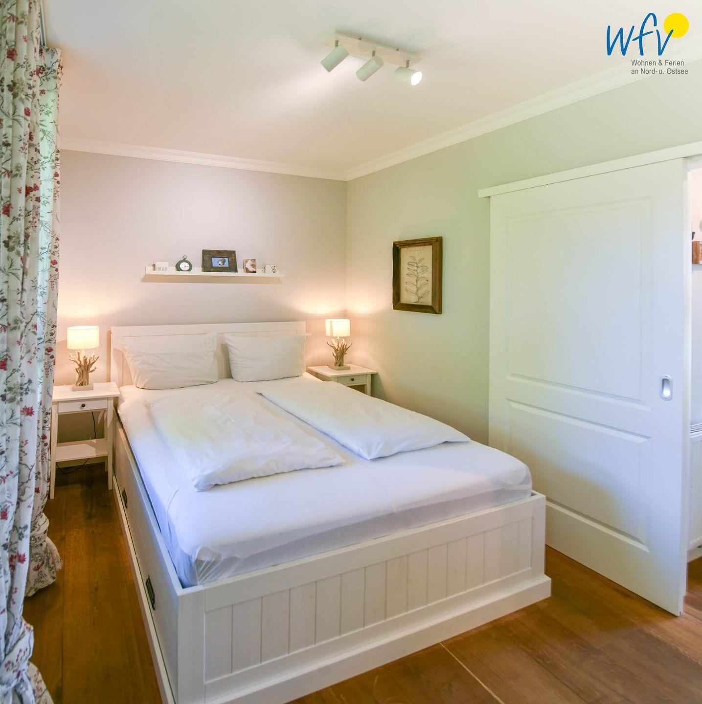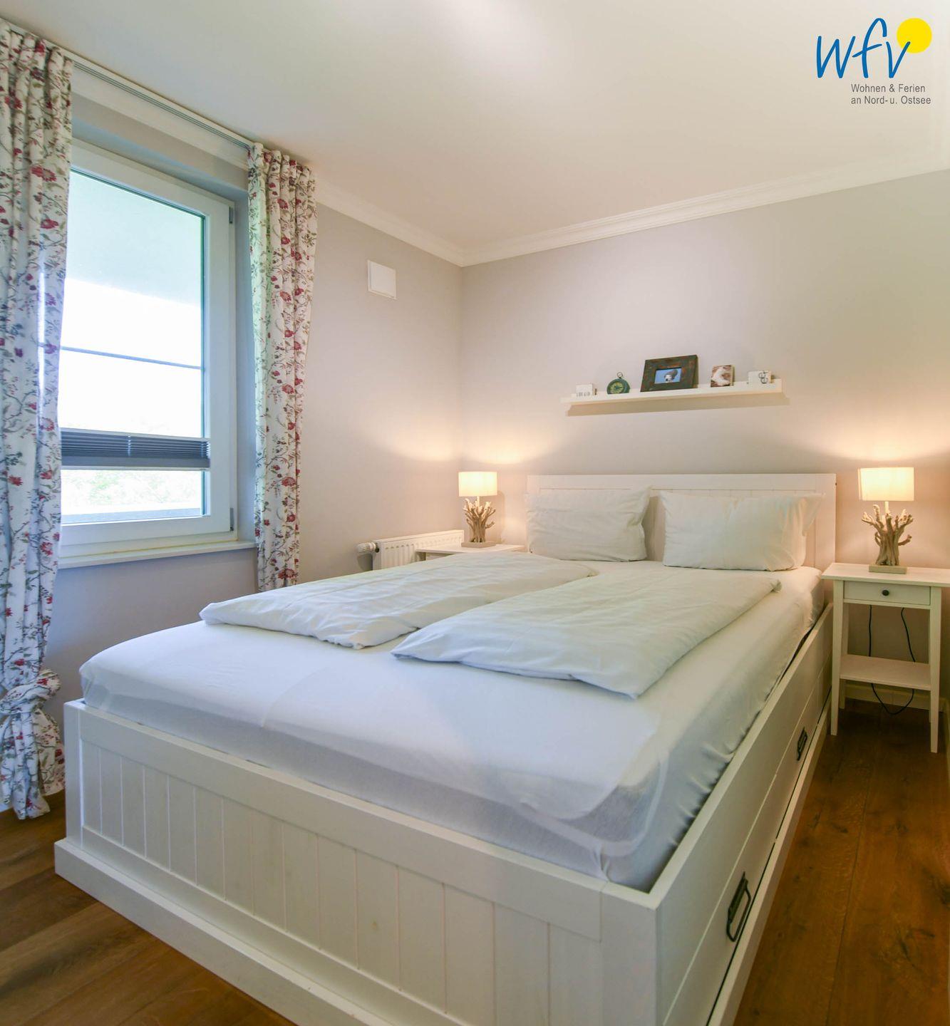 Das in angenehm kühler Nordostrichtung gelegene Schlafzimmer mit komfortablem Boxspringbett (160 x 200 cm) bietet Ruhemöglichkeiten für zwei Personen. Zwei weitere Schlafplätze bestehen durch die Schlafcouch im Wohnbereich.