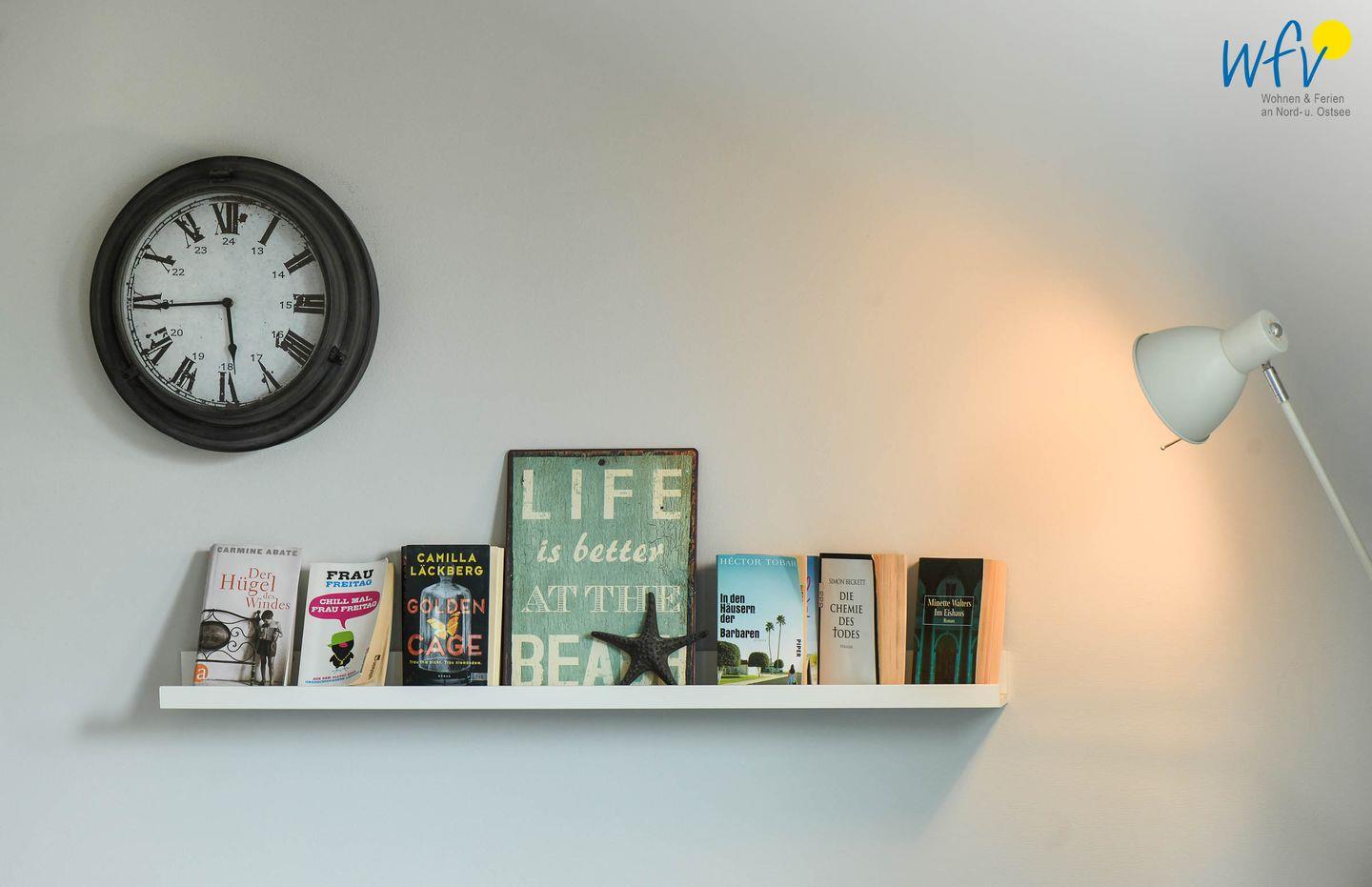 Nach dem Strandtag oder der Fahrradtour lädt eine gemütliche Sitzecke mit TV, HiFi-Anlage und einigen Büchern zu entspannten Stunden ein. Zum Surfen vom Smartphone aus steht Ihnen kostenlos freies WLAN zur Verfügung.