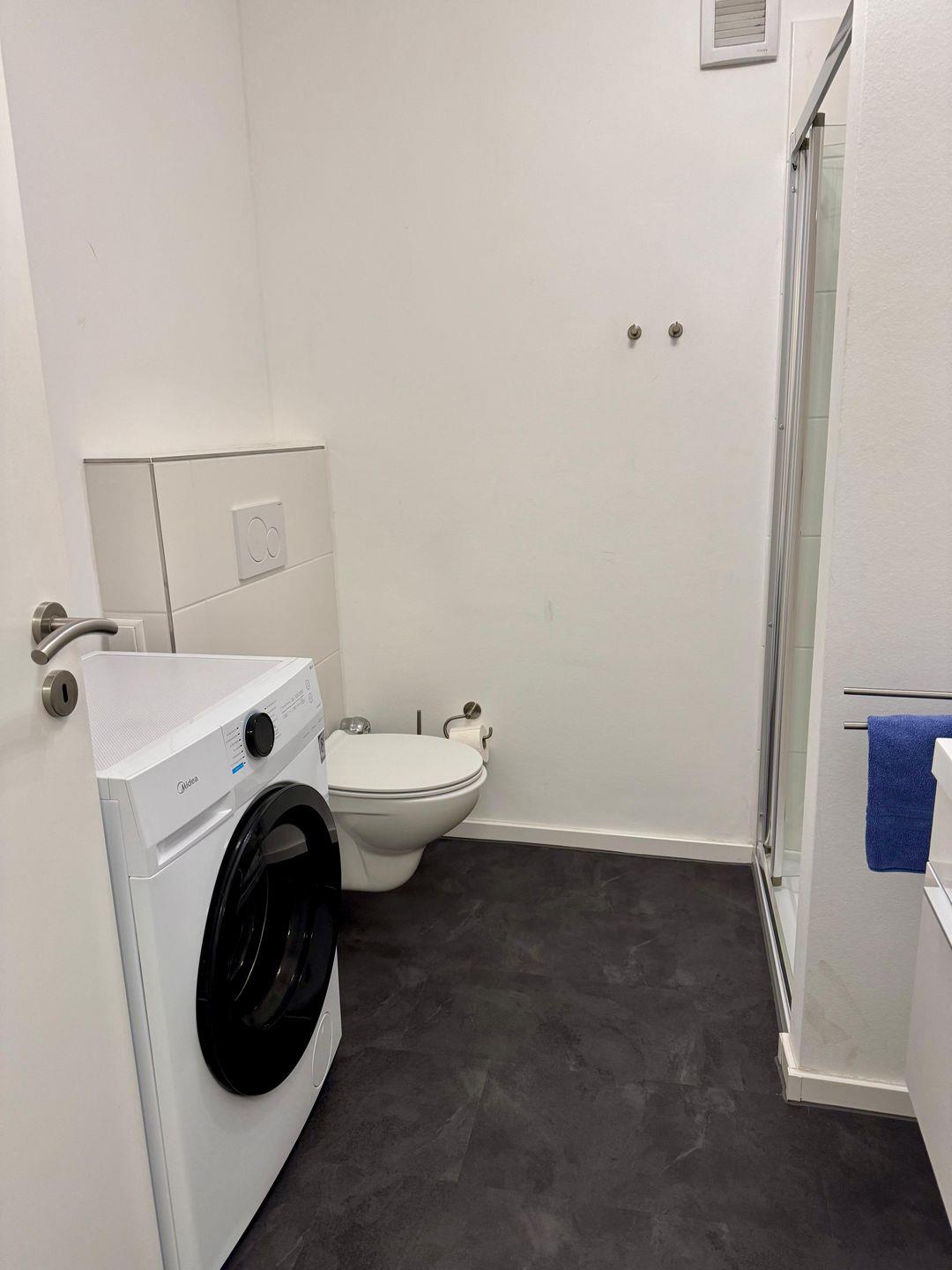 Das gepflegte Duschbad in modernem Design rundet den Wohnkomfort ab. Hier befindet sich eine eigene Waschmaschinen für Ihre Wäsche.