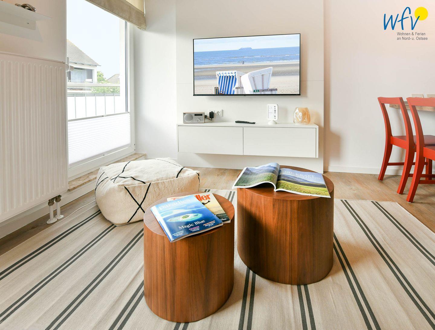 Nach einem langen Strandtag lädt das Wohnzimmer mit Sofa und modernem TV zu gemütlichen Fernsehabenden ein. Oder Sie machen es sich mit Ihrer spannenden Urlaubslektüre bequem. Zum Surfen vom Smartphone aus empfangen Sie freies WLAN.