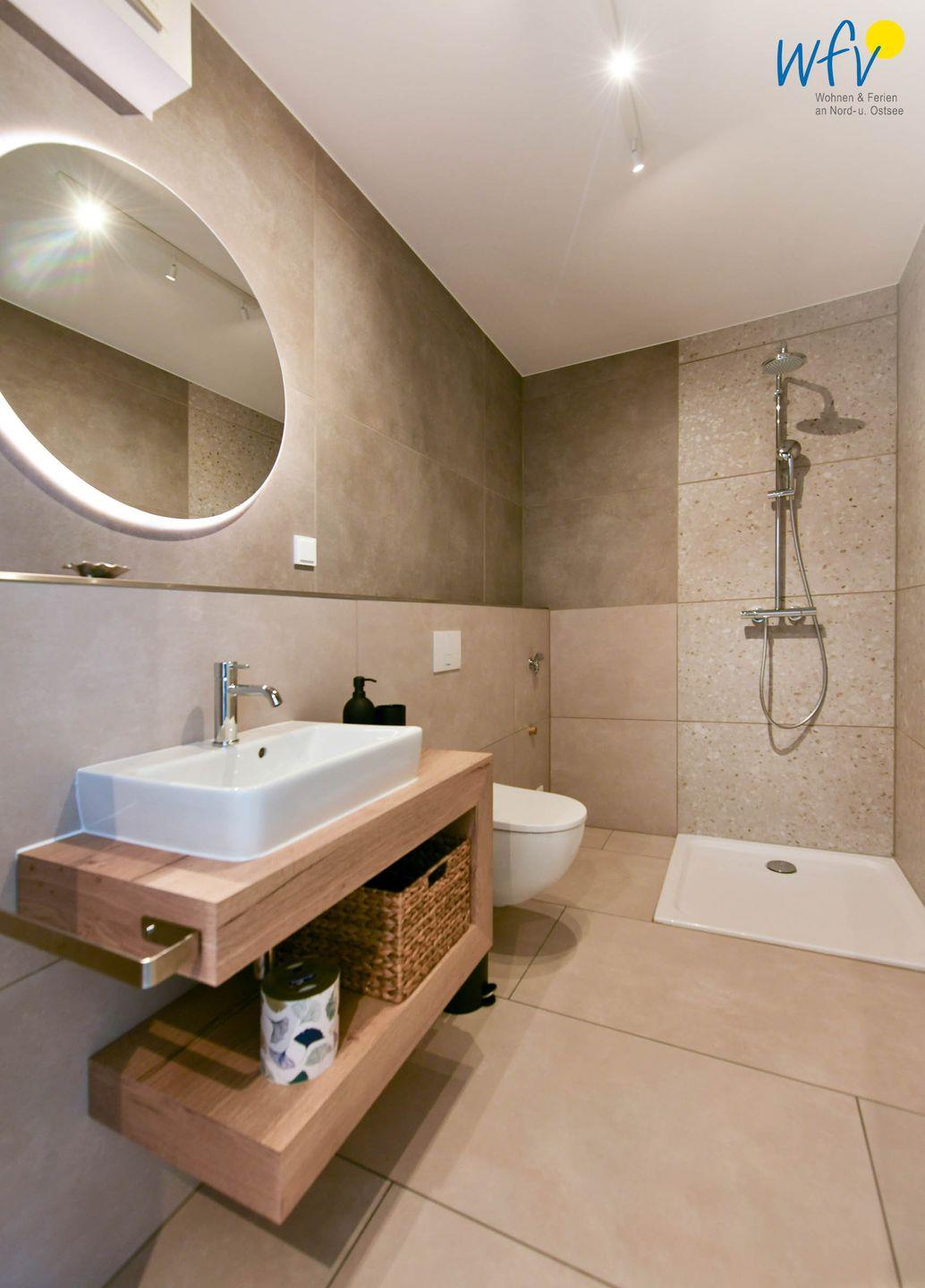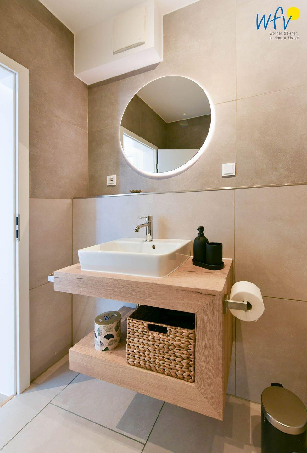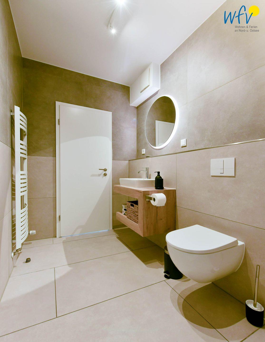 Das frisch sanierte Badezimmer überzeugt mit stilvollem Design. Maßangefertigte Badmöbel, eine Glasdusche, ein hinterleuchteter Spiegel und eine Handtuchheizung machen auch diesen Raum zu einem Wohlfühlort.