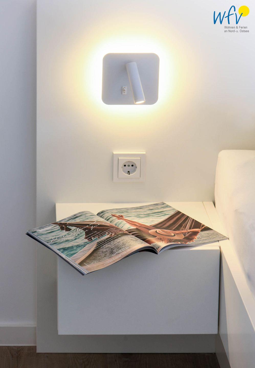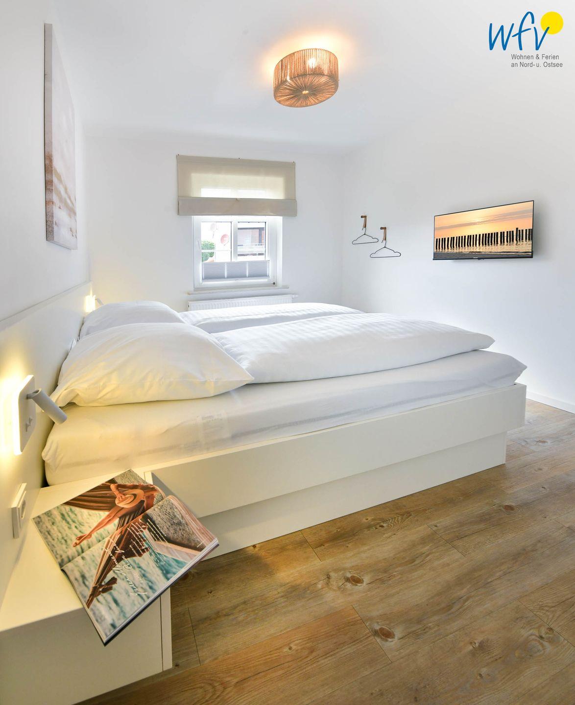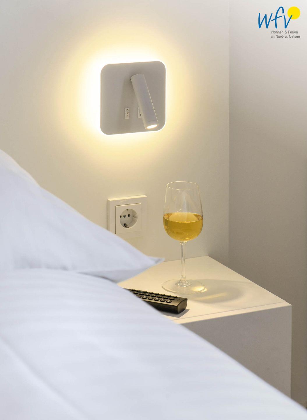 In dem separaten und gemütlich eingerichteten Schlafzimmer befindet sich ein maßgeschneidertes Bett, ein SmartTV und ein Kleiderschrank für Ihre Urlaubsgarderobe. Mit einer Leselampe kann das Buch auch im Bett weitergelesen oder der Film zu Ende geschaut werden (Hinweis: TV im Schlafzimmer nur Internet-TV möglich).