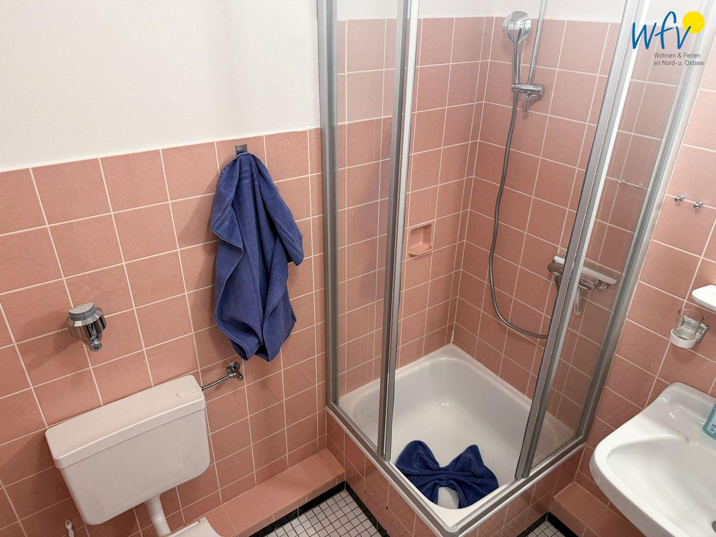 Das gepflegte Badezimmer ist mit Dusche, WC und Haartrockner ausgestattet.