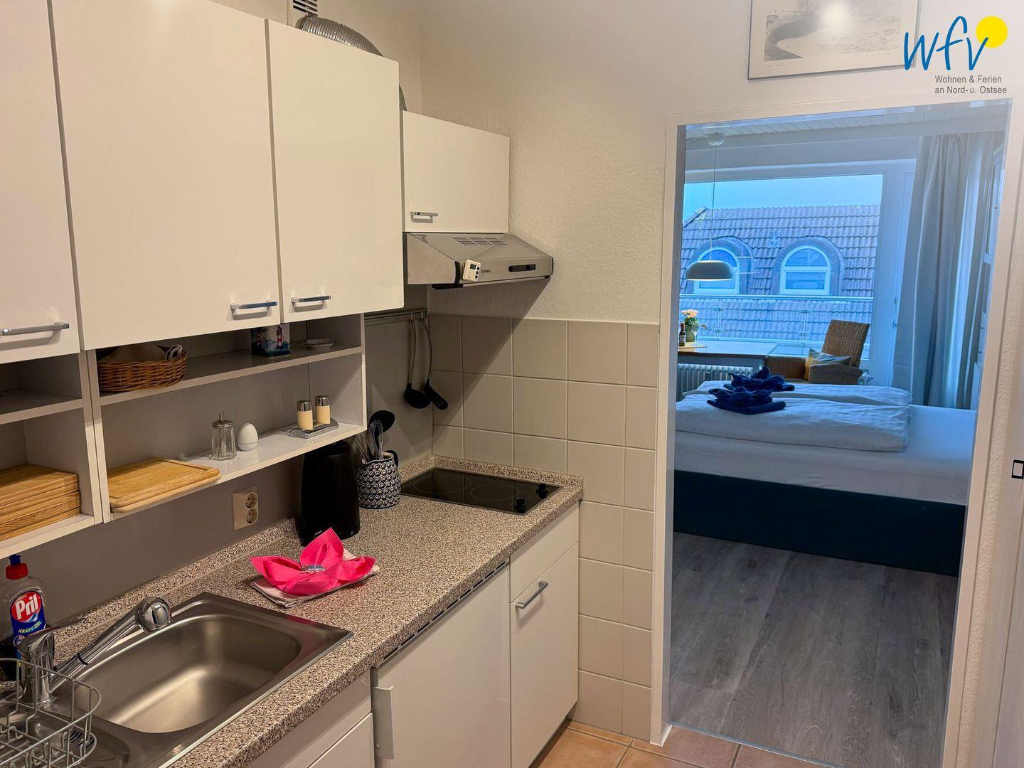 Für eine bequeme Selbstverpflegung ist die Kochnische gut ausgestattet - u.a. mit einem 2-Platten-Ceranherd, einem Kühlschrank, einer Kaffeemaschine, einem Toaster, einem Wasserkocher und einem Eierkocher.