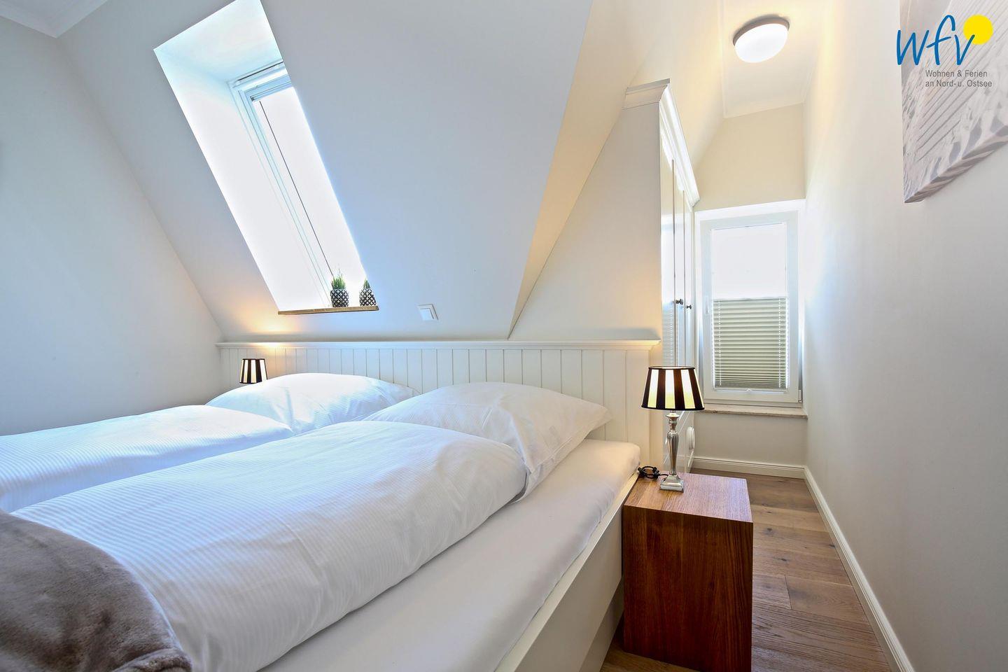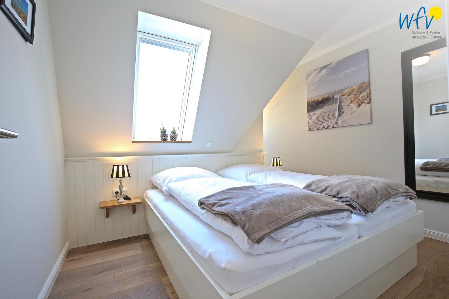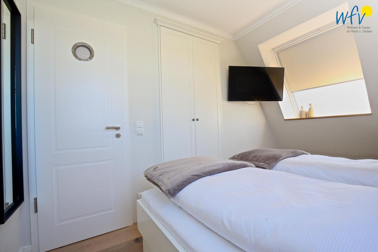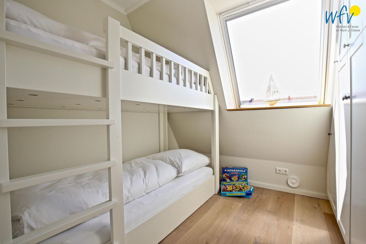 In der oberen Etage bieten Ihnen drei separate Schlafzimmer angenehme Rückzugsmöglichkeiten. Die Elternschlafzimmer sind jeweils mit einem komfortablen Doppelbett ausgestattet, das Kinderzimmer mit einem Etagenbett. Ihre Urlaubsgarderobe findet in den geräumigen Kleiderschränken Platz. Weiterer Komfort besteht durch ein TV in einem der Elternschlafzimmer sowie durch Kinderspielzeug für unsere kleinen Gäste. Vom Dachfenster aus können Sie bereits die Nordsee sehen!