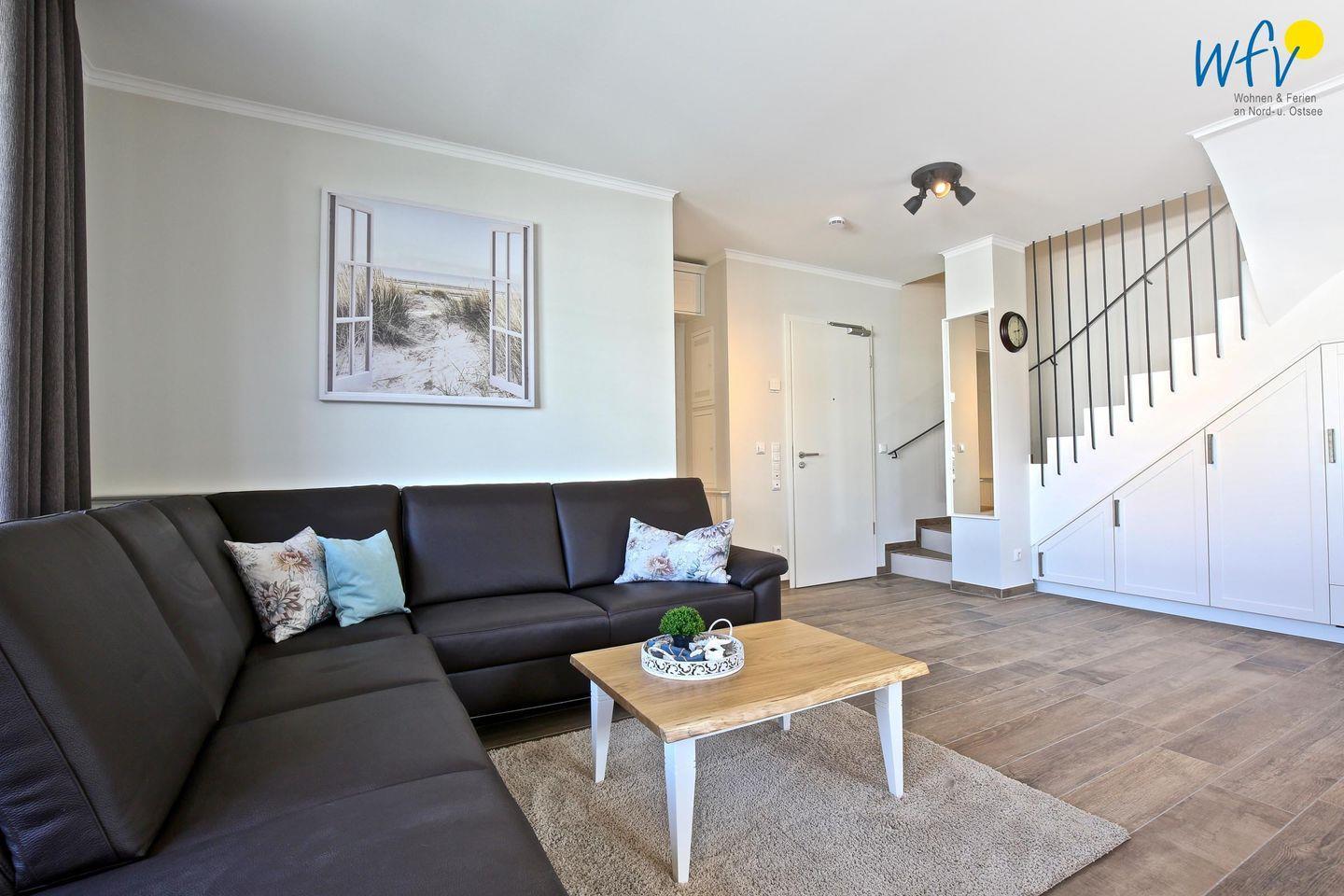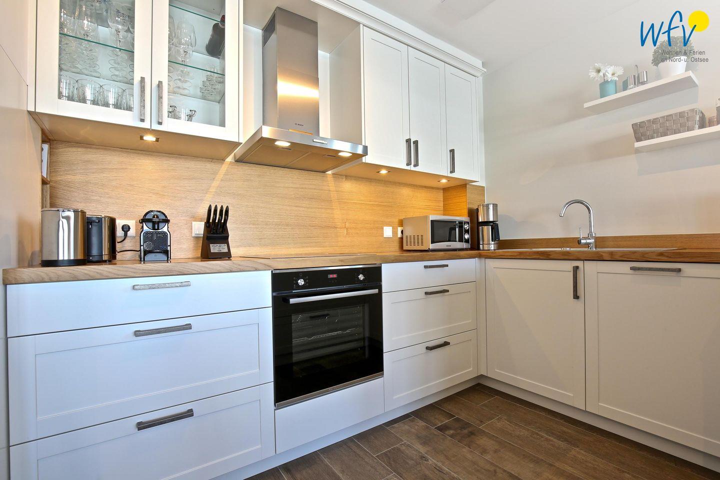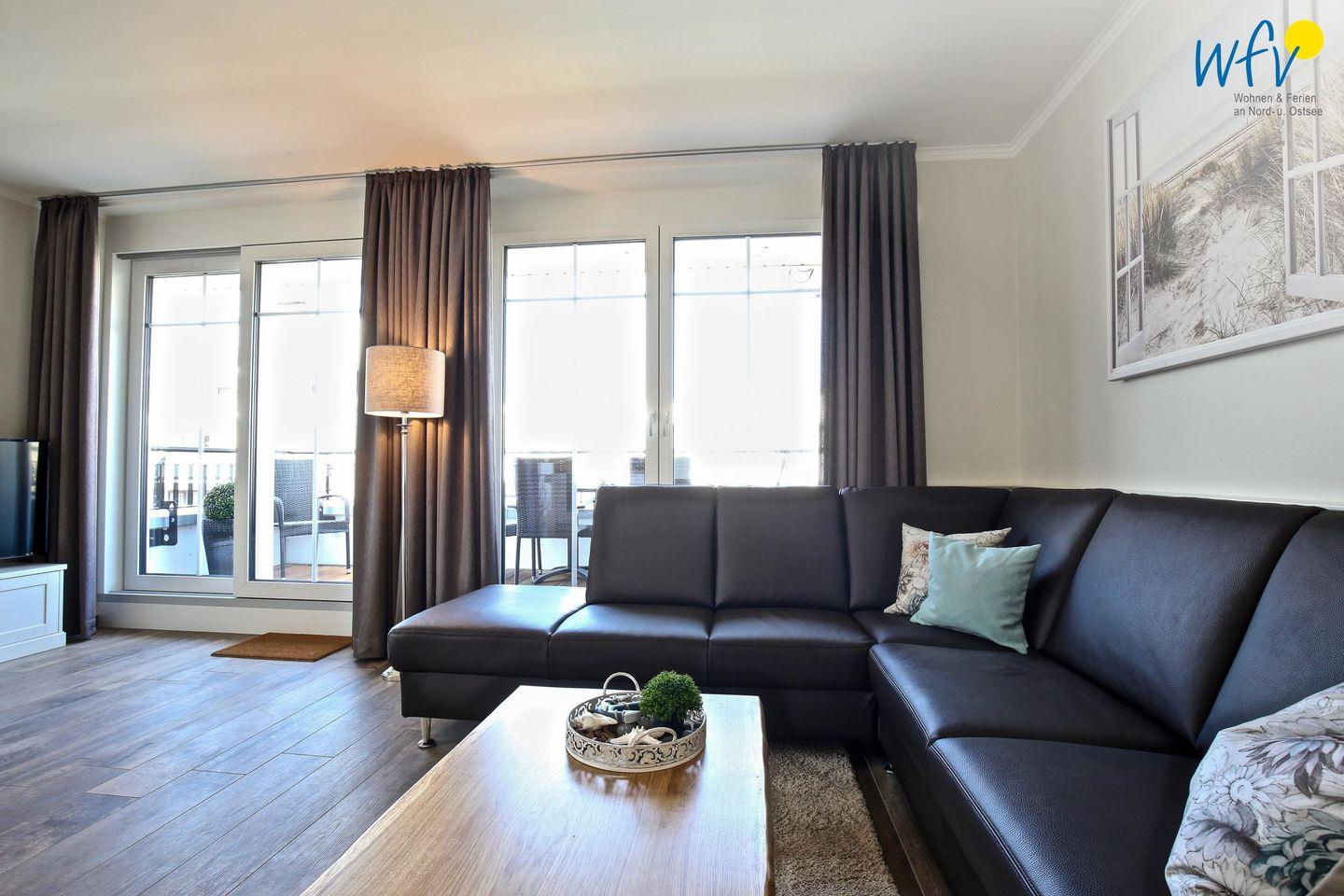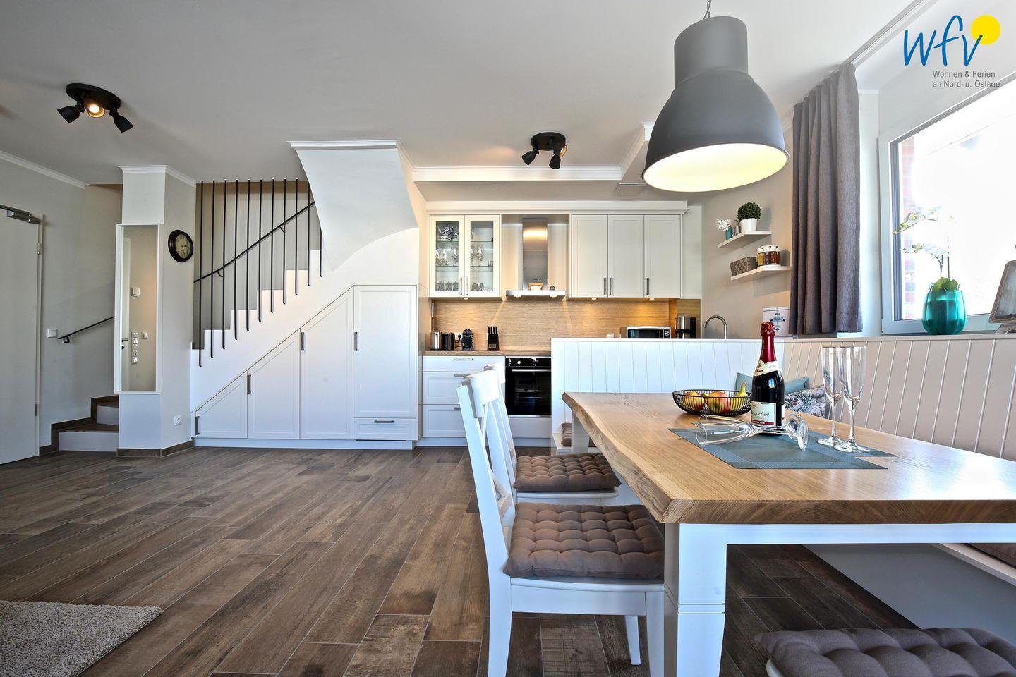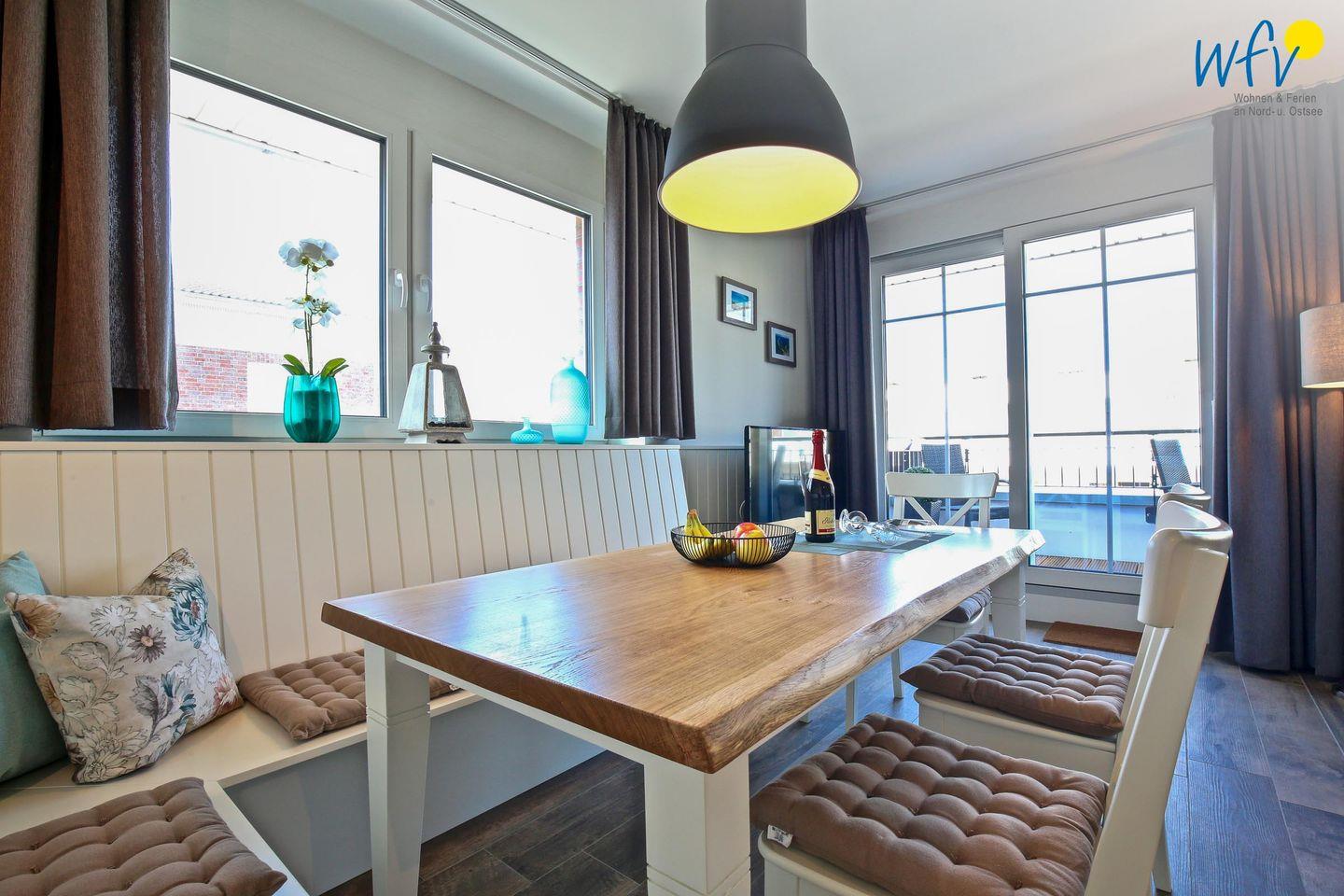 Die helle Ferienwohnung ist liebevoll und modern eingerichtet, maritime Accessoires sorgen für Gemütlichkeit und das entsprechende Nordseegefühl. Nach dem Strandtag oder der Fahrradtour lädt die breite Couchlandschaft im Wohnbereich zum ausgiebigen Entspannen ein. In der offenen Küche mit hochwertigen Geräten (u.a. Ceranherd, Backofen, Spülmaschine) und großem Essplatz lassen sich beim gemeinsamen Kochen und Klönen herrlich gesellige Abende verbringen. Die Fußbodenheizung und der hochwertige Parkettboden verleihen dem Raum eine angenehme Raumtemperatur bzw. an kühleren Tagen eine wohlige Wärme.