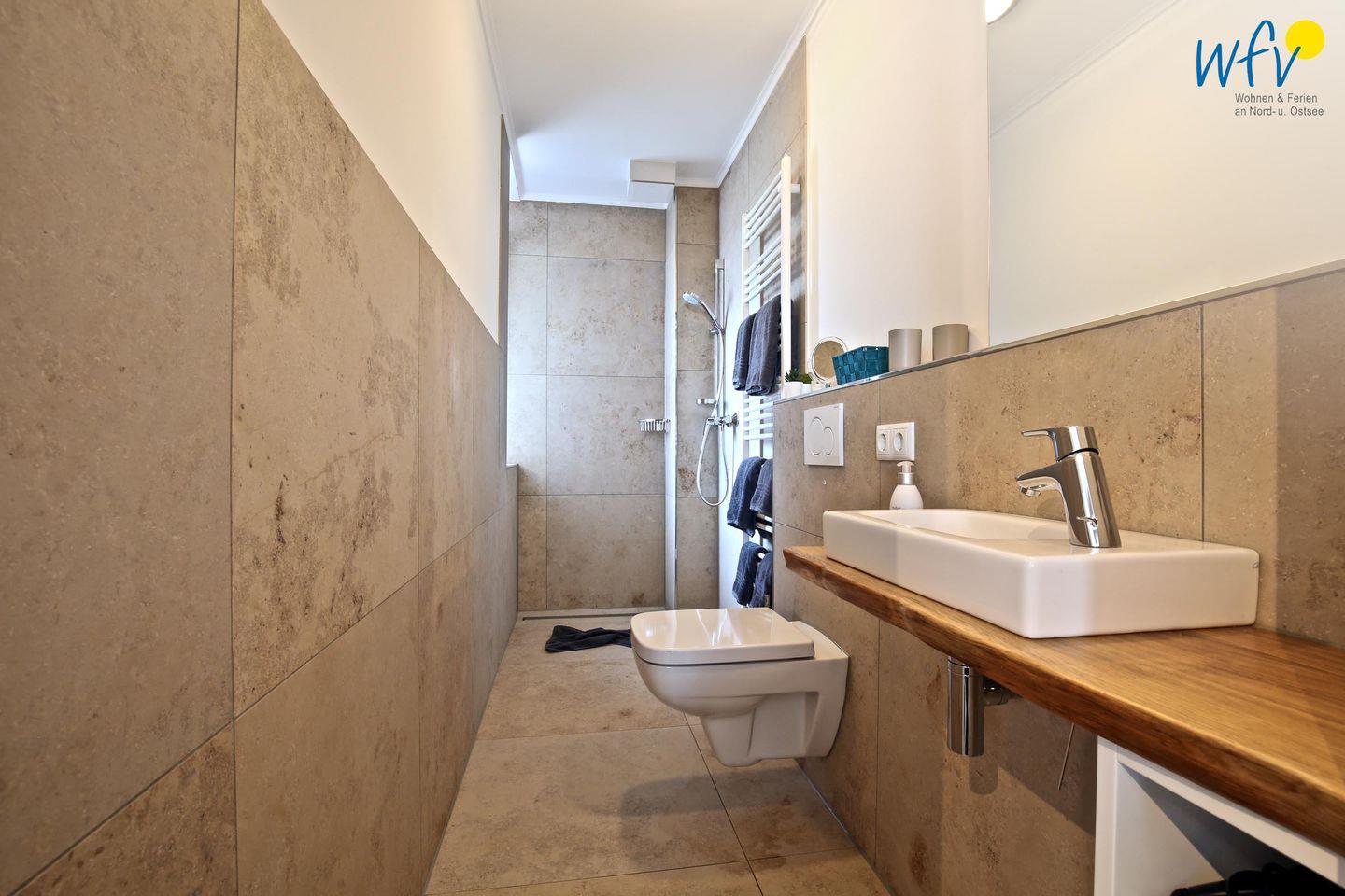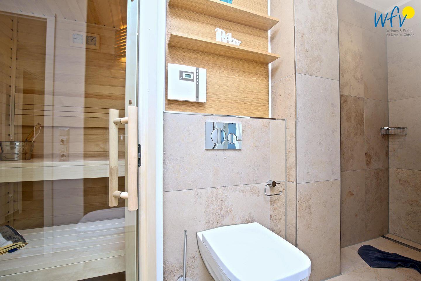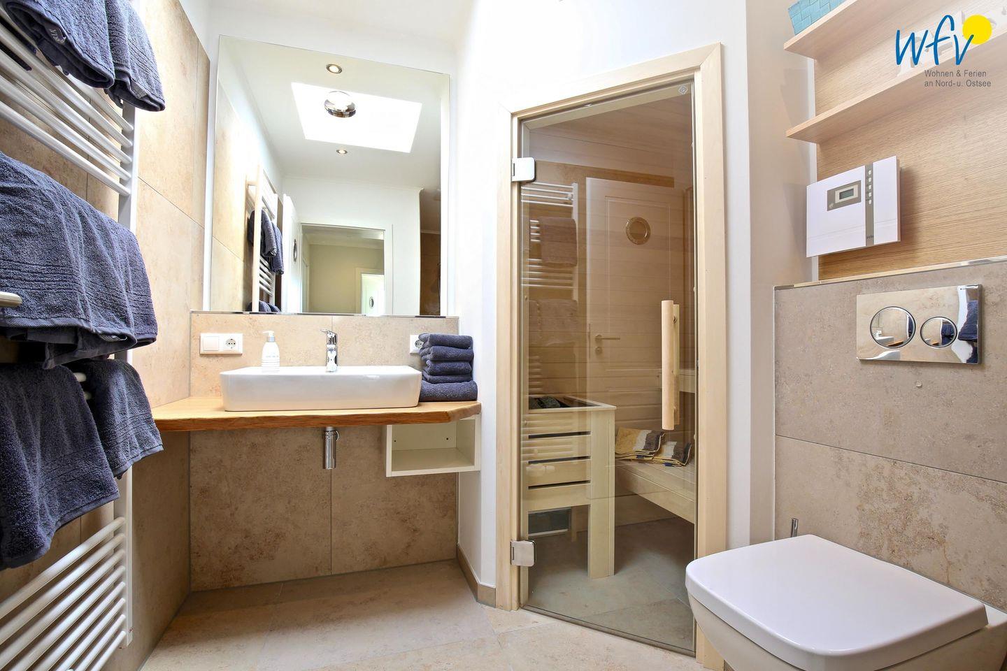 Die zwei eleganten Duschbäder (OG + DG) überzeugen durch ihre stilvolle Ausstattung mit breitem Waschtisch, großem Spiegel und Handtuchheizung. Die eigene Sauna im oberen Bad verwöhnt Sie mit wohltuender Entspannung nach dem Strandspaziergang.