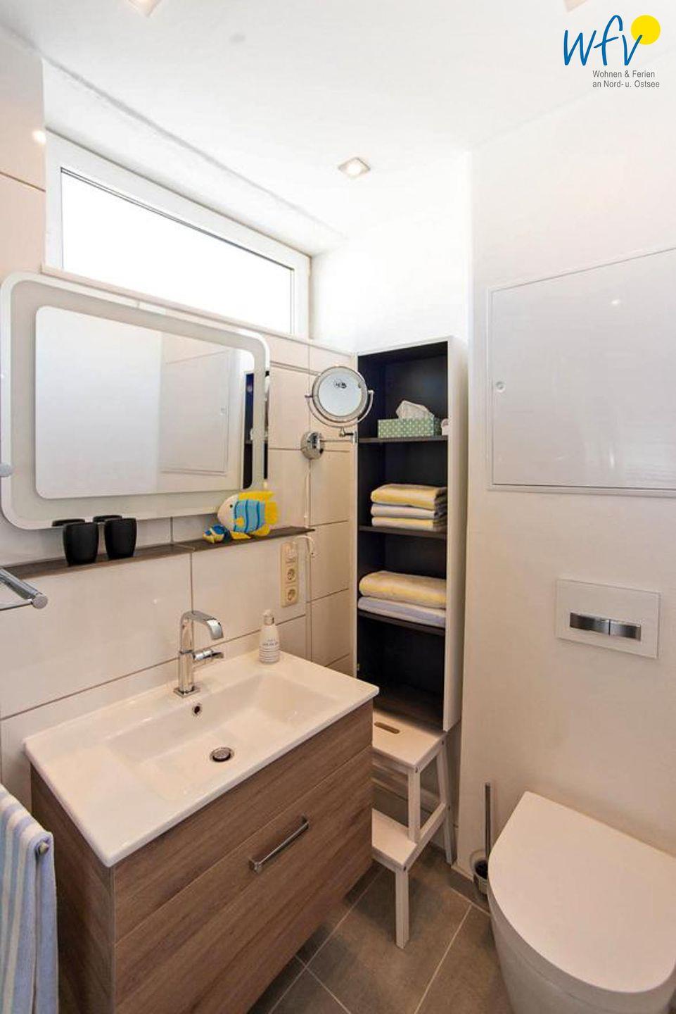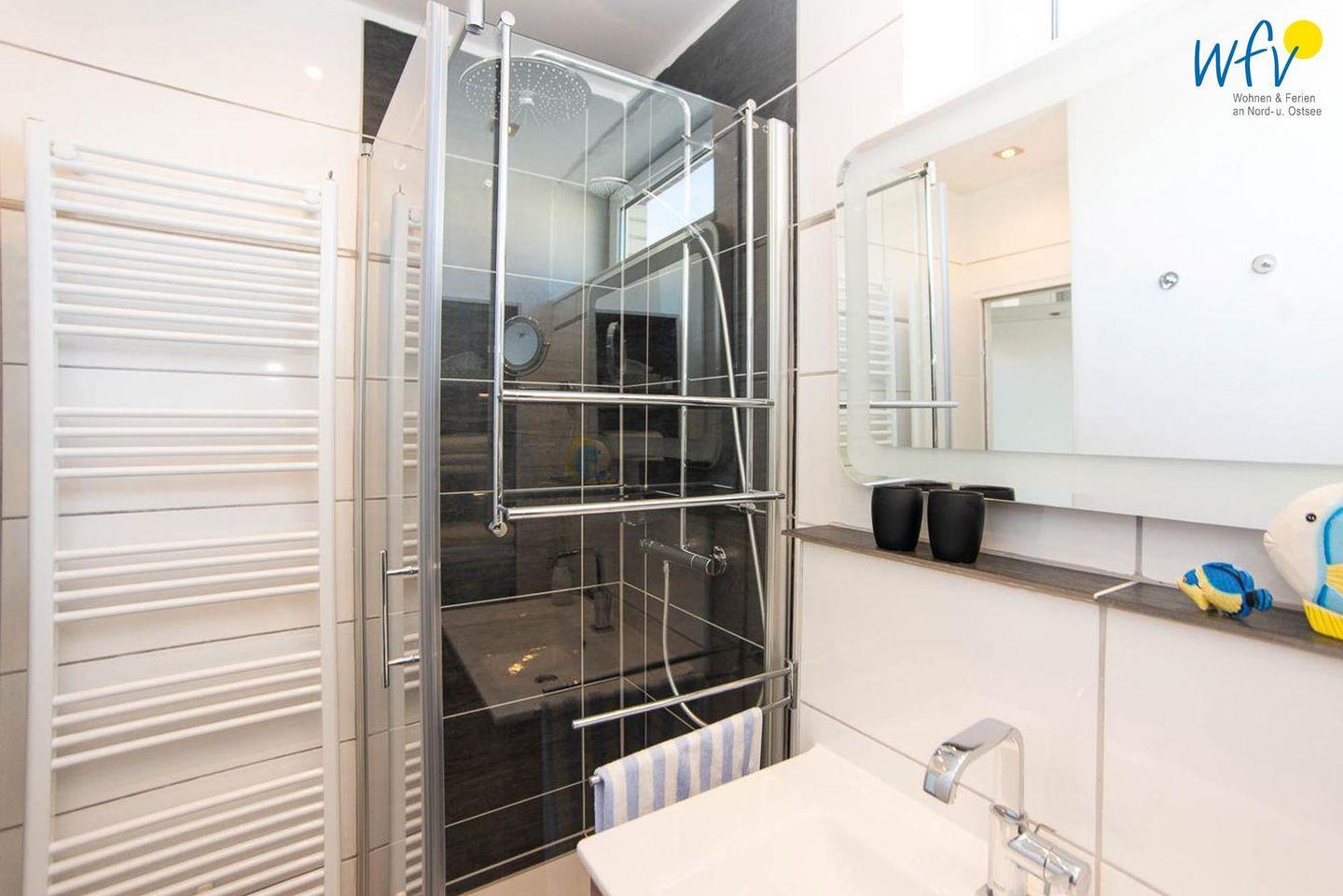 Weiteren Wohnkomfort bietet Ihnen das moderne Tageslichtbad mit Dusche, Handtuchheizung und Waschtisch.
