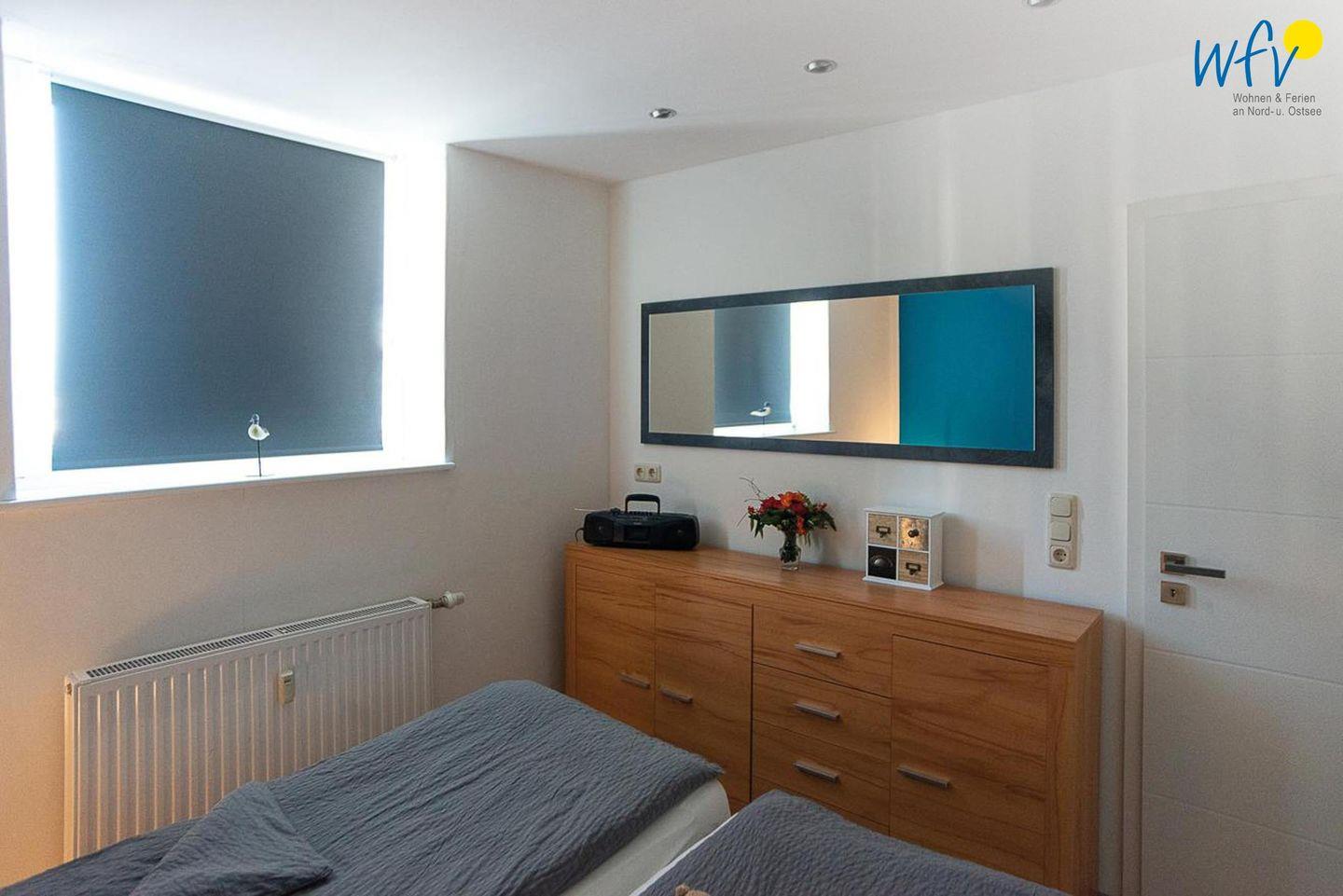Das separate Schlafzimmer ist mit einem komfortablen Doppelbett ausgestattet. Ein Kleiderschrank bietet Ihnen Platz für die Urlaubsgarderobe. Und wenn Sie morgens nach dem Aufstehen aus dem Fenster schauen, begrüßt Sie ein schöner Blick aufs Meer!