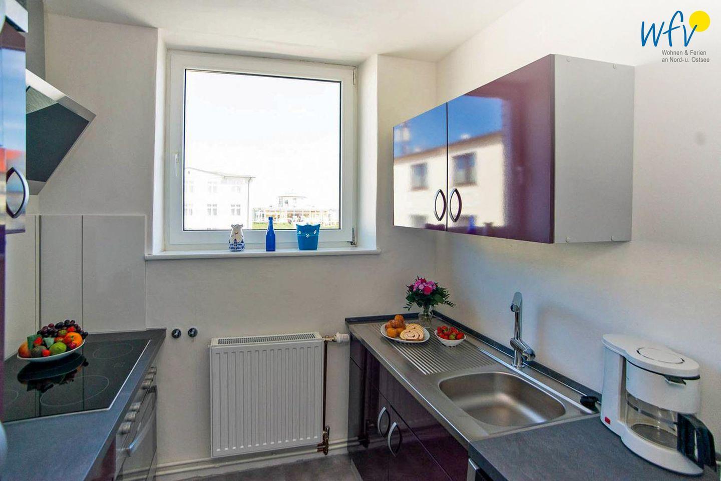 Die gut ausgestattete Küchenzeile - u.a. mit 4-Platten-Herd, Backofen und Mikrowelle - ermöglicht Ihnen eine bequeme Selbstverpflegung. Auch aus diesem Zimmer können Sie bereits die Nordsee sehen!