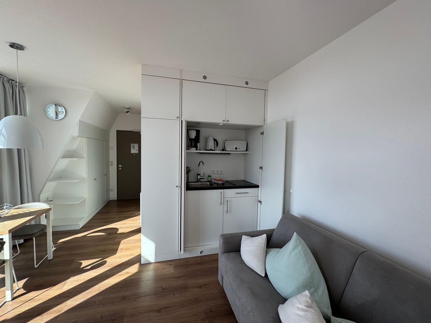 Die Unterkunft bietet auf 33 m² genügend Raum für entspannte Stunden. Modern und geschmackvoll eingerichtet, befindet sich Ihr Appartement im 3. Stock des Aparthotels und ist sowohl für Paare als auch für Alleinreisende ideal geeignet. Es verfügt über ein komfortables Wohnzimmer, das durch eine offene Küche ergänzt wird. Bei der Ausstattung der Küche wurde Wert auf praktische Details gelegt, sodass Sie mit einem Induktionsherd, einem Kühlschrank, einer Kaffeemaschine, einem Wasserkocher sowie einem Toaster alles für die Zubereitung Ihrer Mahlzeiten vorfinden. Der Essbereich sowie eine Sofaecke laden zu geselligen Abenden ein.