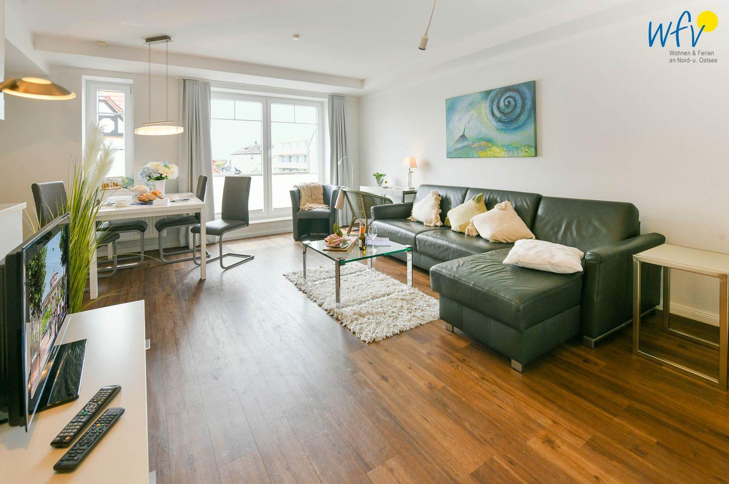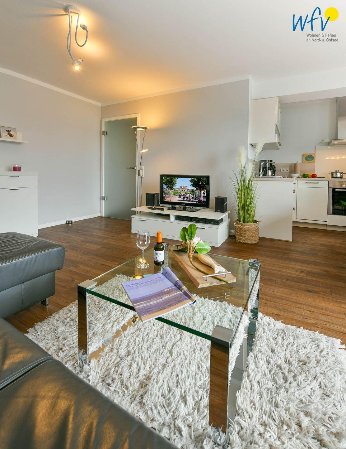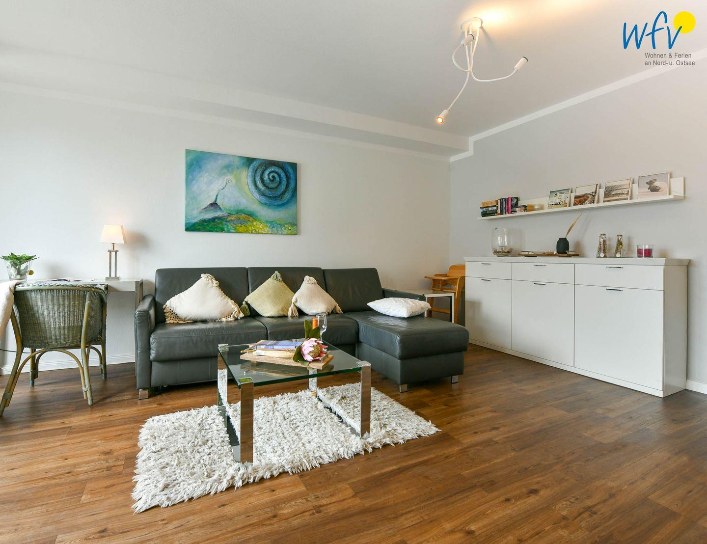 Die Ferienwohnung besticht durch ihr modernes und zugleich gemütliches Ambiente. Liebevolle maritime Accessoires sorgen für die persönliche Note. Der helle offene Wohnbereich lädt mit einer Sofaecke und einem Essbereich zum Entspannen nach dem ereignisreichen Urlaubstag ein. Ein modernes TV mit DVD-Player sorgt für Unterhaltung, zudem empfangen Sie kostenlos freies WLAN.