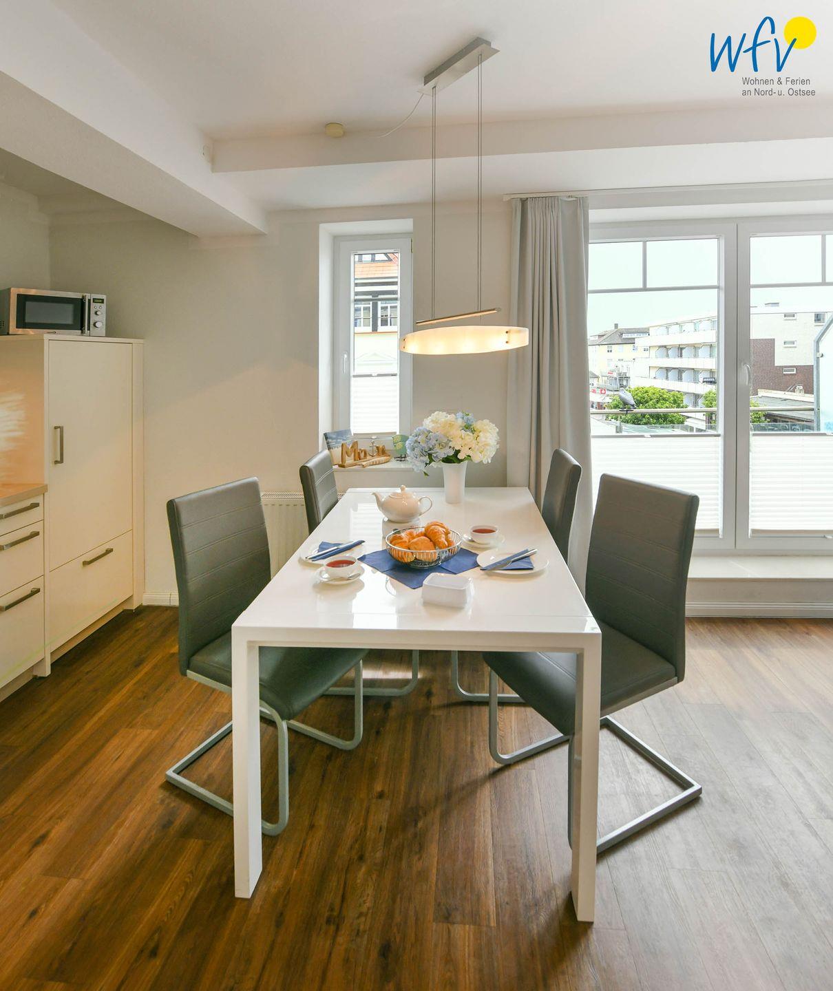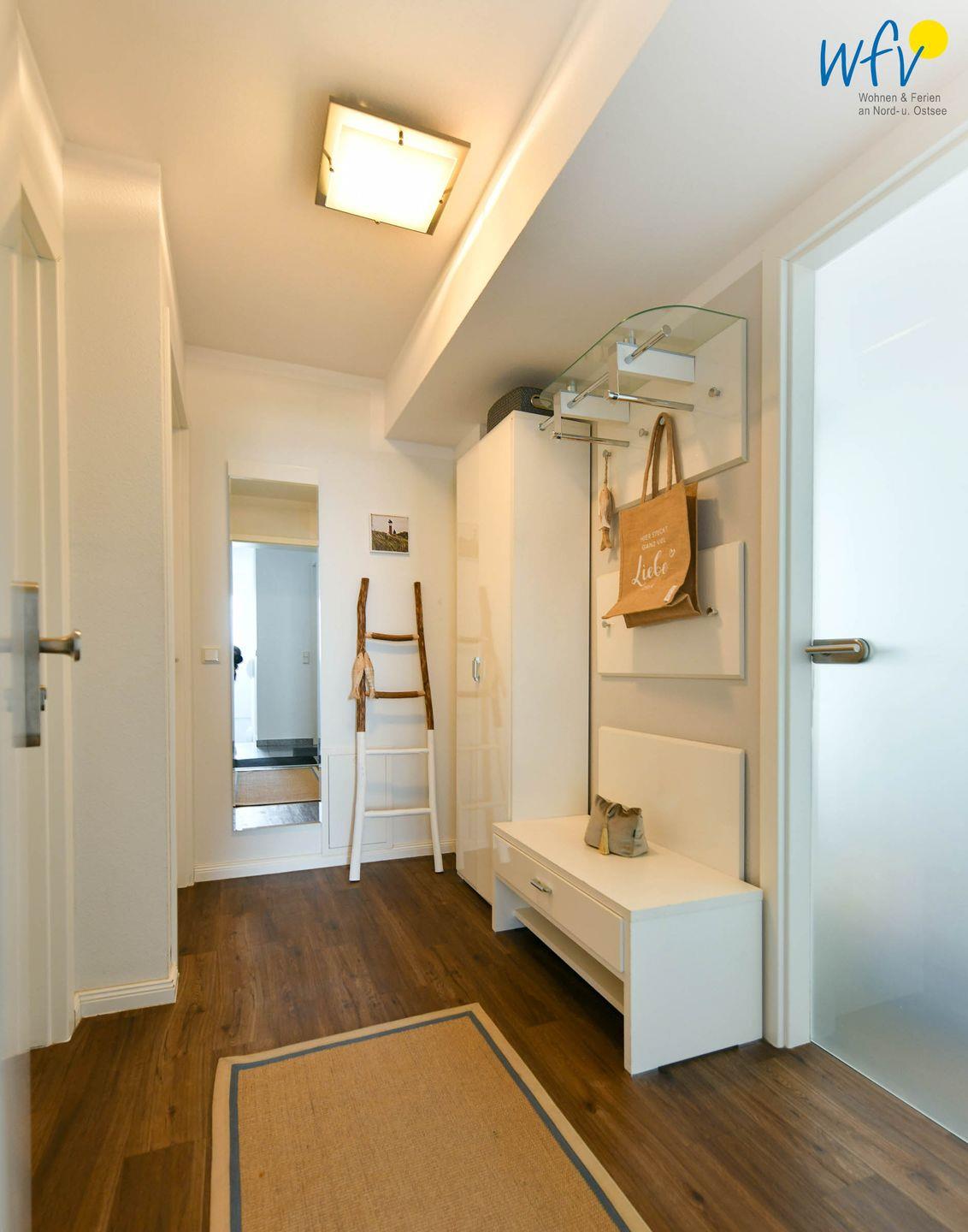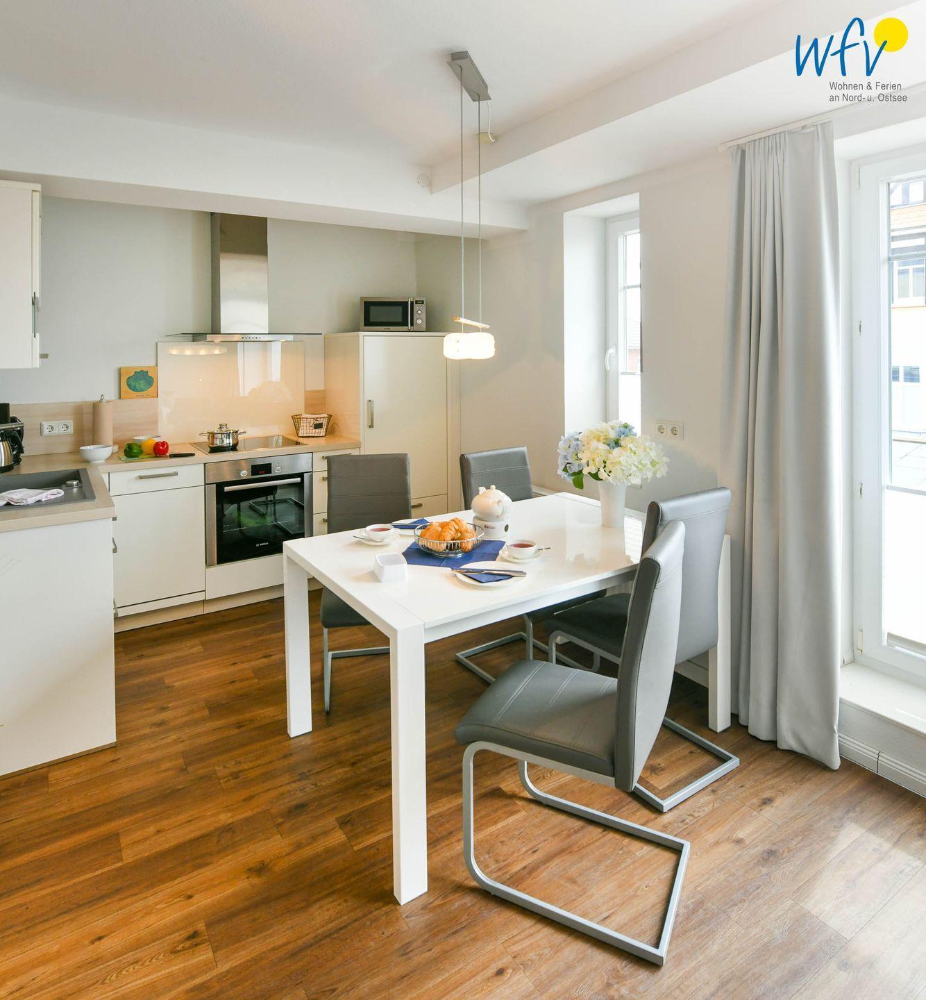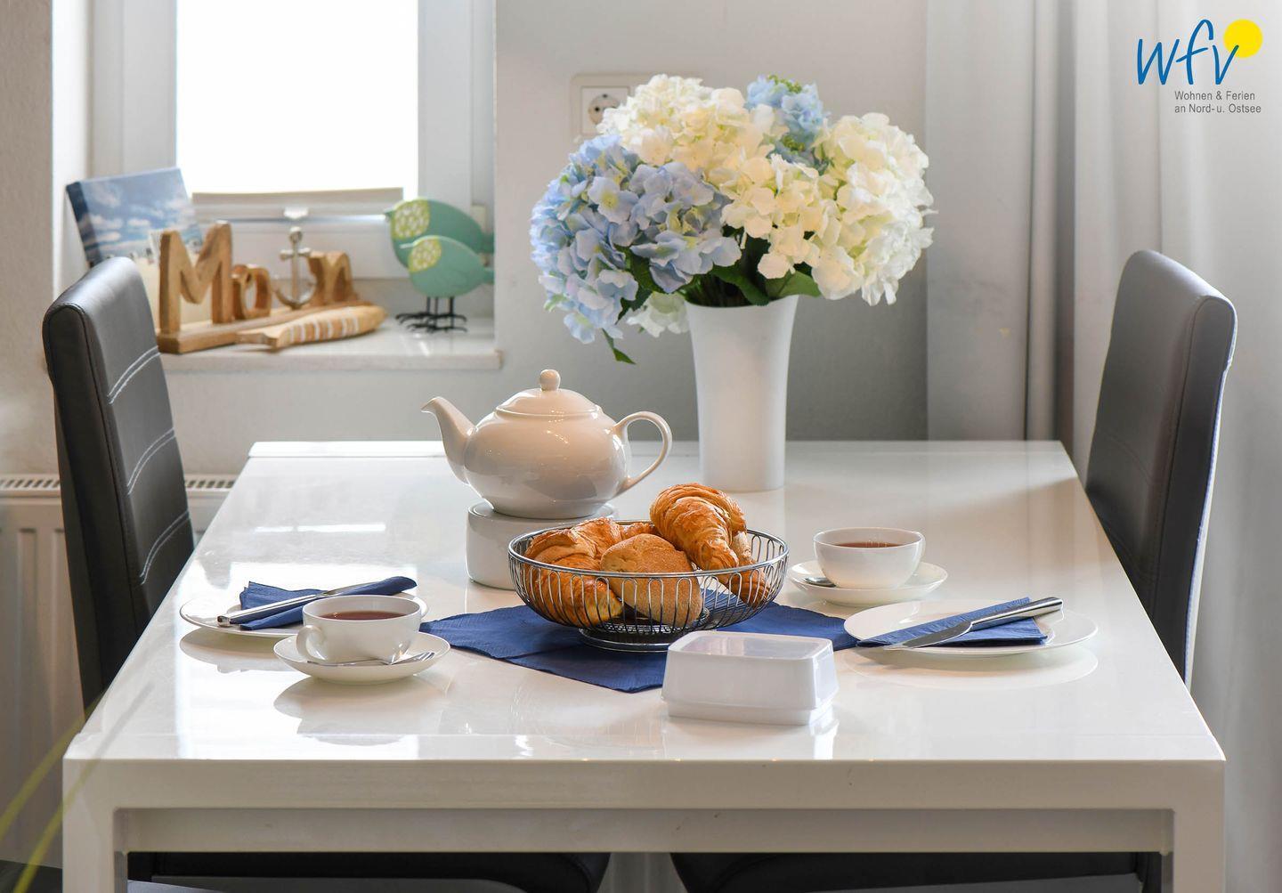 Die Ferienwohnung besticht durch ihr modernes und zugleich gemütliches Ambiente. Liebevolle maritime Accessoires sorgen für die persönliche Note. Der helle offene Wohnbereich lädt mit einer Sofaecke und einem Essbereich zum Entspannen nach dem ereignisreichen Urlaubstag ein. Ein modernes TV mit DVD-Player sorgt für Unterhaltung, zudem empfangen Sie kostenlos freies WLAN.