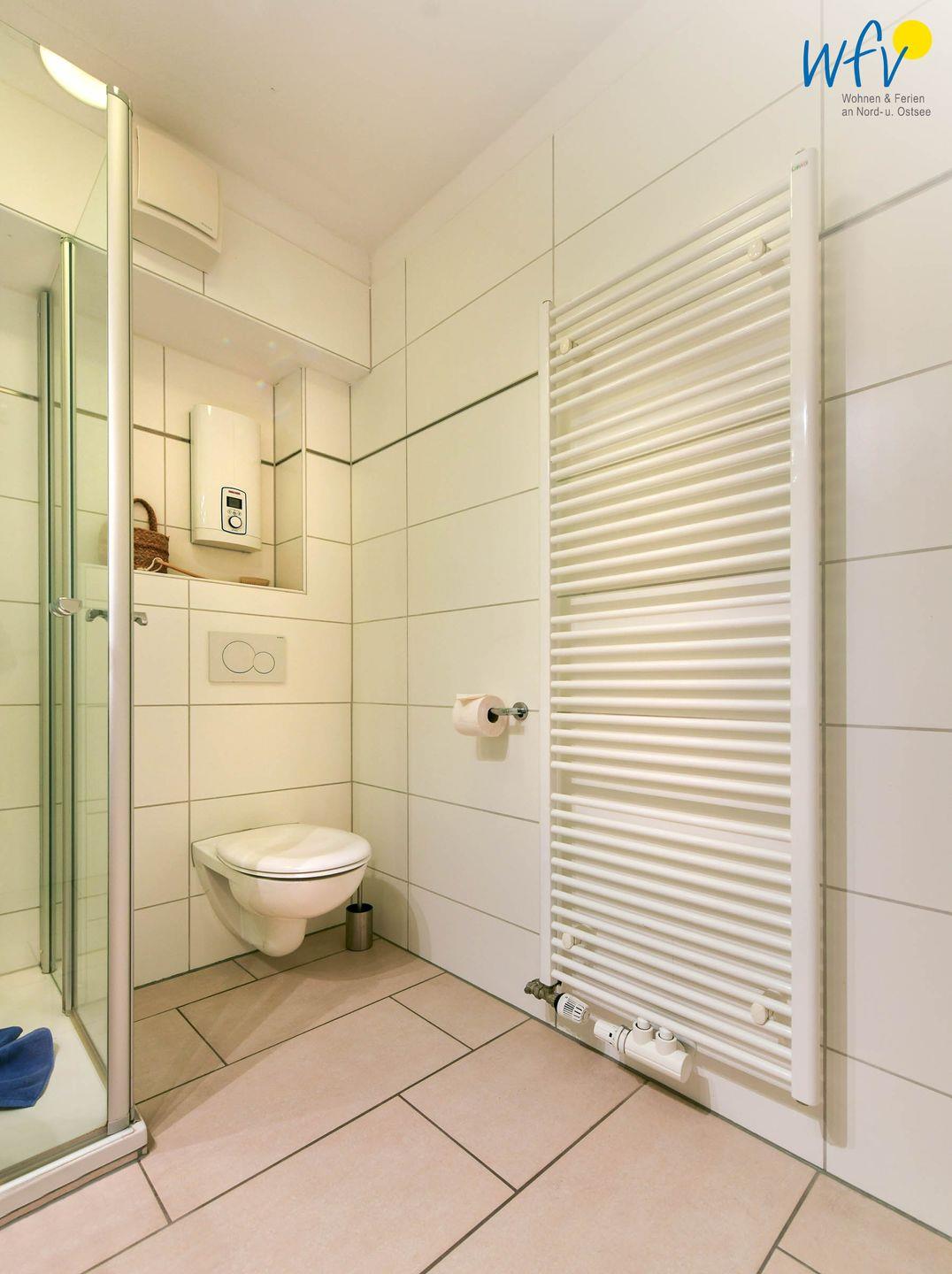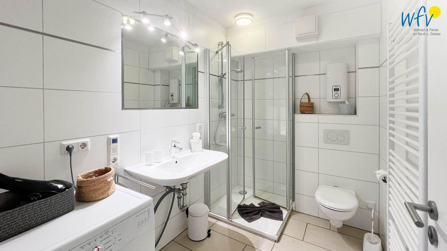 Weiteren Wohnkomfort bietet Ihnen das moderne Badezimmer mit Dusche, Handtuchheizung, Haartrockner und großem Spiegel. Hier steht Ihnen außerdem eine Waschmaschine zur Verfügung.