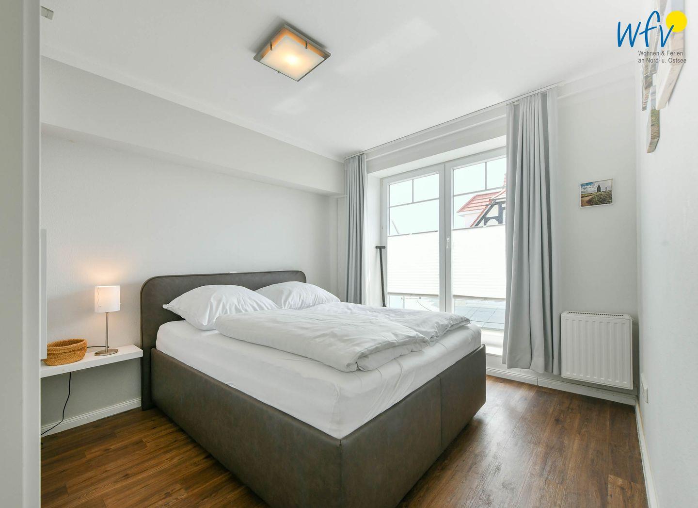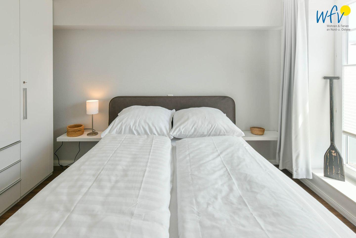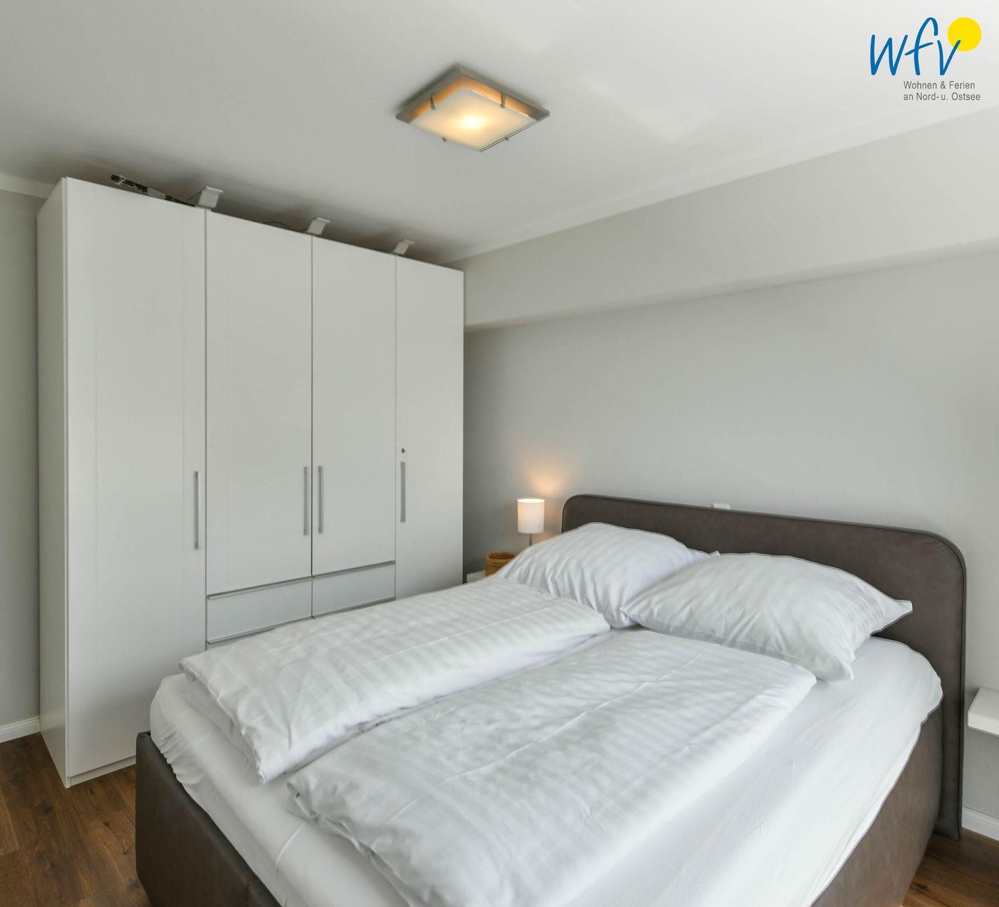 Das separate Schlafzimmer ist mit einem Boxspringbett und einem geräumigem Kleiderschrank komfortabel und geschmackvoll eingerichtet und sorgt für eine angenehme Nachtruhe. Zwei weitere Schlafplätze bestehen durch das Sofa im Wohnbereich, das sich schnell und einfach zur Schlafcouch umwandeln lässt (140 x 200 cm). Ein Kinderbett für unsere kleinsten Gäste ist vorhanden.