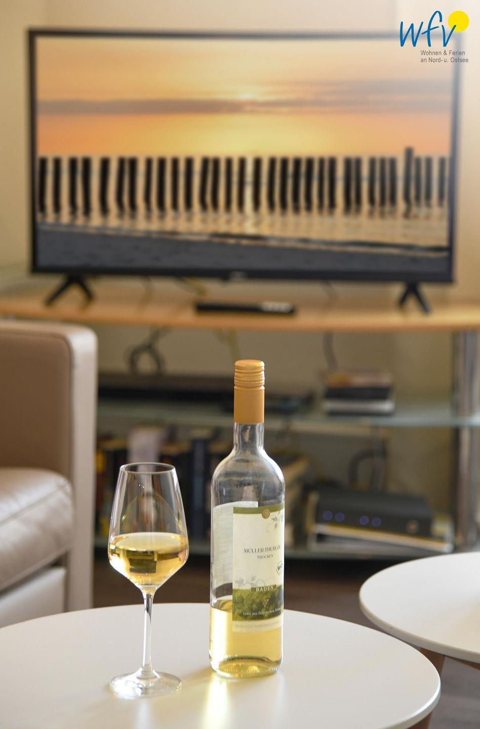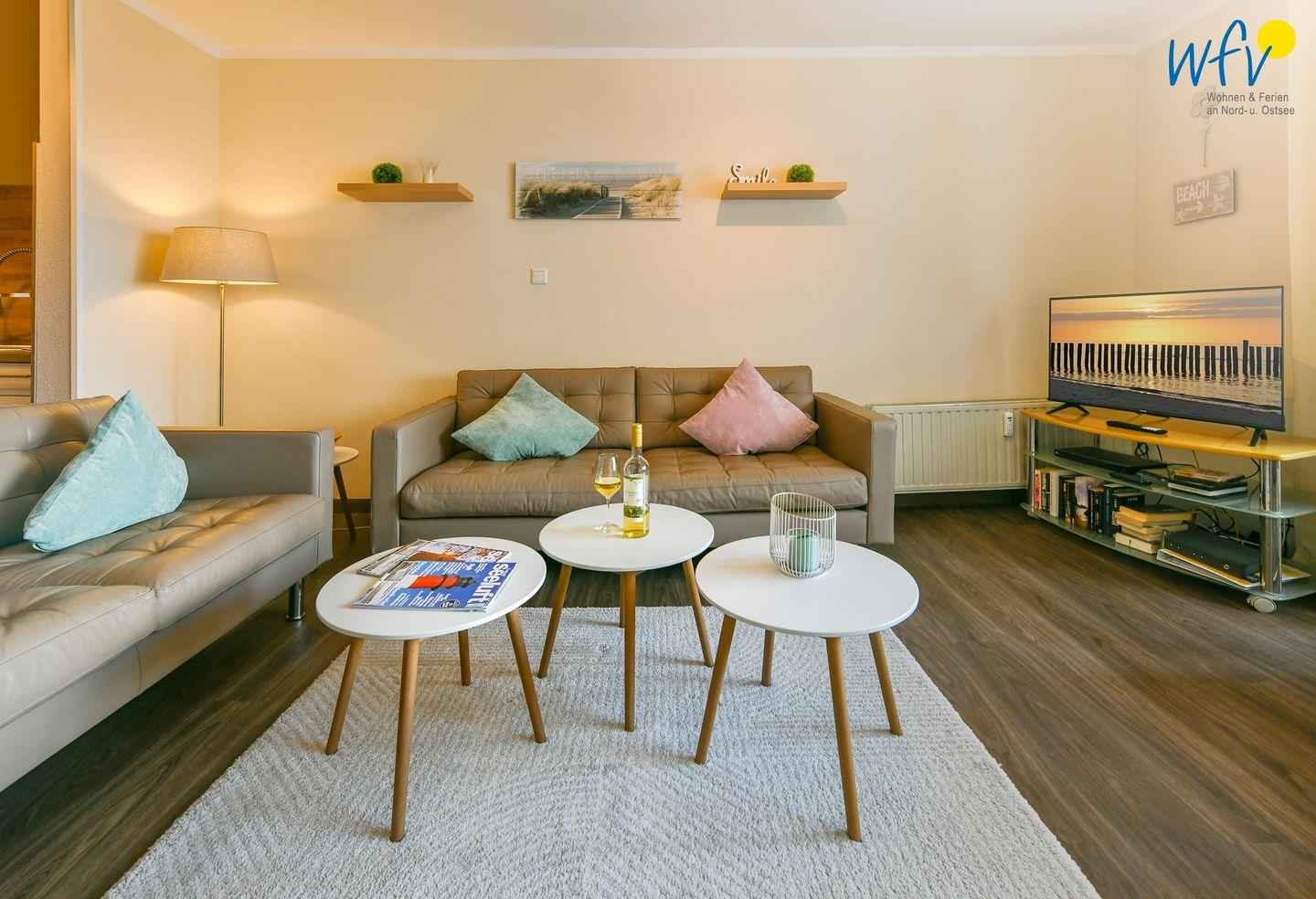 Zur Entspannung nach dem Strandtag oder der Wattwanderung lädt der helle Wohnraum mit großer Sofaecke sowie TV und DVD-Player ein. Aus den vorhandenen CD`s und DVD`s können Sie Ihre Lieblingsmusik und -filme aussuchen und es sich rundum gemütlich machen. Zum Surfen vom eigenen Smartphone oder Laptop empfangen Sie kostenlos freies WLAN.