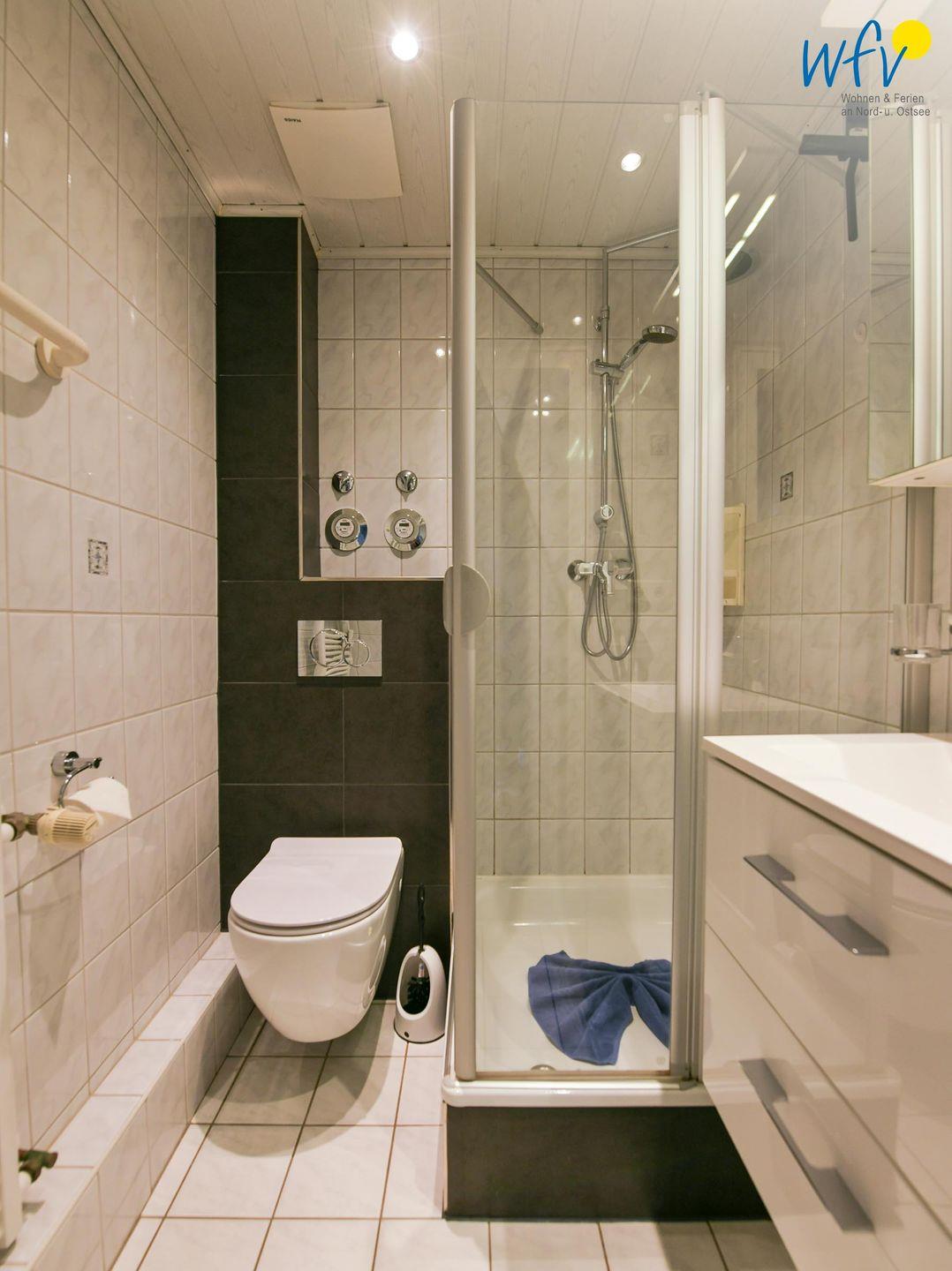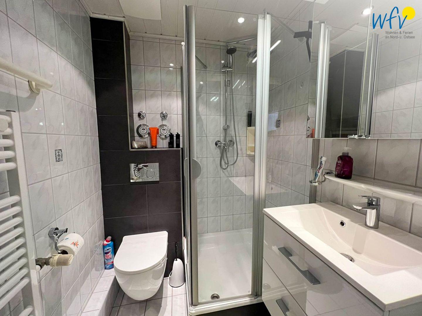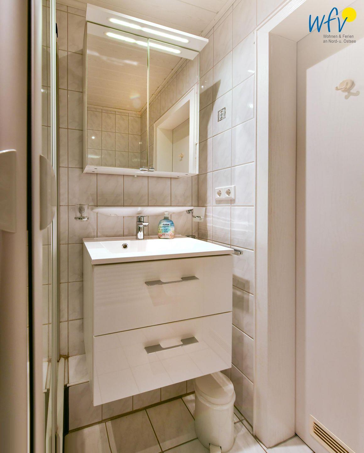 Für zusätzlichen Wohnkomfort sorgt das elegante Badezimmer mit Dusche, Waschtisch, Spiegelschrank, Föhn und Handtuchheizung.