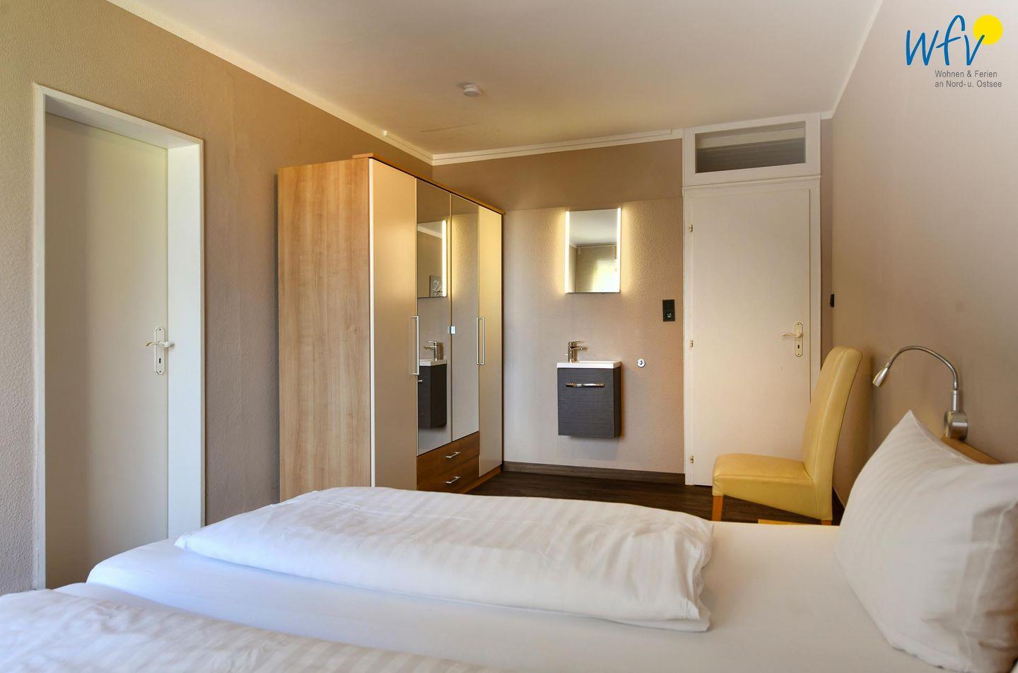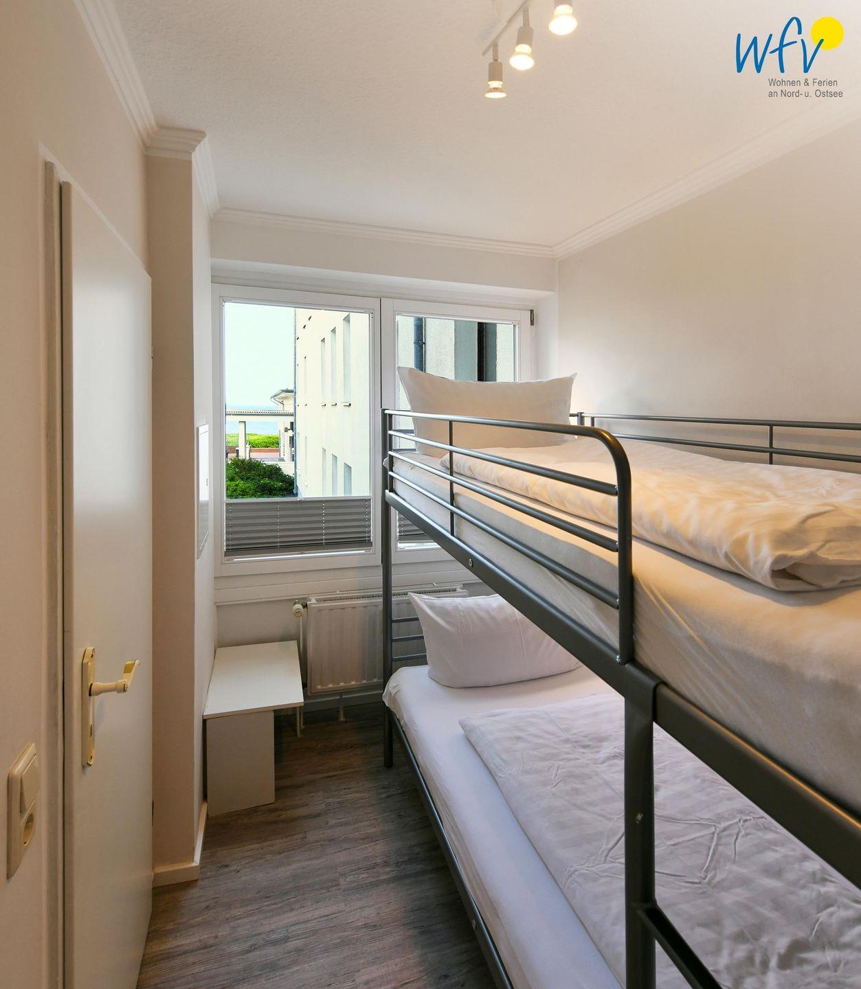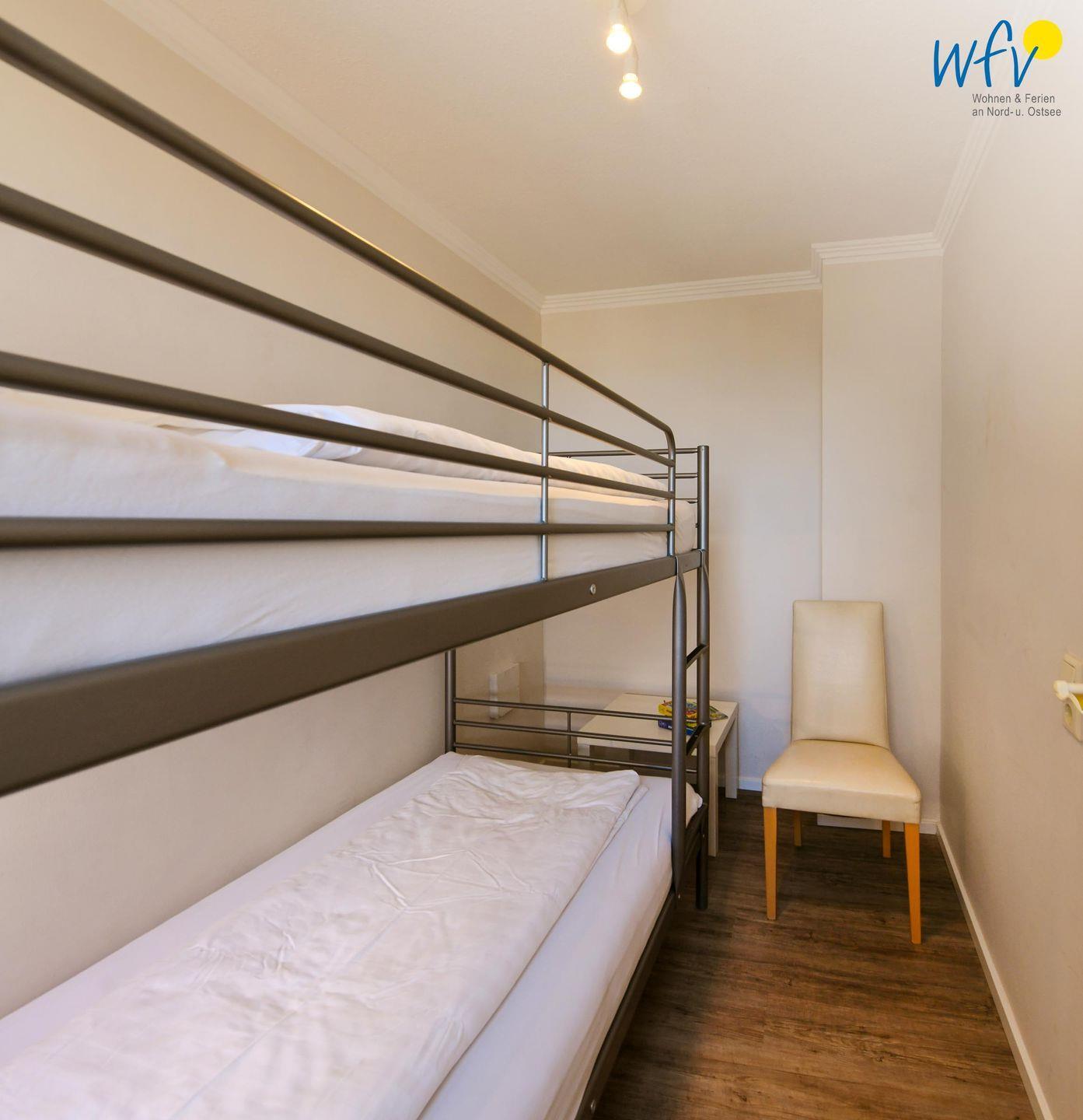 Wenn auf Wangerooge die Sonne untergeht, bieten Ihnen die zwei separaten Schlafzimmer einen wohligen Rückzugsort. Eines der Schlafzimmer ist mit einem Doppelbett ausgestattet (180 cm x 200 cm), das andere mit einem Etagenbett. Auch von diesen Räumen aus haben Sie einen schönen Meerblick. Zwei weitere Personen finden auf einem gemütlichen Schrankbett Platz, welches ganz einfach zur Schlafmöglichkeit ausgeklappt werden kann (140 cm x 200 cm).