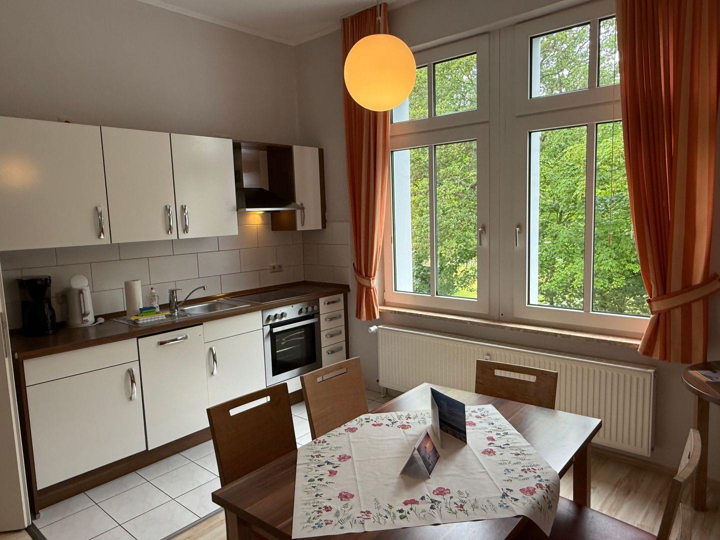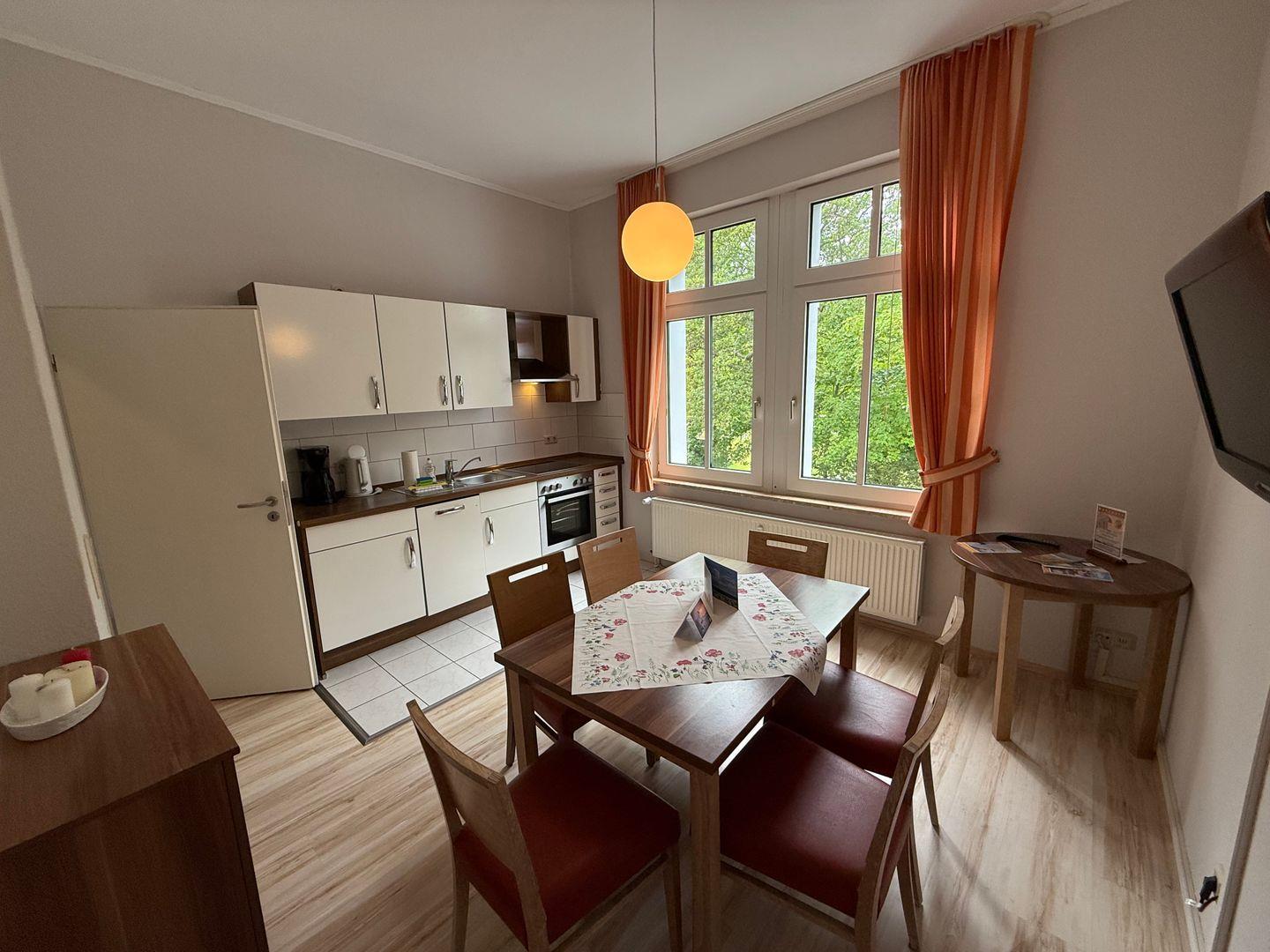 Die geschlossene Küche mit gemütlichem Esstisch ist vollständig ausgestattet und ermöglicht eine bequeme Selbstverpflegung. Hier finden Sie neben Ceranherd und Backofen auch einen Kühlschrank, eine Spülmaschine, Wasserkocher und Kaffeemaschine sowie diverse Küchenutensilien, Geschirr, Besteck und Geschirrhandtücher.
