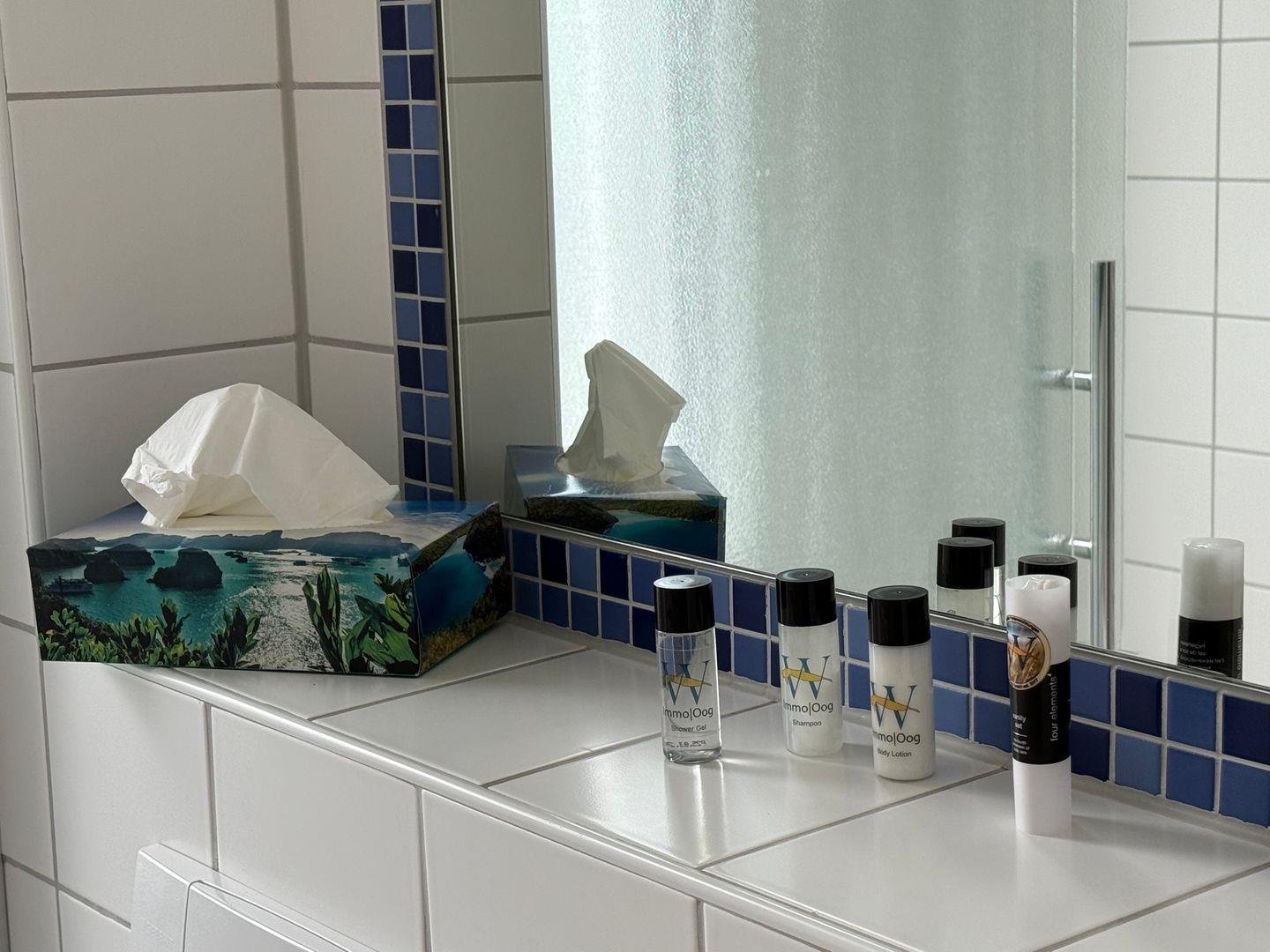 Das Badezimmer ist mit einer Dusche, WC, Waschbecken, Haartrockner, Kosmetikspiegel sowie einem Fenster ausgestattet. Für weiteren Komfort sorgen ein Spiegel und ein Ganzkörperspiegel im Eingangsbereich. Ein Rauchmelder sorgt für zusätzliche Sicherheit.