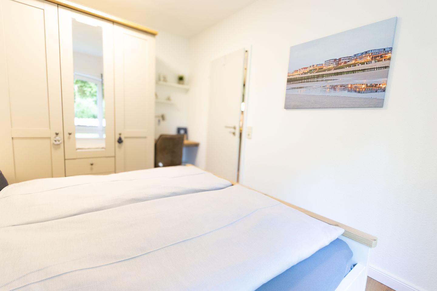 Im Schlafzimmer sorgt nicht nur ein bequemes Bett für Ruhe, sondern auch ein Schreibtisch – ideal fürs Home Office oder das Schreiben der Urlaubspostkarten.