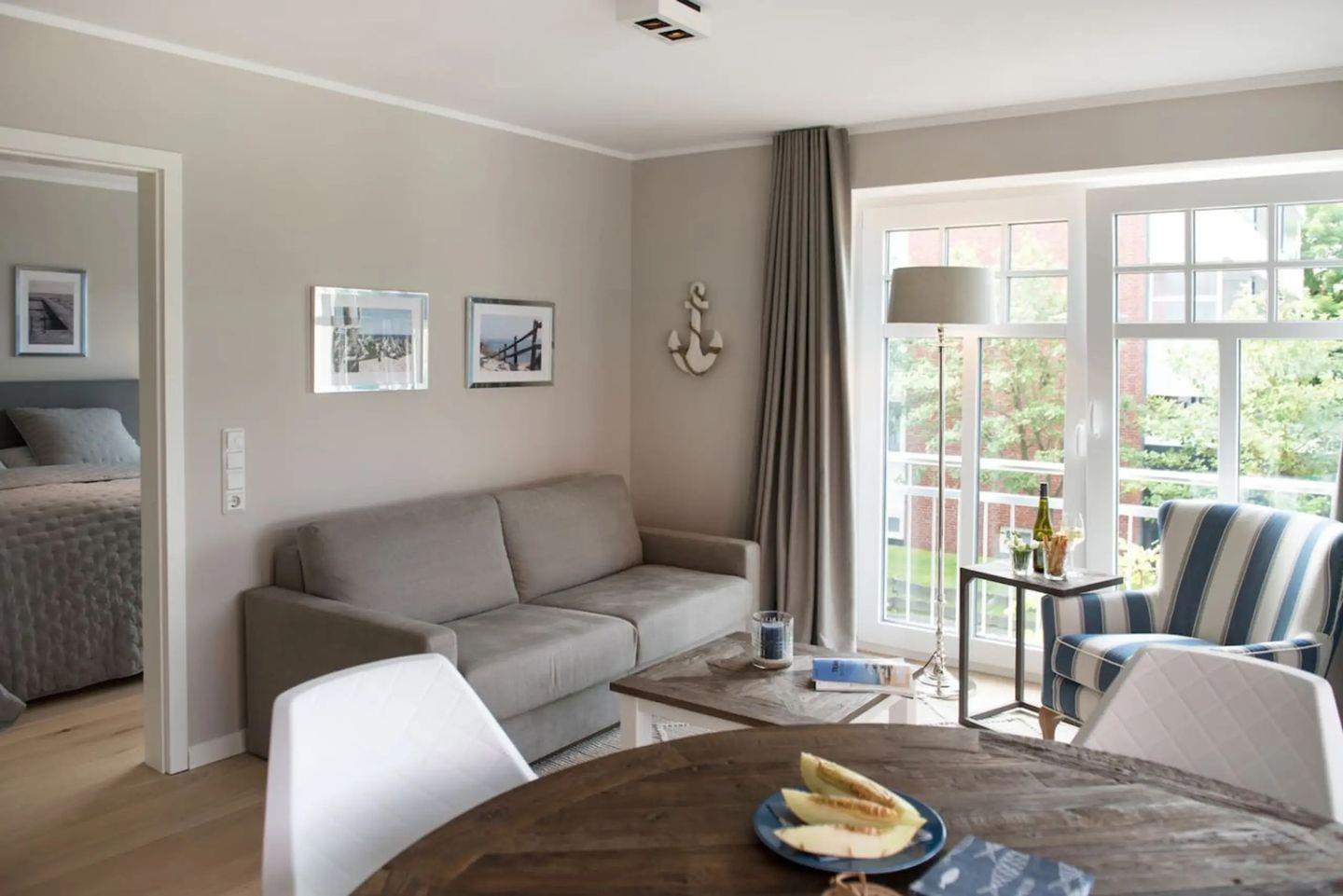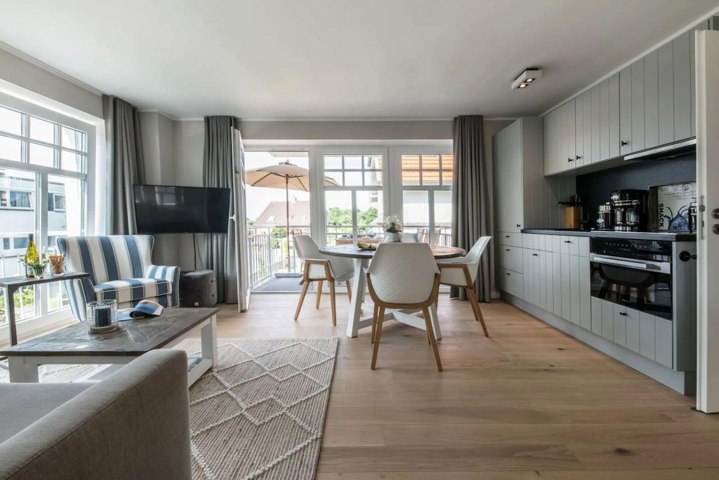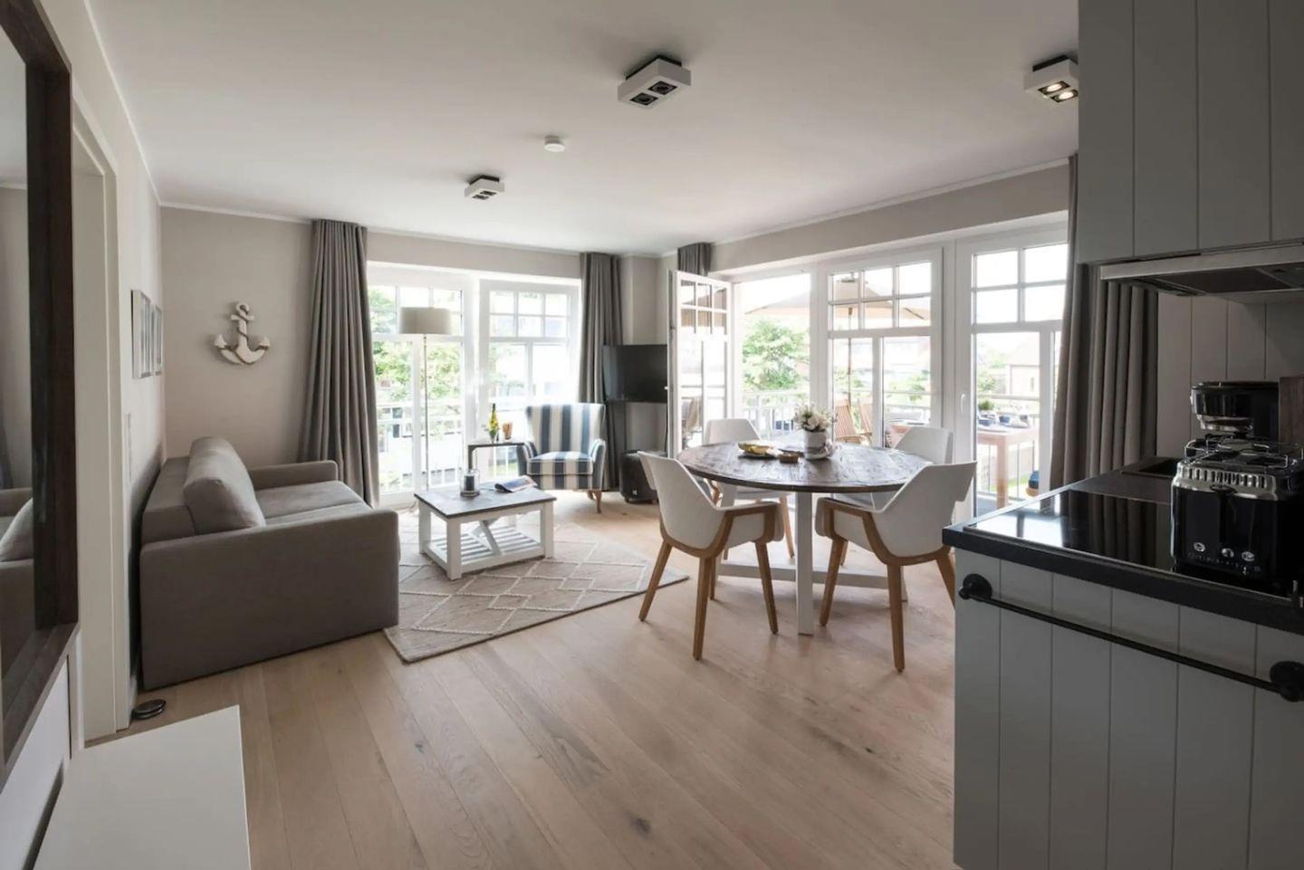 Moderne Ferienwohnung Meertied auf Wangerooge mit Balkon, Fußbodenheizung und WLAN, ideal für entspannte Urlaubstage.