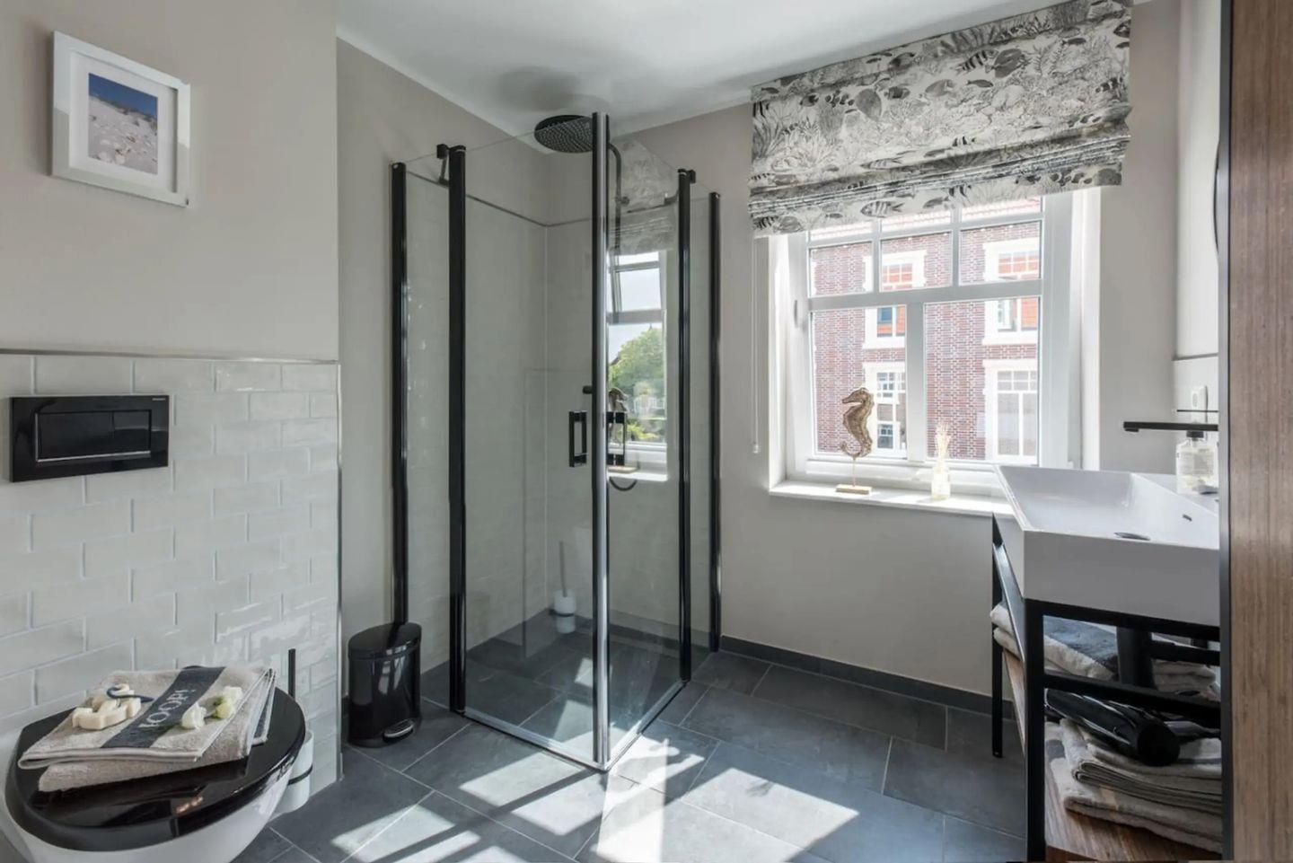 Das moderne Badezimmer ist mit einer bodengleichen Dusche sowie einem Fenster ausgestattet. Ein Haartrockner steht ebenfalls zu Ihrer Verfügung. Für den längeren Aufenthalt bieten Waschmaschine und Trockner zur Eigennutzung sowie ein Wäscheständer hohen Komfort. Stauraum schaffen Garderobe, Schuhschrank, Kommode und weitere Möbelstücke.