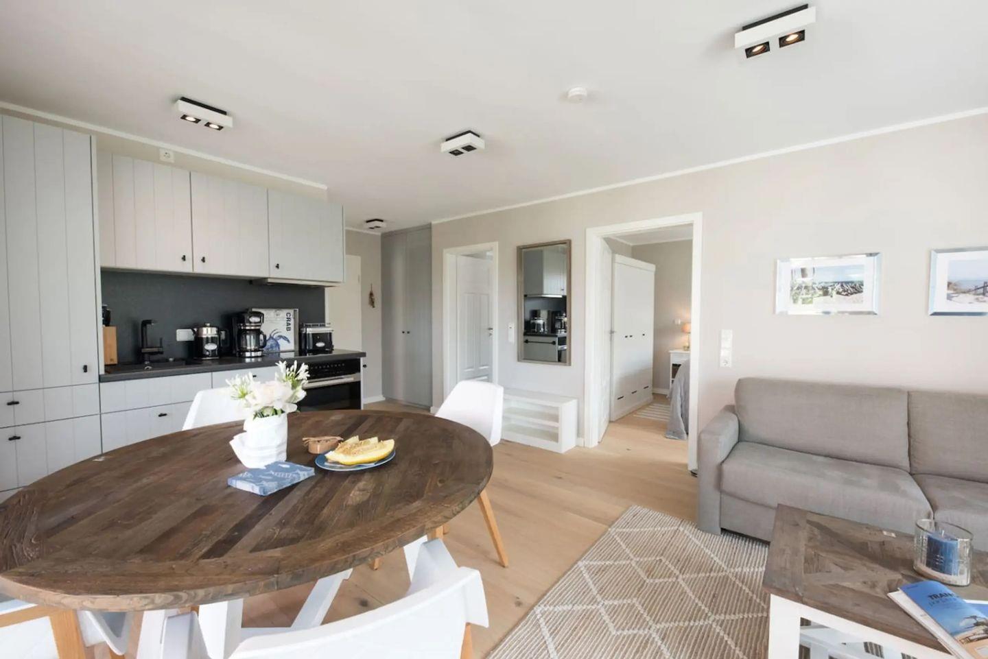 Mit insgesamt drei Zimmern, darunter zwei separate Schlafzimmer und ein einladendes Wohnzimmer, ist ausreichend Platz für bis zu drei Schlafmöglichkeiten geboten. Das offene Raumkonzept verbindet die moderne Küche und den gemütlichen Wohnbereich, wodurch eine freundliche und helle Atmosphäre entsteht. Die Küche ist mit hochwertigen Geräten wie Ceranherd, Backofen, Mikrowelle, Geschirrspüler, Kühlschrank mit Gefrierfach, Wasserkocher, Toaster, Mixer und Kaffeemaschine vollständig ausgestattet. Sämtliche Küchenutensilien sowie Geschirr, Besteck und Geschirrhandtücher sind selbstverständlich vorhanden. Sie finden ebenso einen Essbereich mit Esstisch und komfortablen Sitzgelegenheiten.