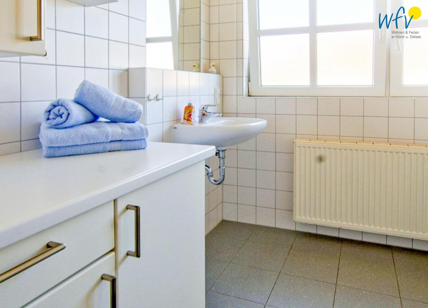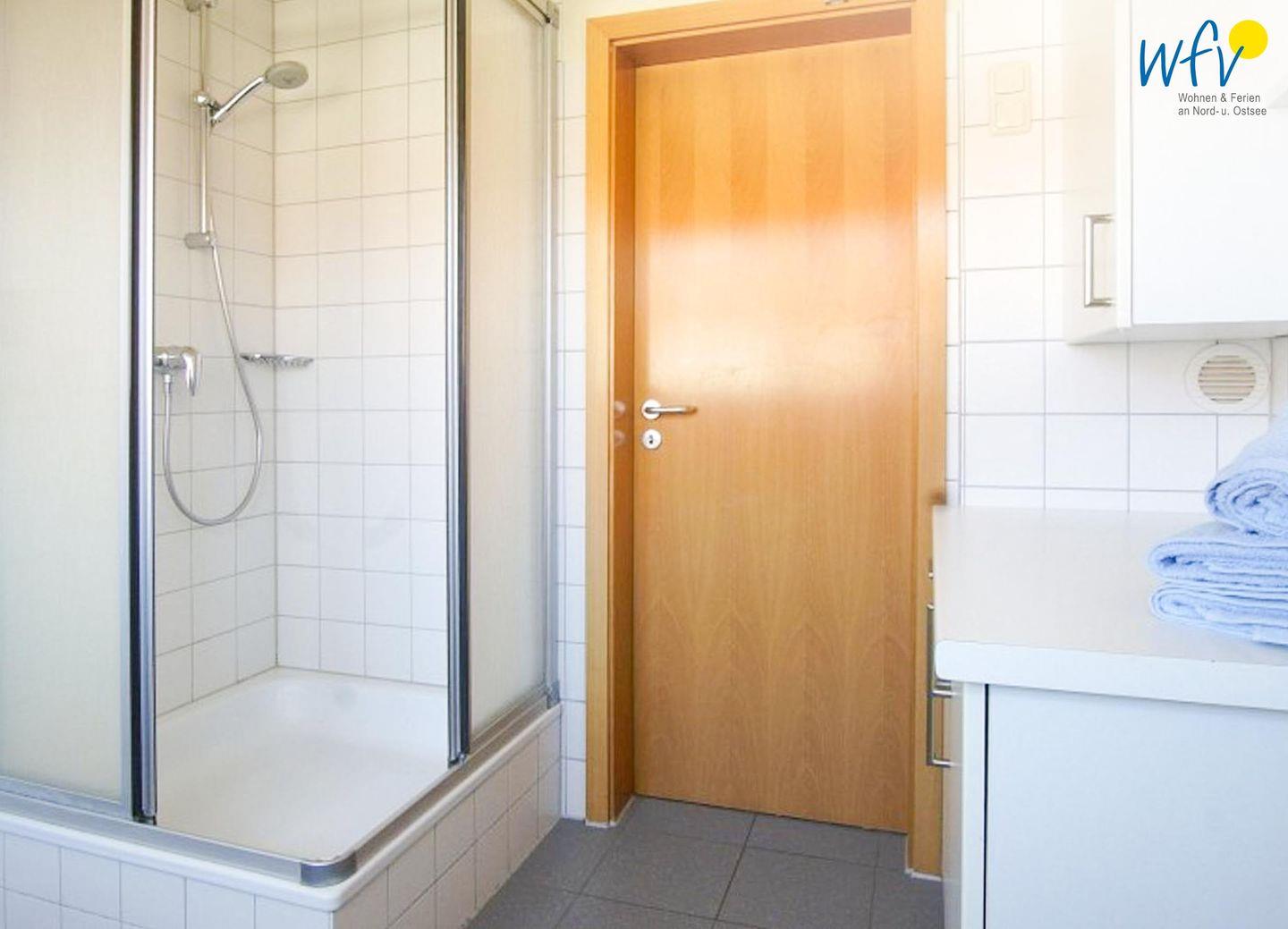 Das gepflegte Tageslichtbad mit Dusche ergänzt den Wohnkomfort.