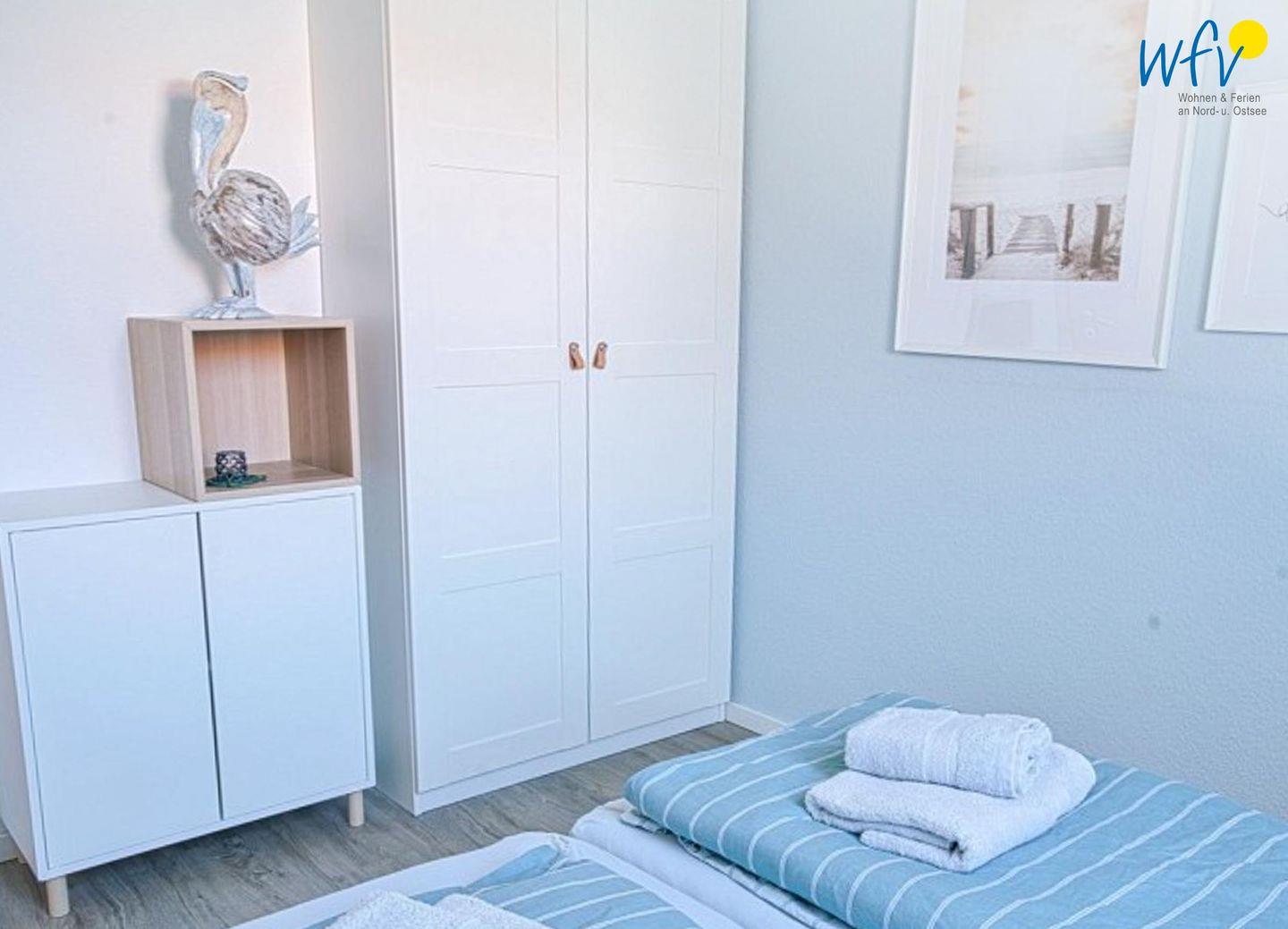 Zwei separate Schlafzimmer bieten Ihnen angenehme Rückzugsmöglichkeiten. Eines befindet sich auf der ersten Etage und verfügt über ein Doppelbett (160 x 200 cm) und ein TV. Das zweite Zimmer liegt im OG und ist mit zwei Einzelbetten eingerichtet (je 100 x 200 cm).