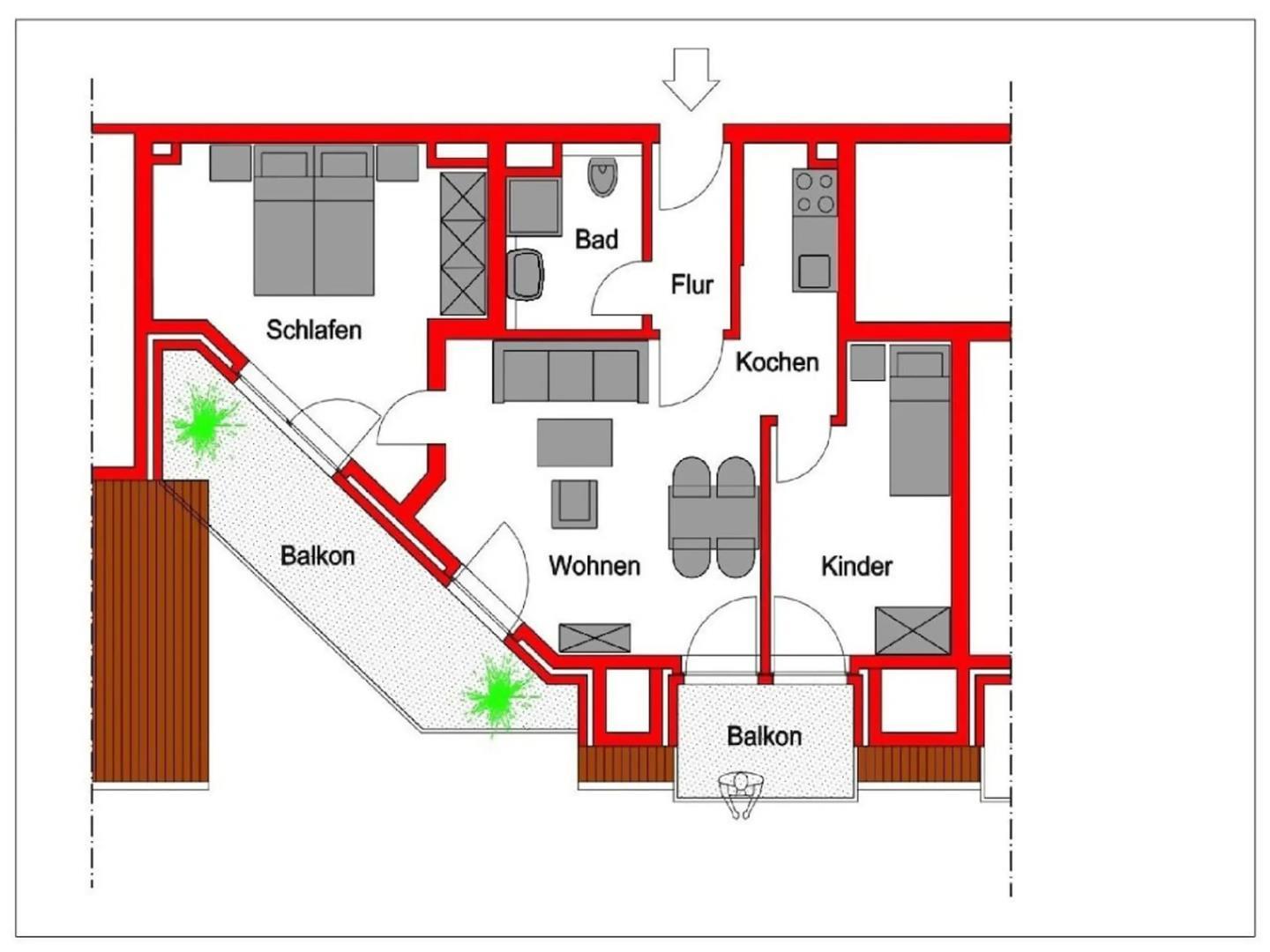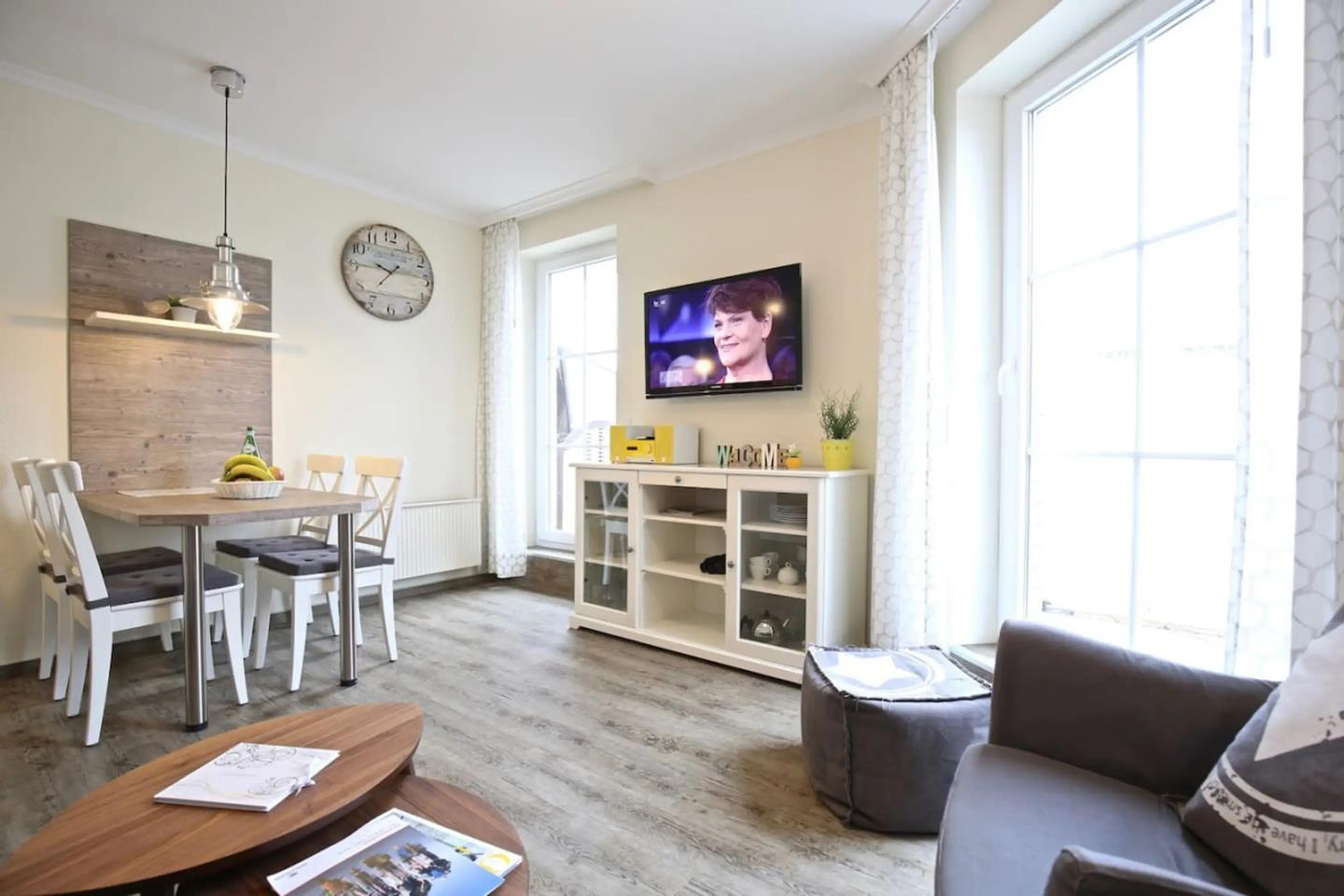 Die Wohnung verfügt über insgesamt drei geschmackvoll eingerichtete Zimmer, darunter zwei separate Schlafzimmer. Dank der sorgfältigen Raumaufteilung finden sowohl Eltern als auch Kinder ausreichend Privatsphäre und Erholungsmöglichkeiten. Der offene Wohn- und Essbereich bildet das Herzstück der Unterkunft: Hier können Sie in der gemütlichen Sofaecke entspannen oder bei gemeinsamen Mahlzeiten als Familie oder mit Freunden zusammenkommen. Ergänzt wird der Wohnbereich durch einen eigenen Esszimmerbereich, der zu geselligen Stunden oder einem ausgiebigen Frühstück einlädt.