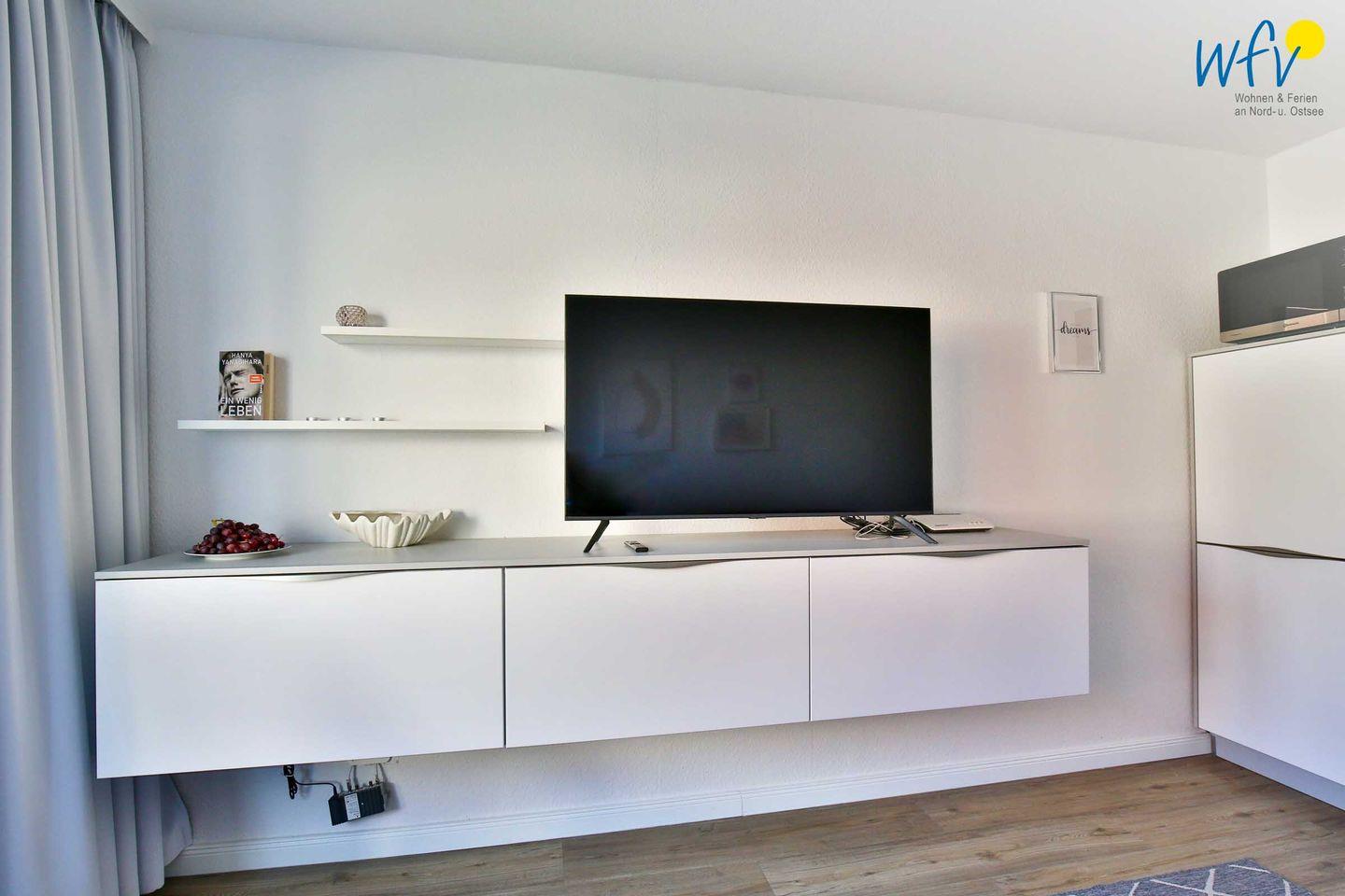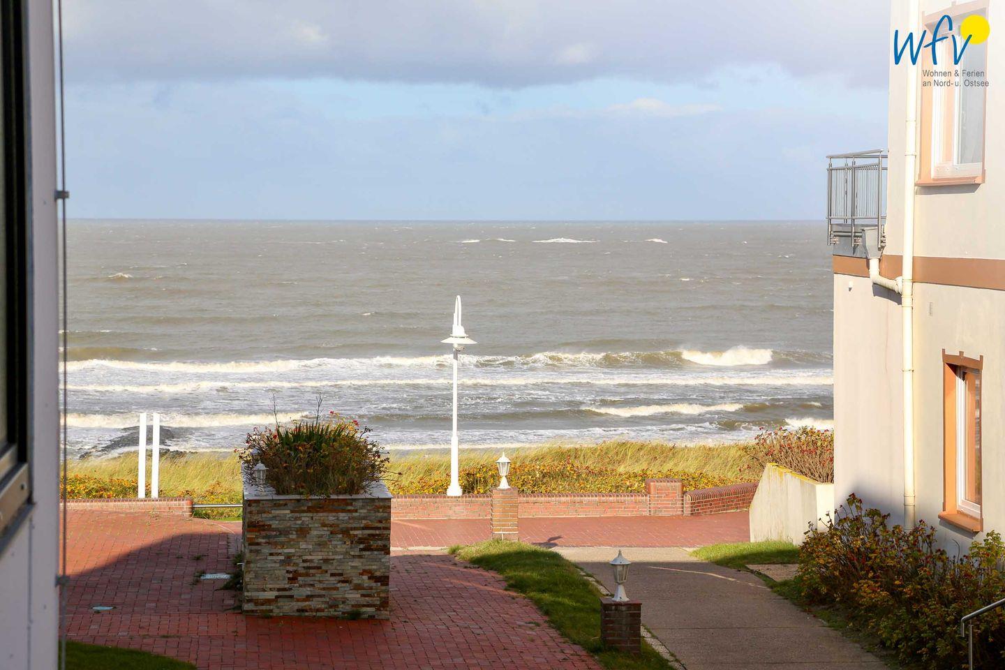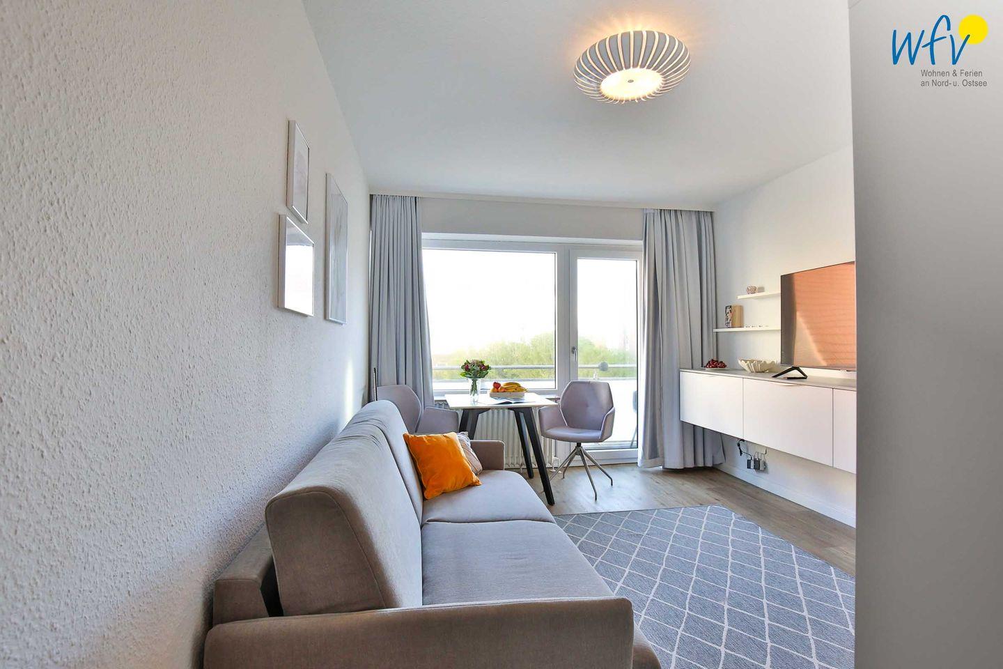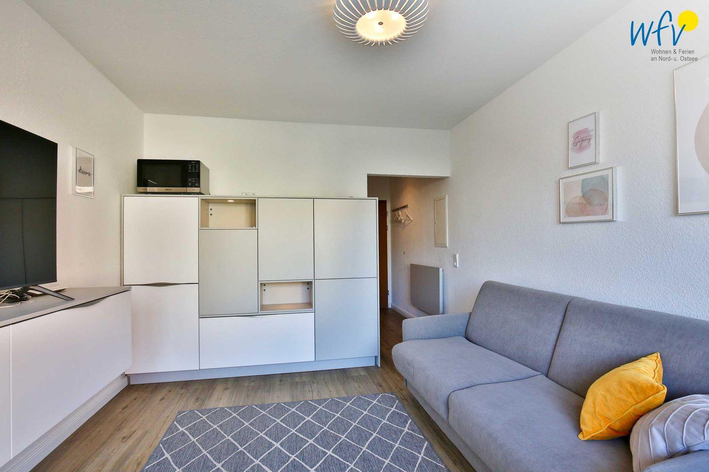 In dem Ein-Raum-Appartement empfängt Sie eine helle und freundliche Einrichtung, die zum Wohlfühlen einlädt. Durch die nach Osten ausgerichtete Fensterfront ist die Wohnung lichtdurchflutet, sodass Sie besonders beim morgendlichen Frühstück die ersten Sonnenstrahlen genießen können. Oder Sie starten auf dem kleinen möblierten Ostbalkon in den Tag - bei Sonne und Meeresrauschen. Von hier aus haben Sie einen sehr schönen seitlichen Meerblick!
