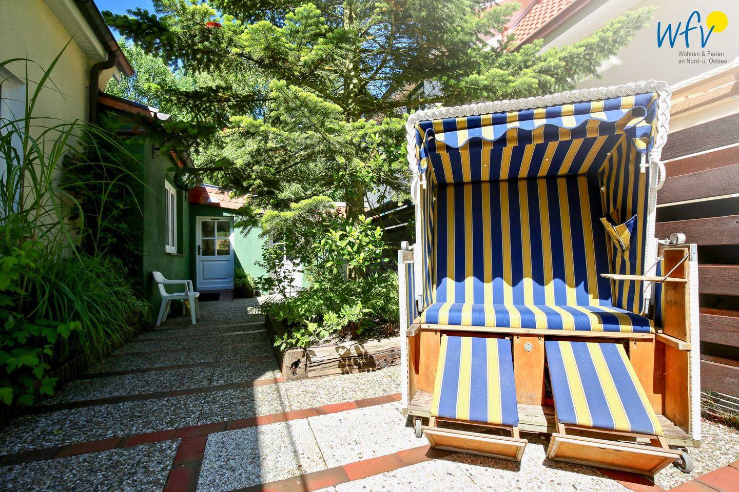 Auch der hübsche Außenbereich vor dem Haus bietet Gelegenheit zur Entspannung. Hier lädt eine gemeinschaftliche Sitzecke mit Strandkorb und Sonnenschirm zum Wohlfühlen ein - inklusive warmer Sonnenstrahlen und frischer Nordseeluft. Ihre Kinder dürfen gerne im angrenzenden Garten spielen.