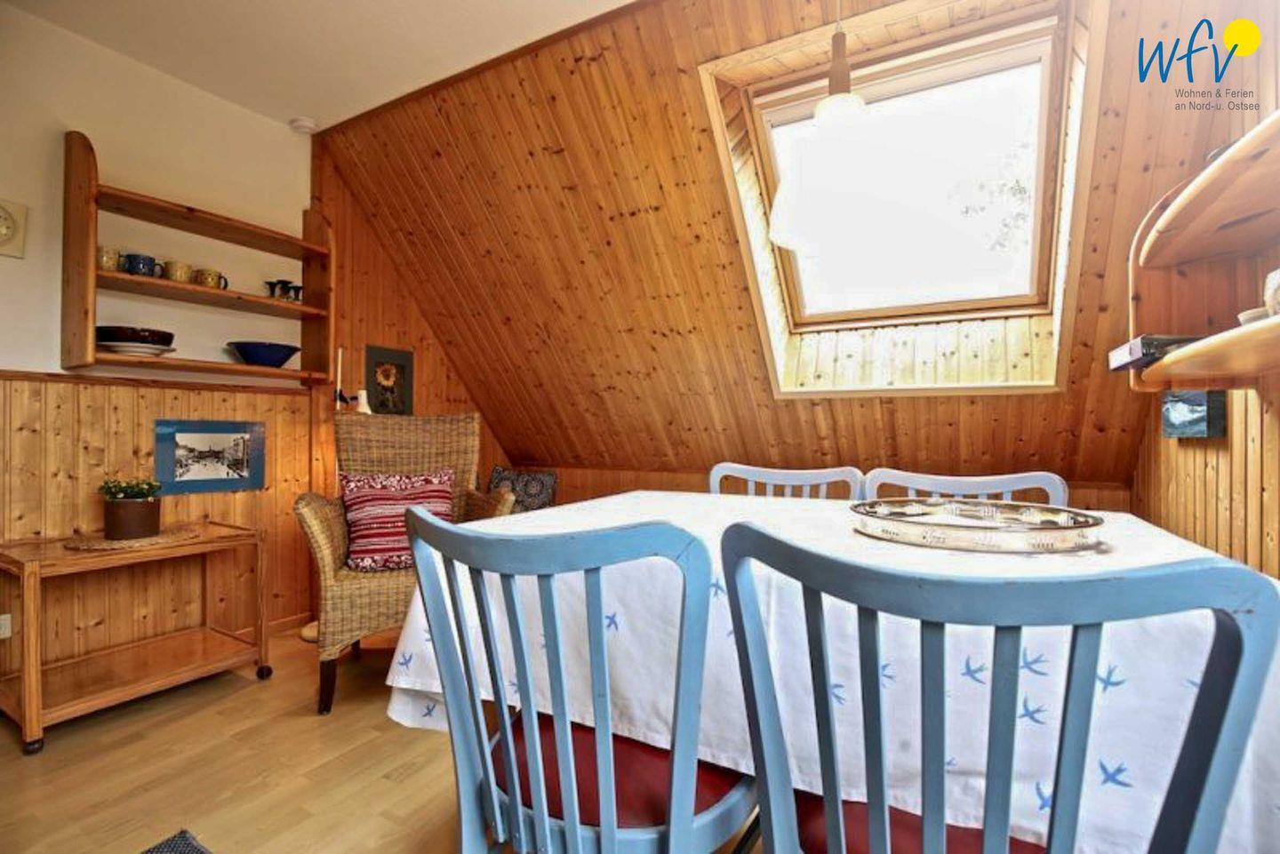 Warme Frühstücksbrötchen, kleine Snacks für den Ausflug oder leckere Mahlzeiten lassen sich schnell und einfach in der gut ausgestatteten Küche mit 4-Plattenherd, Backofen, Mikrowelle und Spülmaschine zubereiten. Zudem ist ein Esstisch vorhanden, an dem Sie gemütlich beisammen sitzen, essen und klönen können.