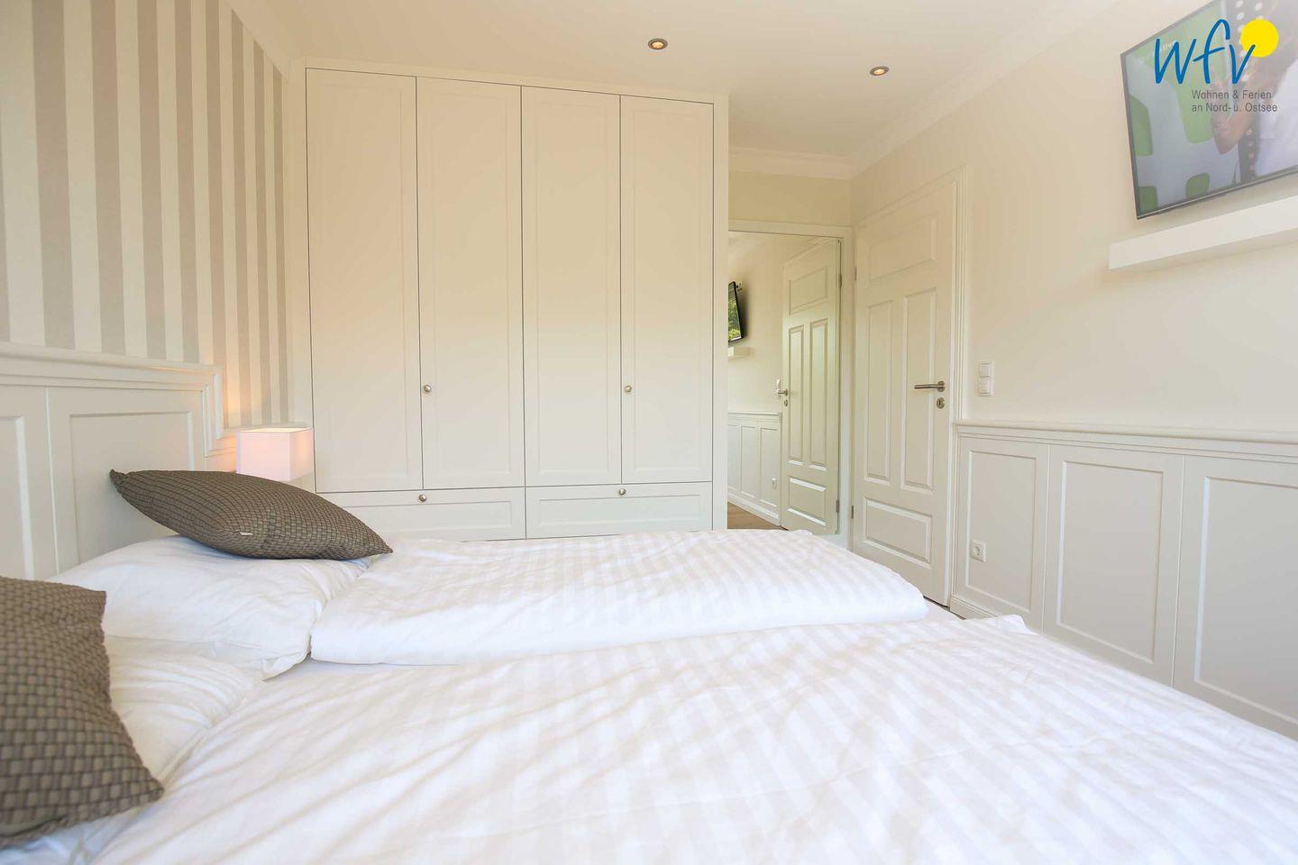 Zwei separate Schlafzimmer bieten angenehme Möglichkeiten zum Rückzug. Das Elternschlafzimmer mit direktem Zugang zum Balkon überzeugt hierbei durch ein bequemes Doppelbett (180 x 200 cm) und einem Kleiderschrank für genügend Stauraum, während das Kinderzimmer mit einem kleinen Doppelbett (160 x 200 cm) und einem Etagenbett für Jugendliche bis 16 Jahren (je 80 x 200 cm) eingerichtet ist. Auch hier bietet ein Kleiderschrank Platz für die Urlaubsgarderobe. In beiden Zimmern können Sie gemütlich fernsehen.