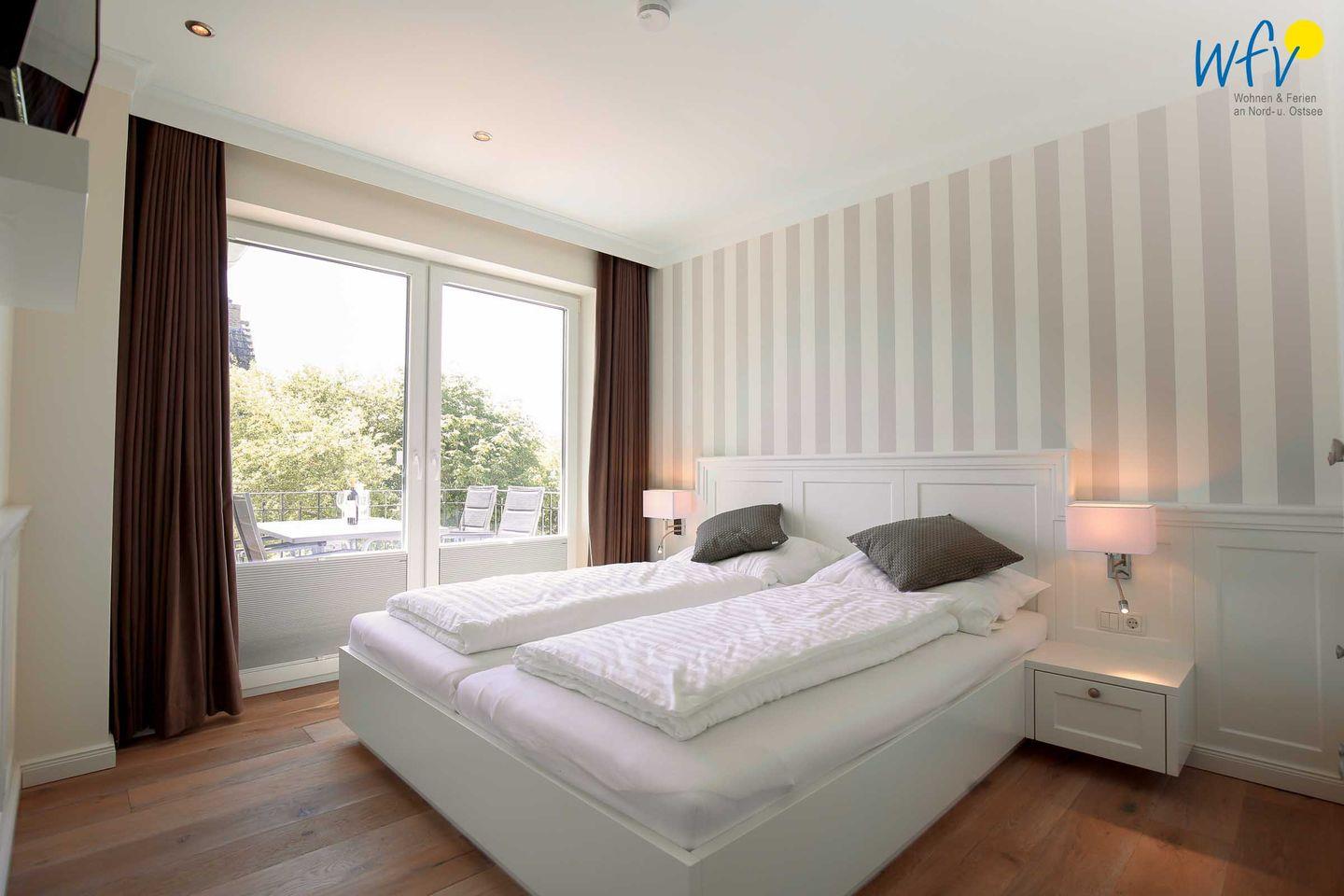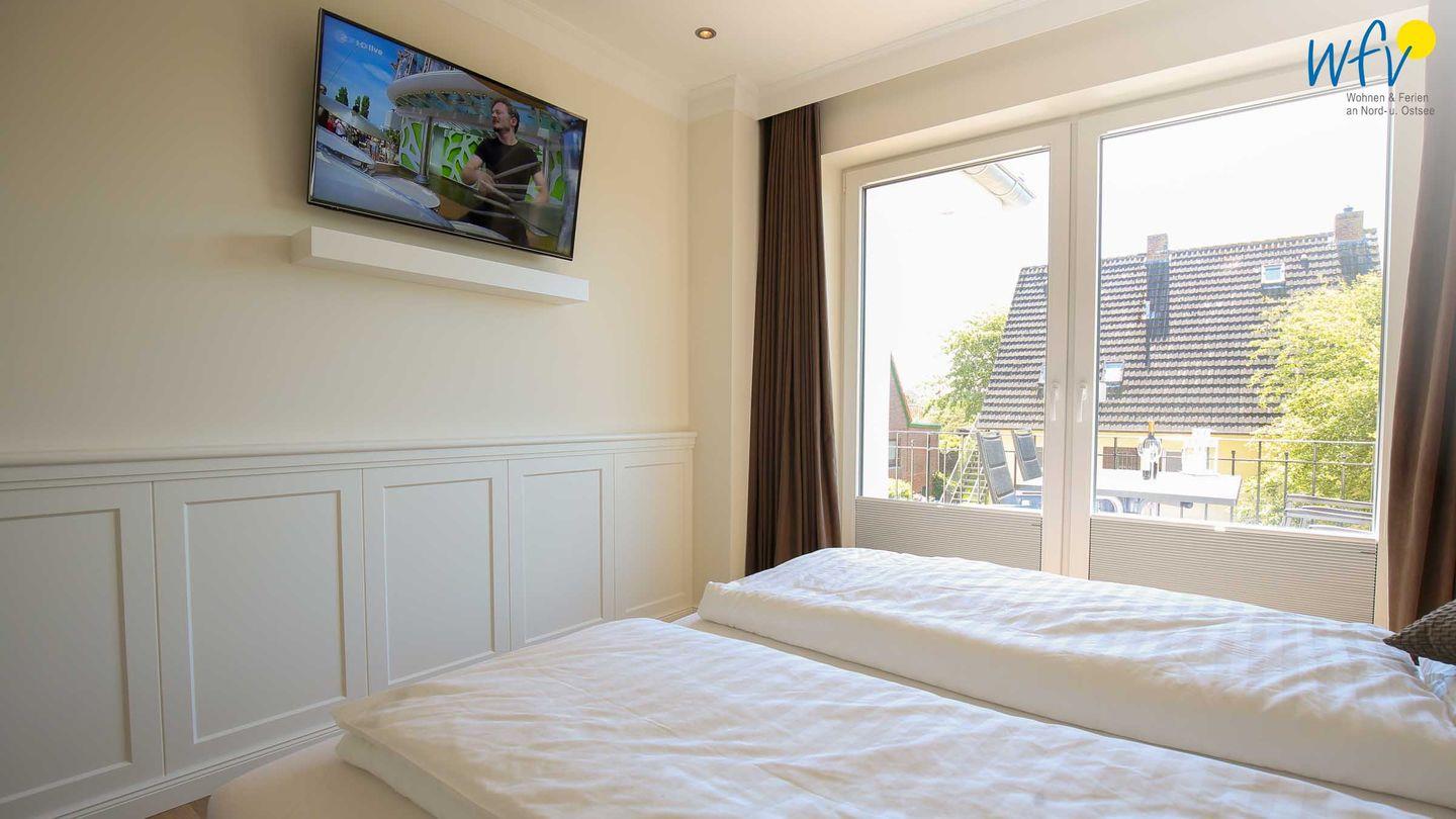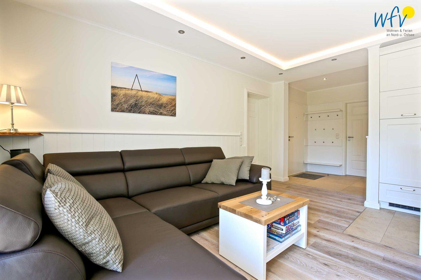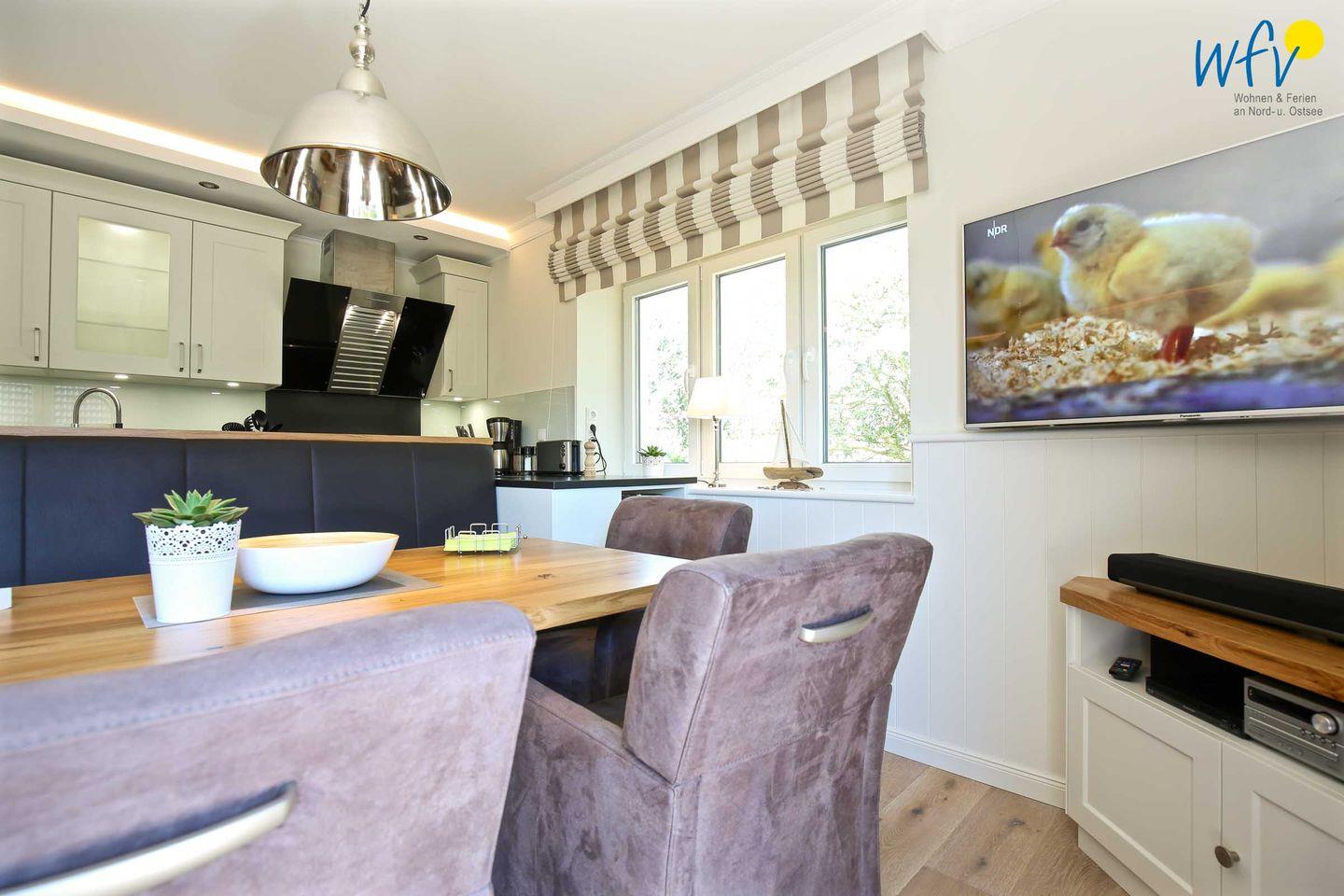 Der helle Lichteinfall, stilvolle Möbel in harmonischer Farbgebung und maritime Accessoires sorgen für schönes Flair und das entsprechende Nordseegefühl. Eine Fußbodenheizung und charmante Holzdielen bieten zusätzlichen Wohnkomfort und an kühleren Tagen wohlige Wärme. Der Essplatz mit schönem Blick ins Grüne lädt zum ausgiebigen Ferienfrühstück ein, die Couchecke mit moderner Unterhaltungstechnik von Sonos und Panasonic zu gemütlichen Stunden zum Entspannen und die komfortablen Betten in den zwei separaten Schlafzimmern zu erholsamer Nachtruhe.