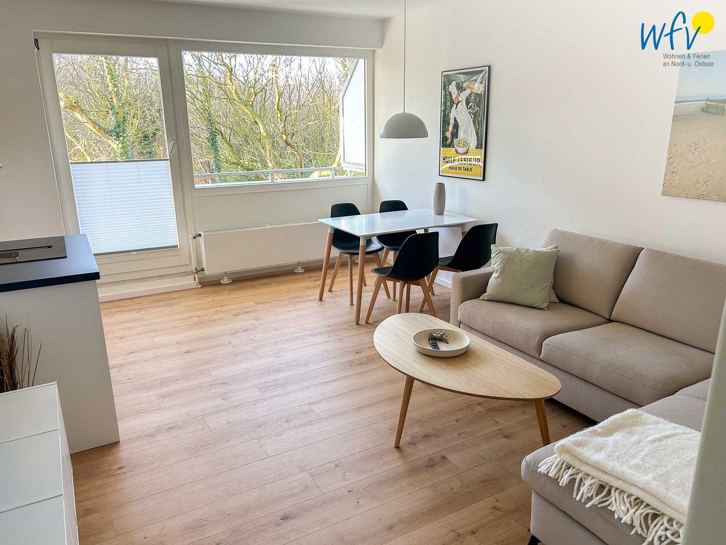 Moderne Ferienwohnung Strandglück auf Wangerooge mit Balkon, nur 290 m vom Strand entfernt, ideal für erholsamen Nordseeurlaub.