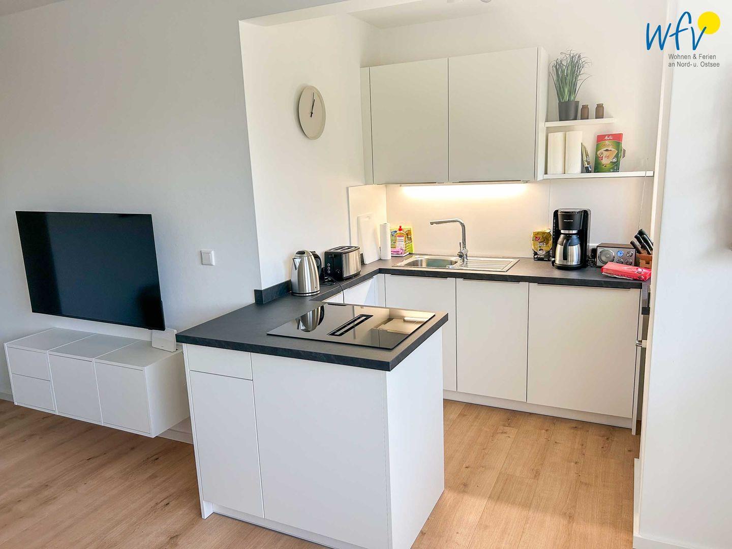 In der modernen offenen Küche lassen sich bequem kleine Snacks für den Ausflug oder leckere Mahlzeiten zubereiten. Ausgestattet ist die Küche u.a. mit einem 4-Zonen-Induktionskochfeld mit integriertem Dunstabzug, einem Geschirrspüler und einem Kühlschrank sowie mit diversen Kleingeräten (Kaffeemaschine, Wasserkocher, Toaster etc.).