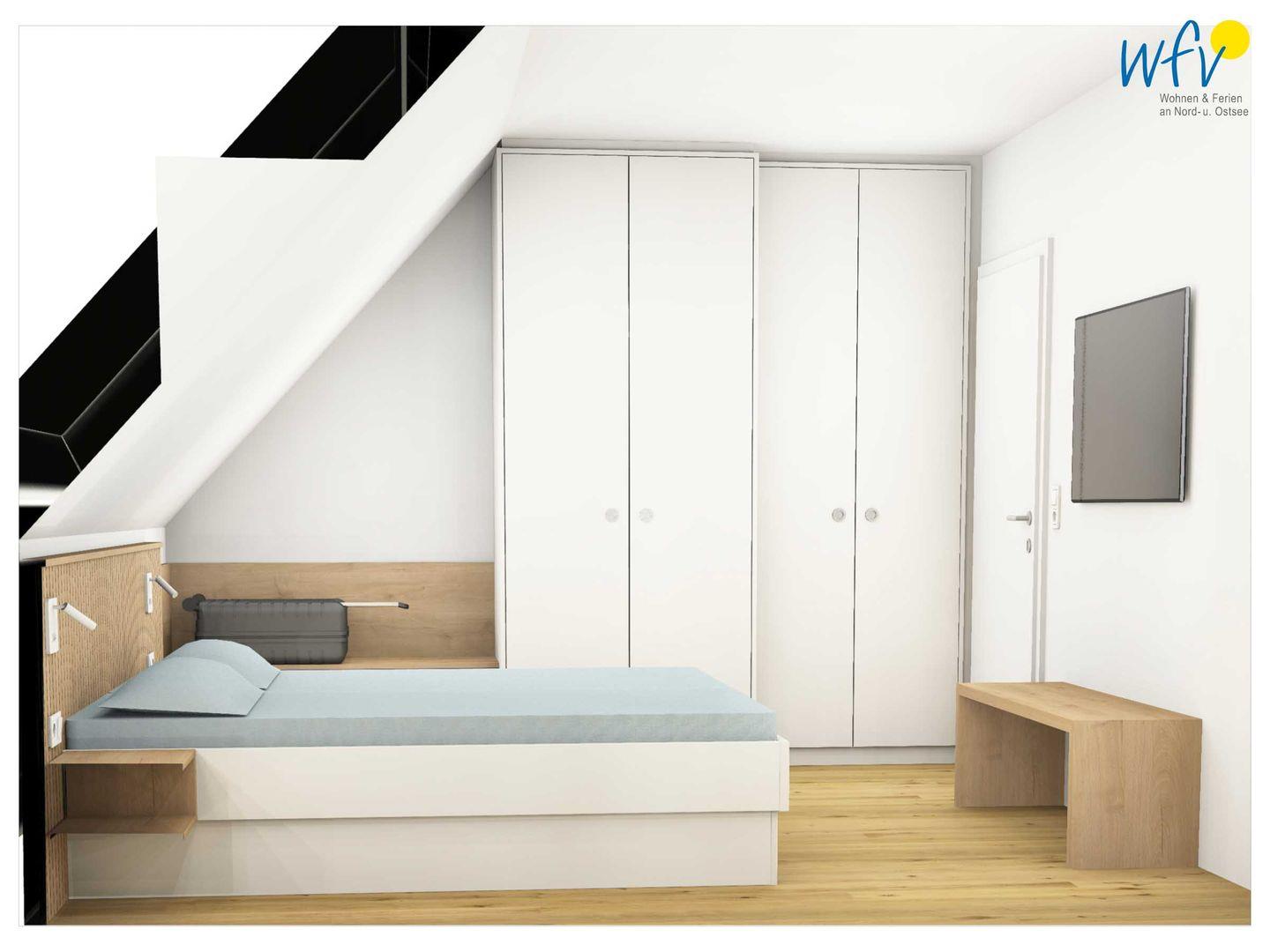 Wenn auf Wangerooge die Sonne untergeht, versprechen zwei separate Schlafzimmer eine angenehme Nachtruhe. Das Schlafzimmer im Dachgeschoss ist mit einem komfortablen Doppelbett eingerichtet, im Spitzboden erwarten Sie zwei Einzelbetten. Geräumige und maßgefertigte Einbauschränke bieten Platz für Ihre Urlaubsgarderobe.