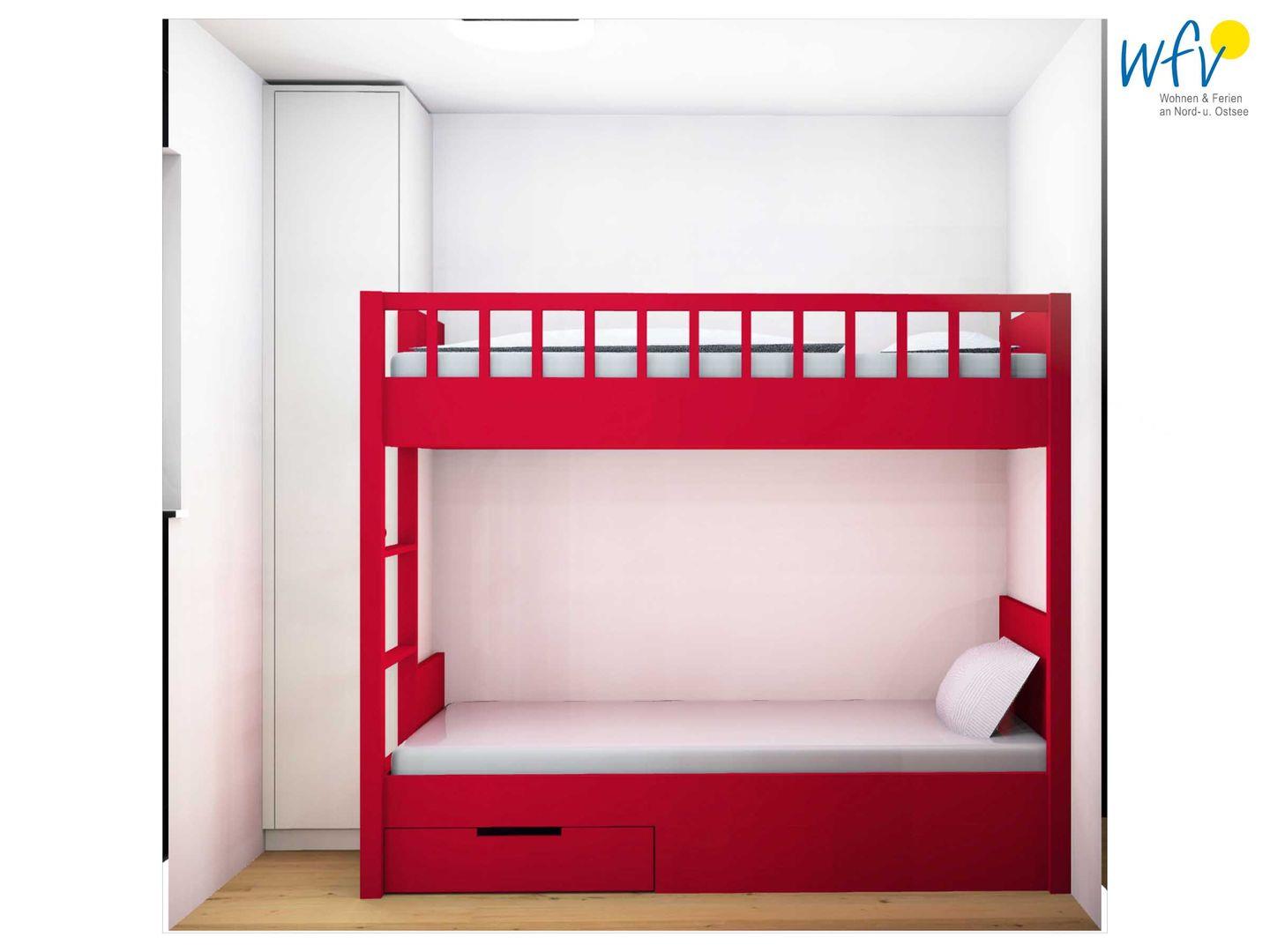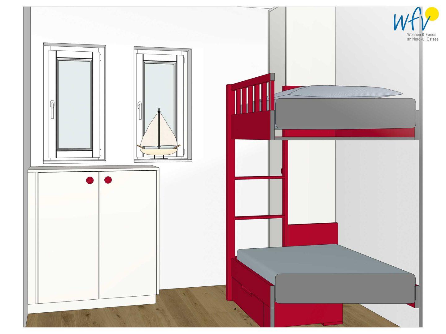 In dem großen und gemütlich eingerichteten Elternschlafzimmer befindet sich ein maßgeschneidertes Doppelbett, ein SmartTV und ein Kleiderschrank für Ihre Urlaubsgarderobe. Das Kinderzimmer mit passgenauem Etagenbett ist ein wunderbarer Wohlfühlort für unsere kleinen Gäste.